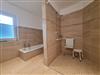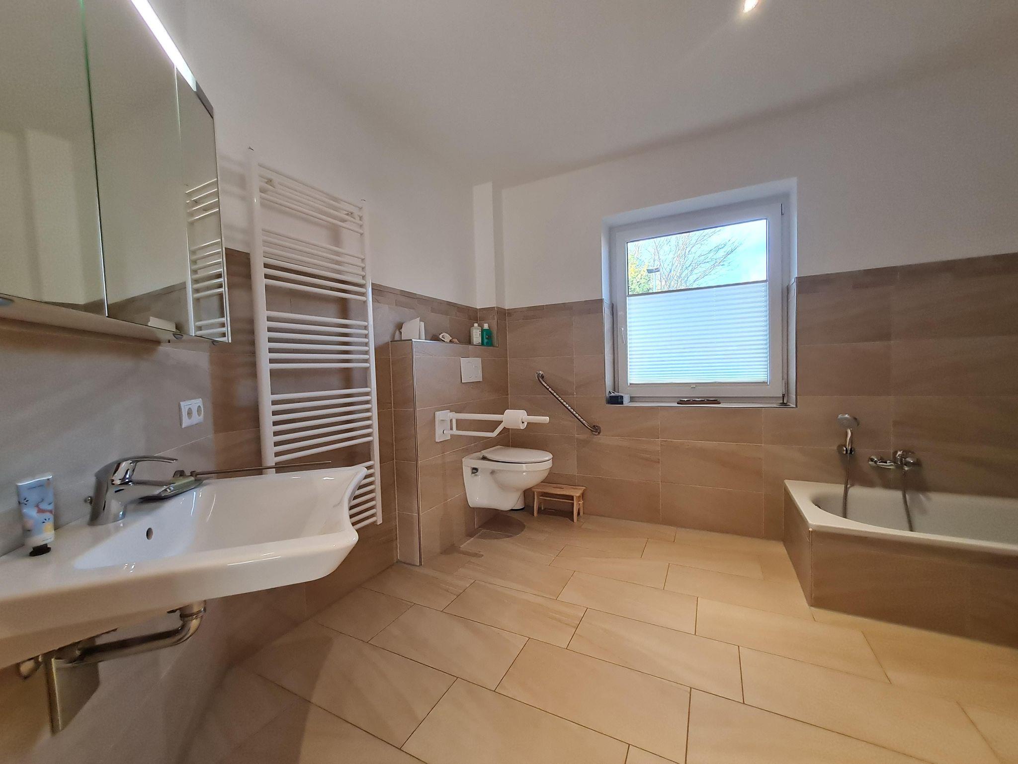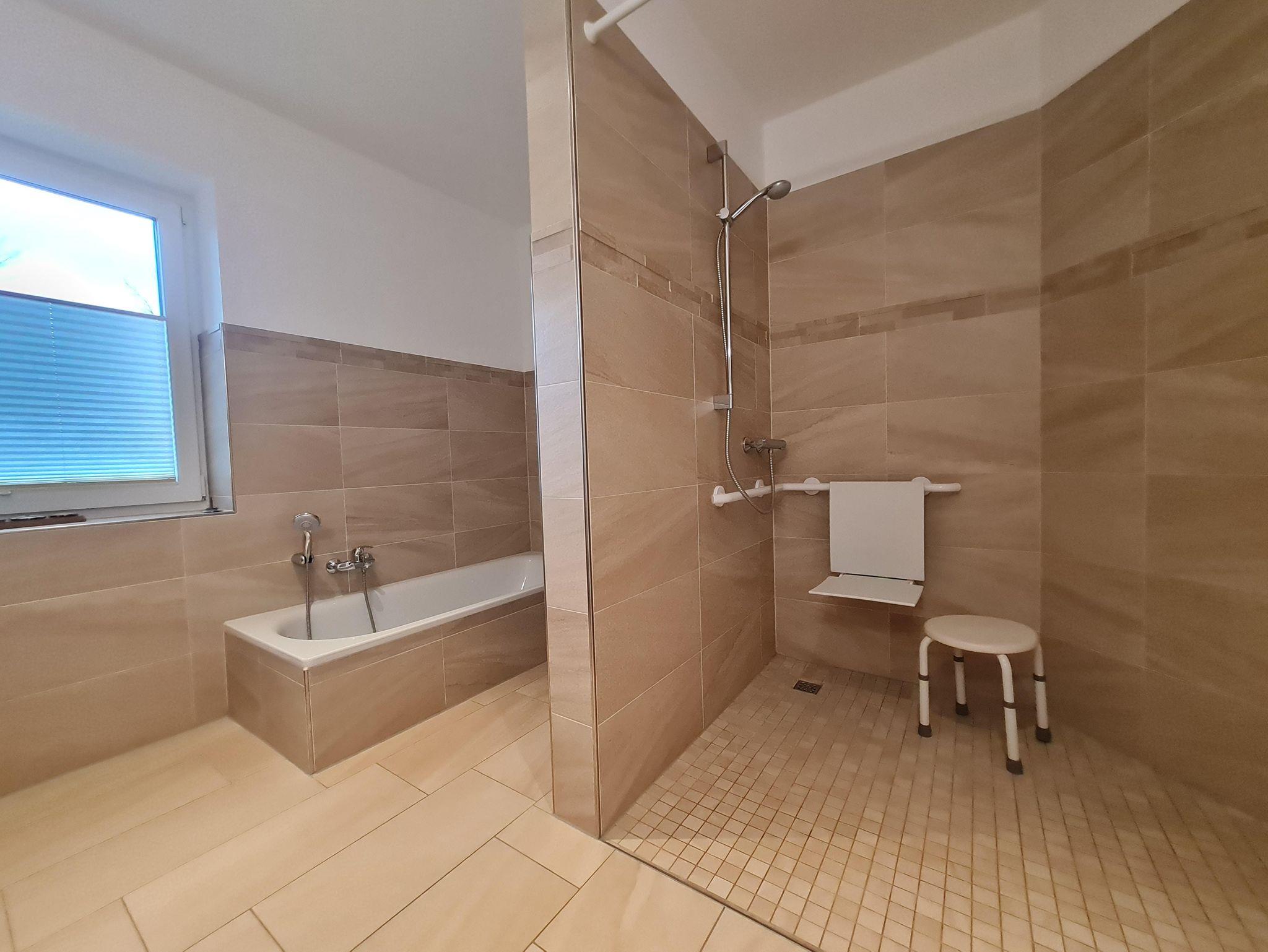 Das Badezimmer verfügt über eine Badewanne sowie eine 1,5 x 1,5 m große Dusche mit Sitzmöglichkeit. Am erhöhten WC finden sich Haltegriffe.