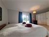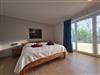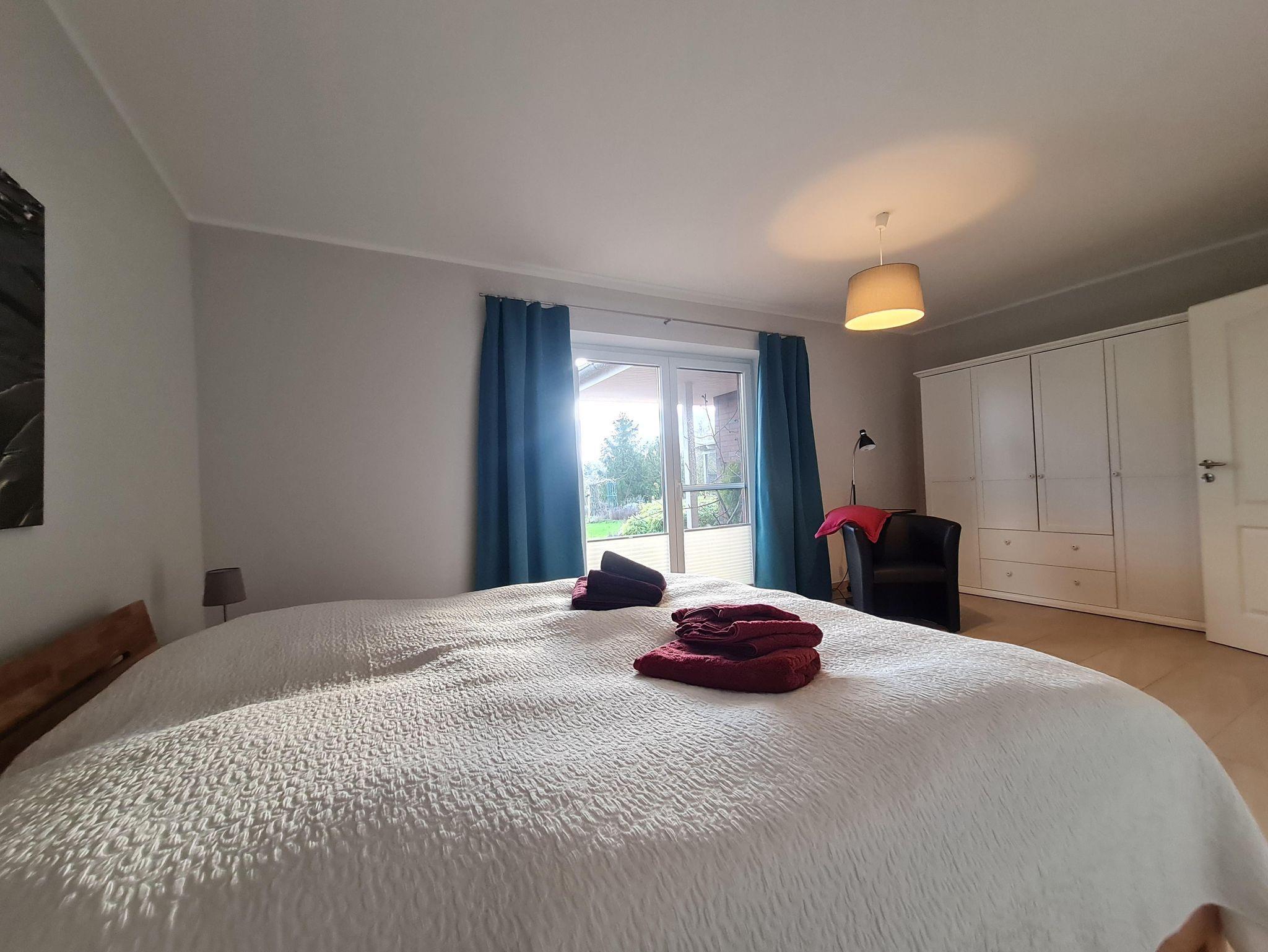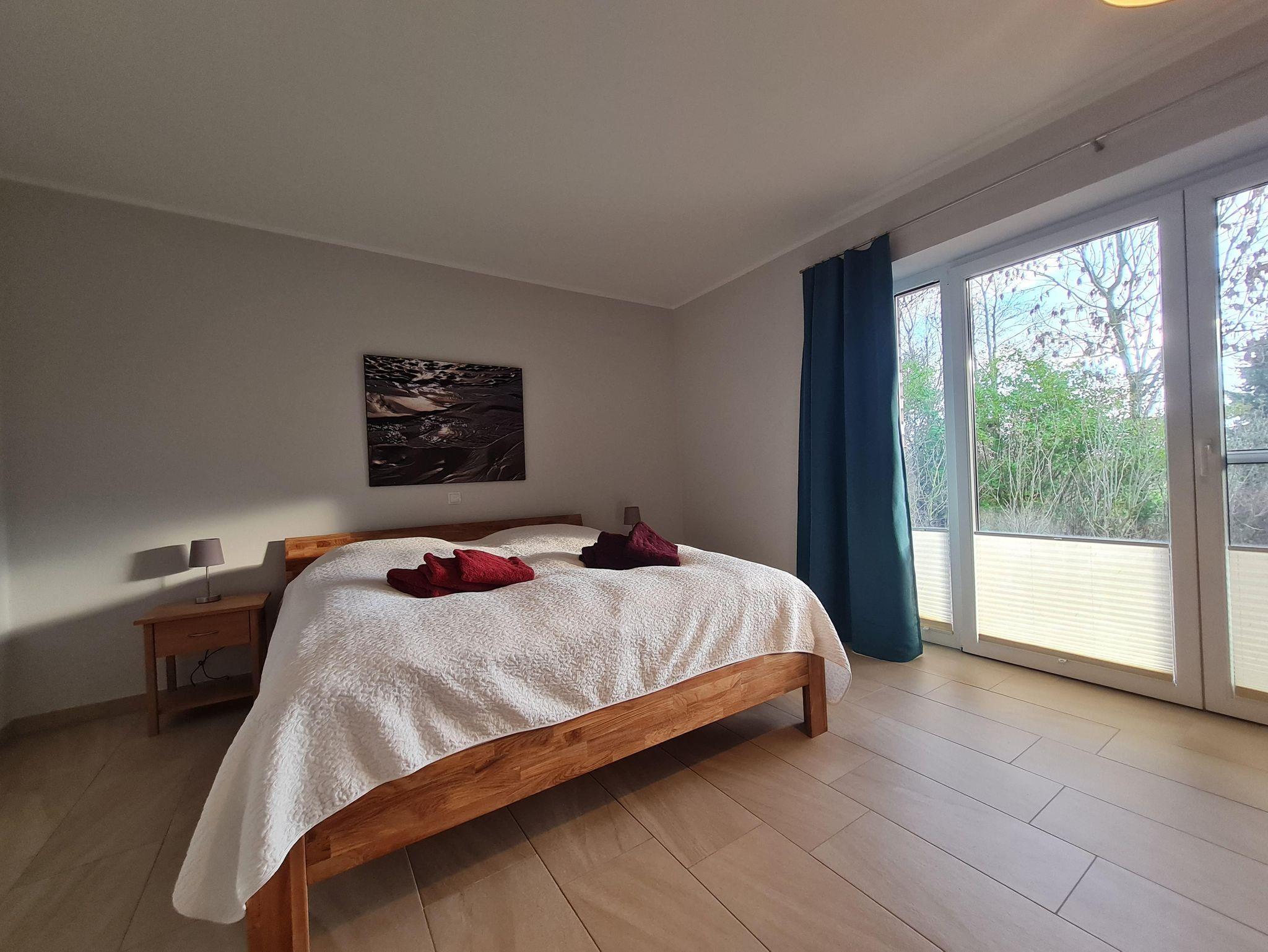 Helles freundliches Schlafzimmer mit Doppelbett und Zugang zur Terrasse.