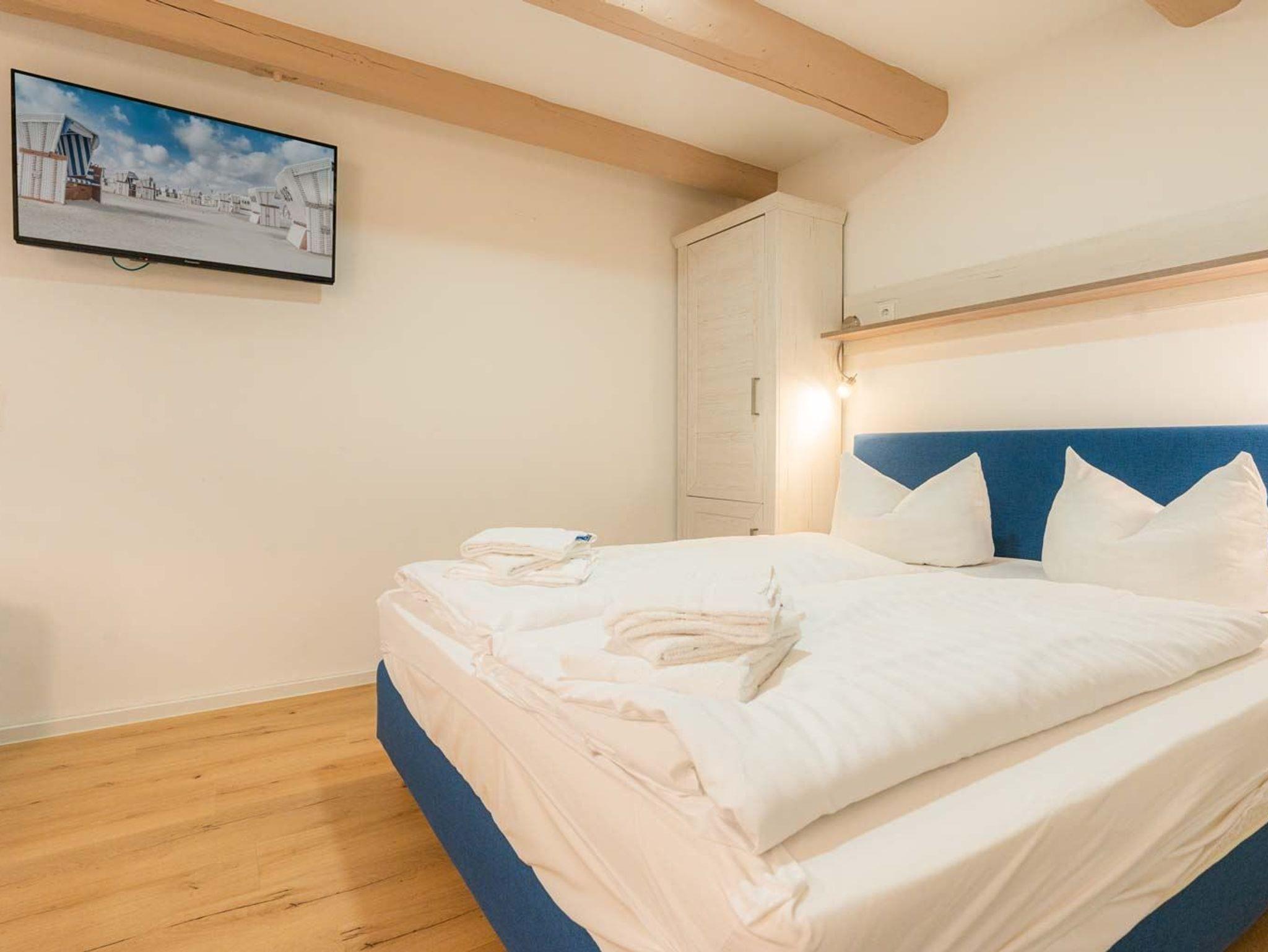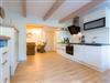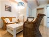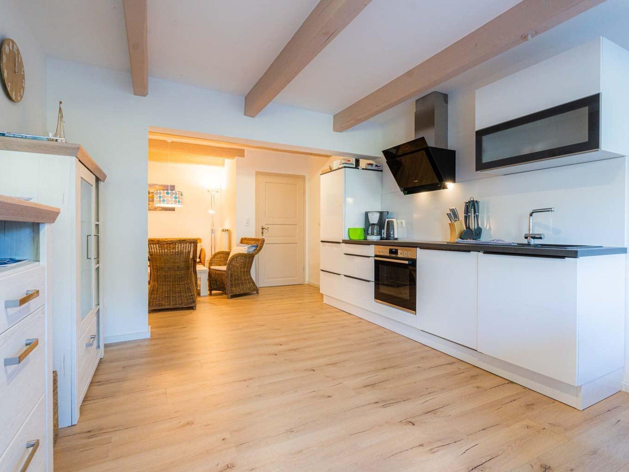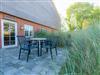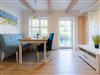 Wohn- und Schlafzimmer mit Korbsofa, 2 Korbsesseln, SMART-TV, Esstisch mit Sitzbank und 2 Stühlen, Doppelbett (160x200cm, Boxspring) und Kleiderschränken. Offene Küche mit Backofen, Geschirrspüler und Kühlschrank (Gefriermöglichkeit im Gemeinschaftsraum). Direkter Zugang zur möblierten Terrasse nach Norden mit Dünengras-Wall.