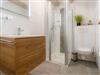 Badezimmer (Duschbad) mit bodengleicher Dusche, WC, Handtuchwärmer und Föhn.