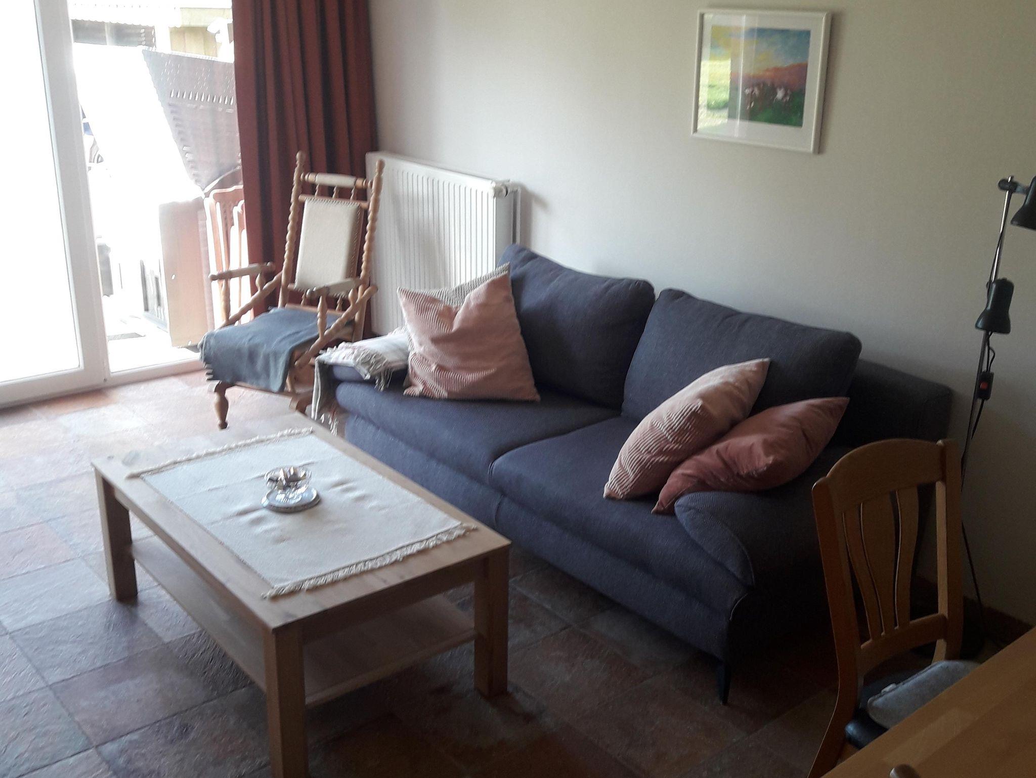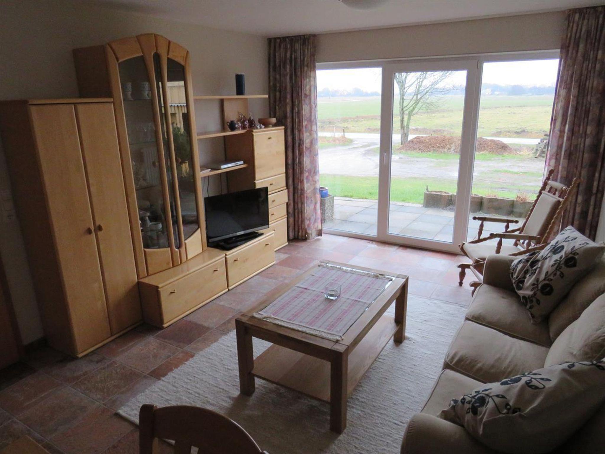Terrasse mit Strandkorb und Gartenmöbel. Große Rasenfläche. Ebenerdig. Hervorragend geeignet für Leute, die Ruhe suchen. Unverdeckter Ausblick auf die Weiden .