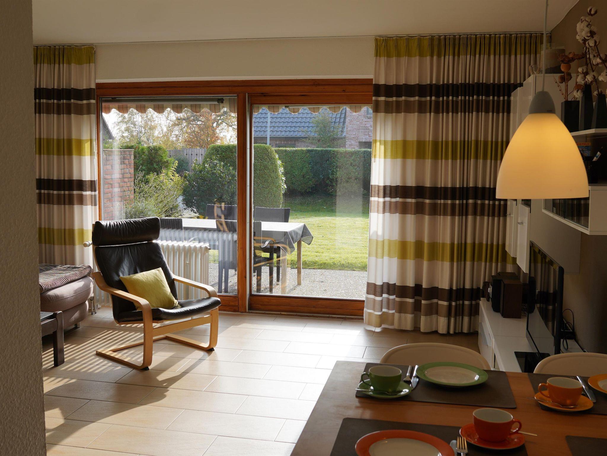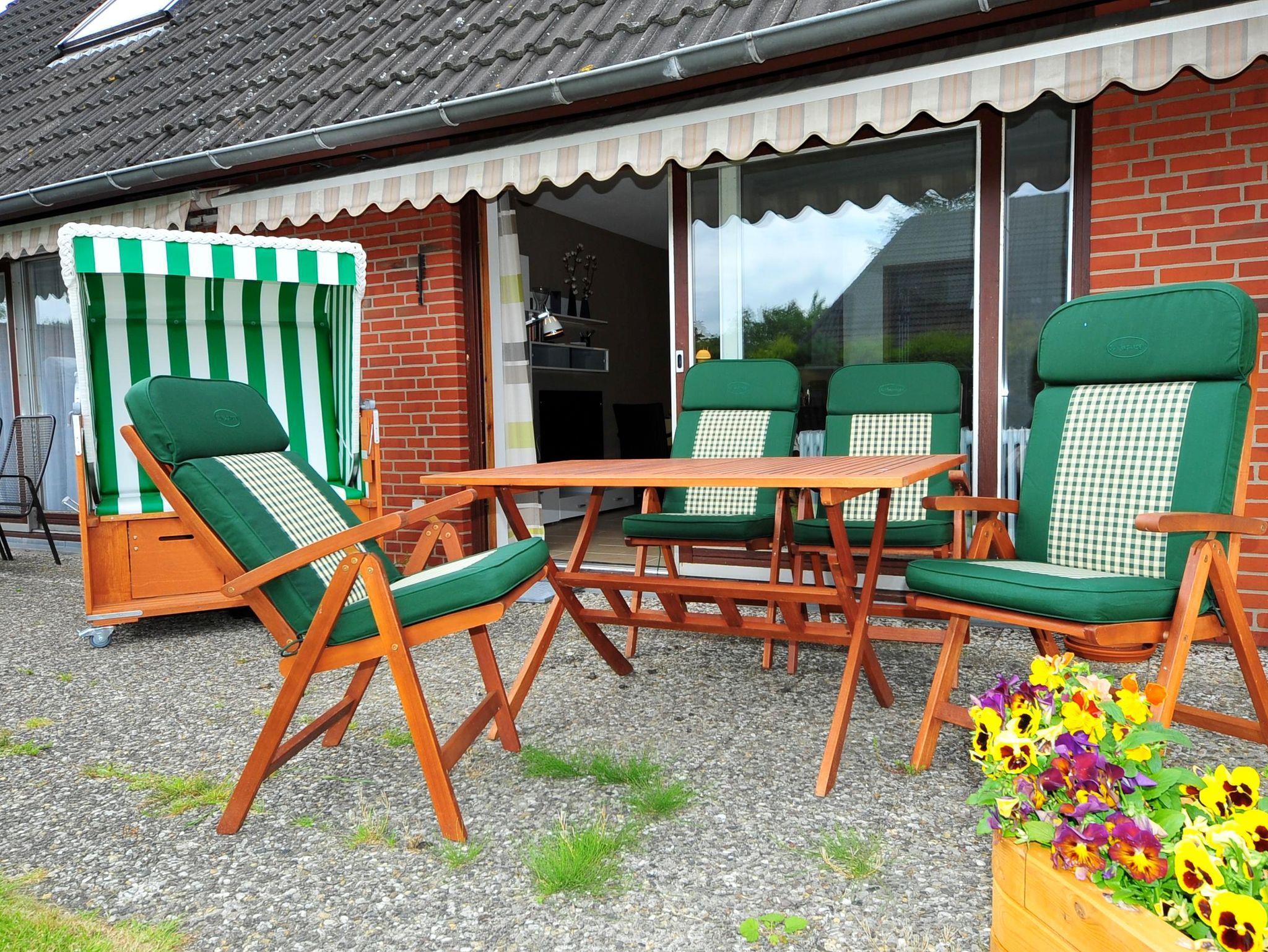 Vom Wohn- und Essbereich betreten Sie direkt die Süd-Terrasse mit Strandkorb und Gartenmöbeln.