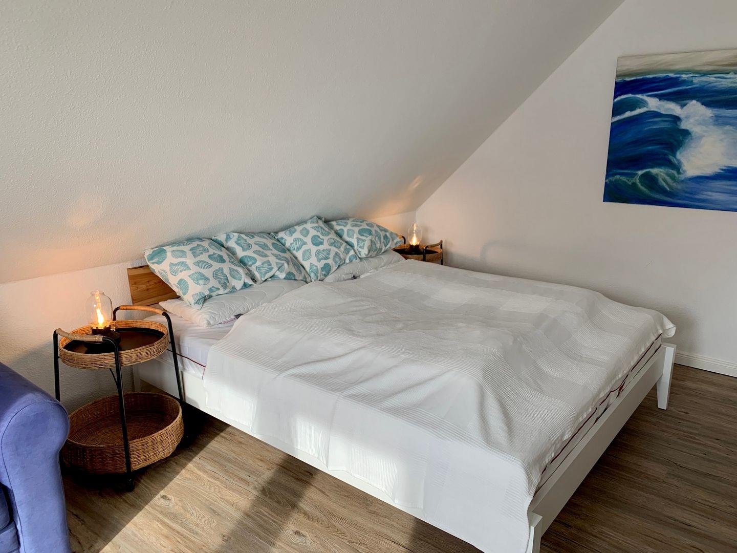 Ein 180x200cm Doppelbett gehört nebst großem Kleiderschrank zur Ausstattung.