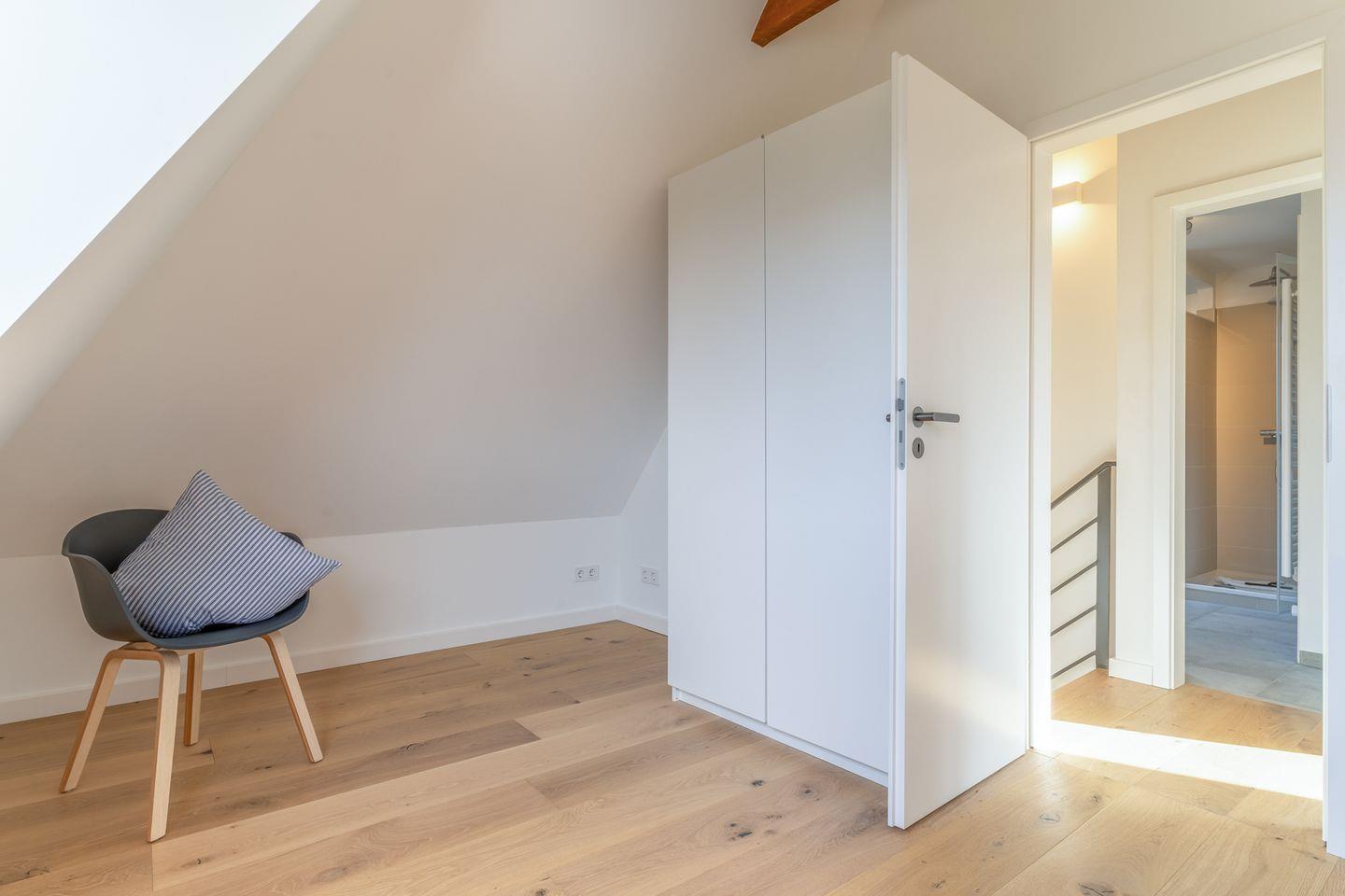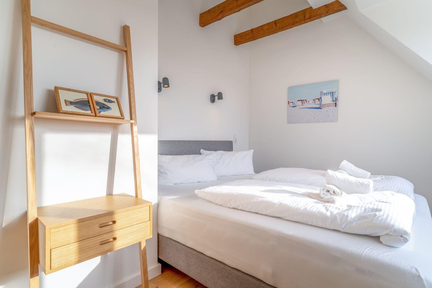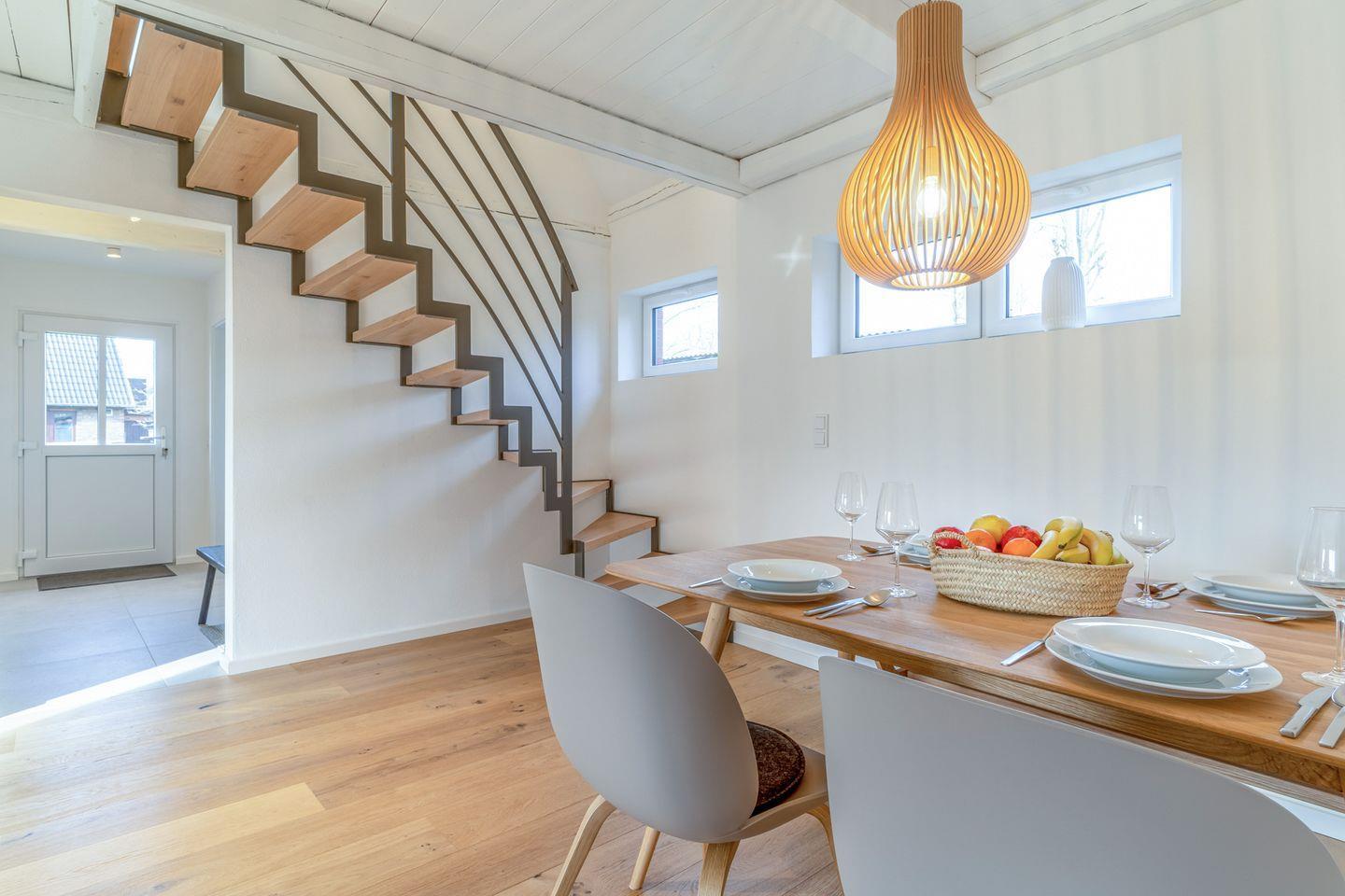 Über eine schöne Holztreppe gelangt man ins Obergeschoss mit zwei Schlafzimmern, die mit komfortablen Boxspringbetten (160x200) ausgestattet sind. Das moderne, lichtdurchflutete Duschbad im Obergeschoss besticht durch eine bodengleiche Dusche und Handtuchwärmer.