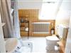 Das Duschbad ist ausgestattet mit einem WC und einem Waschbecken mit Spiegel.