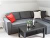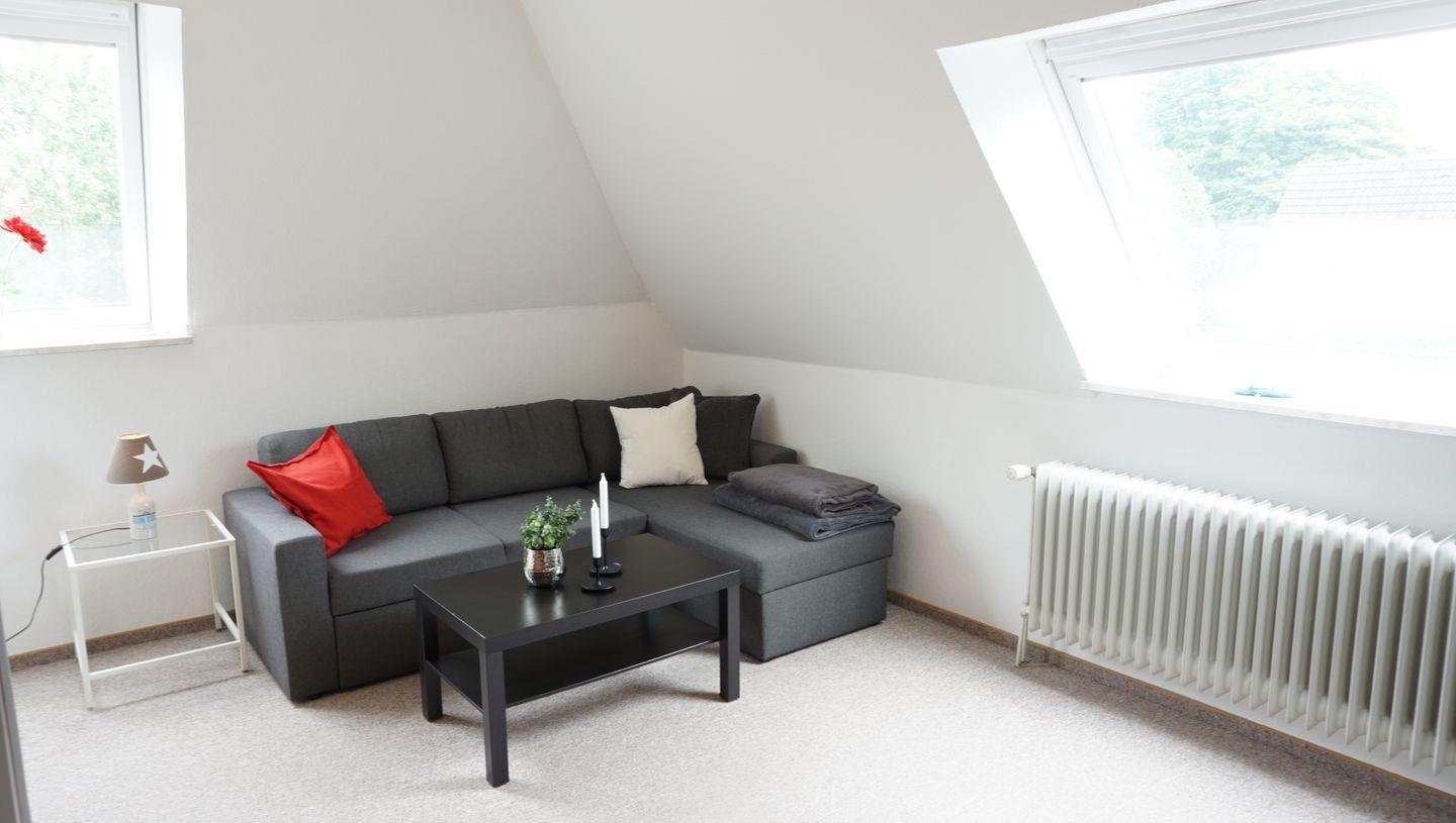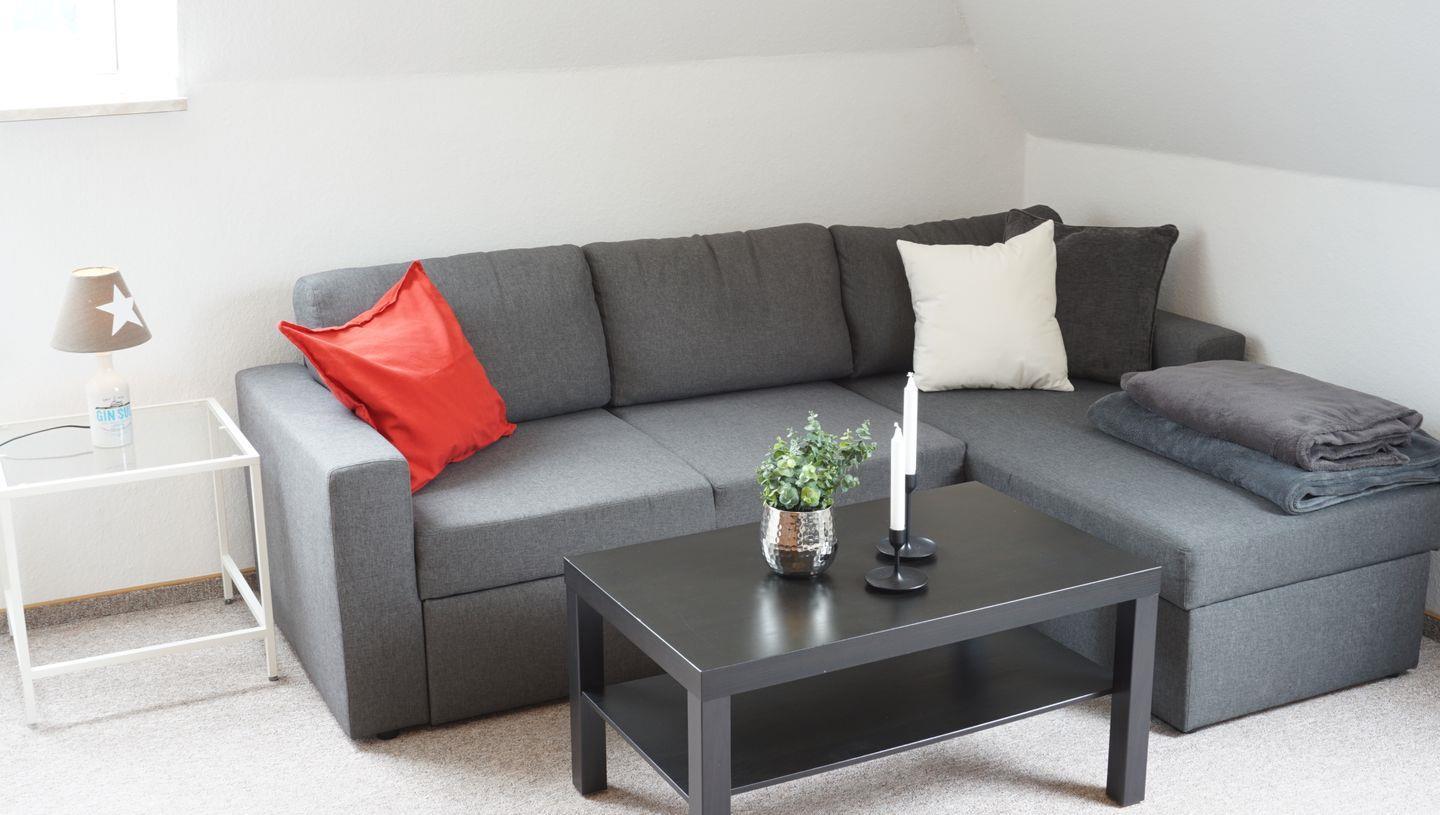 Ferienwohnung im OG mit ca. 40m2 für bis zu 3 Personen. Der Wohnbereich bietet ausreichend Platz für lauschige TV Abende in der gemütlichen Sofaecke. Das Sofa ist auch gleichzeitig ausziehbar als Schlafplatz für 2.