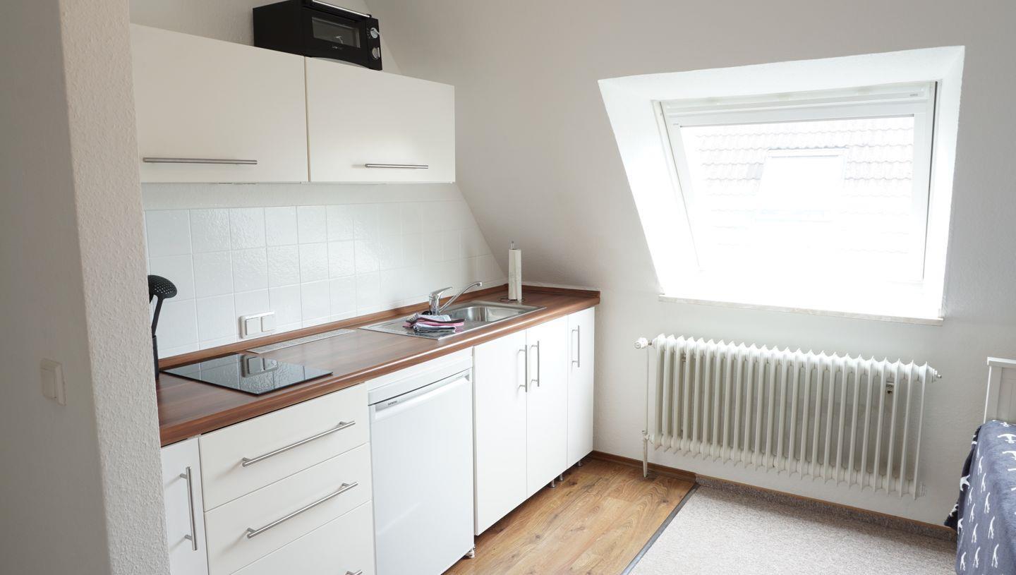 Das 2. Zimmer beherbergt die Küche mit allem was wichtig ist wie 2 Cerankochfelder, Kaffeemaschine, Kühlschrank, Waschbecken, sowie einem Airfryer.