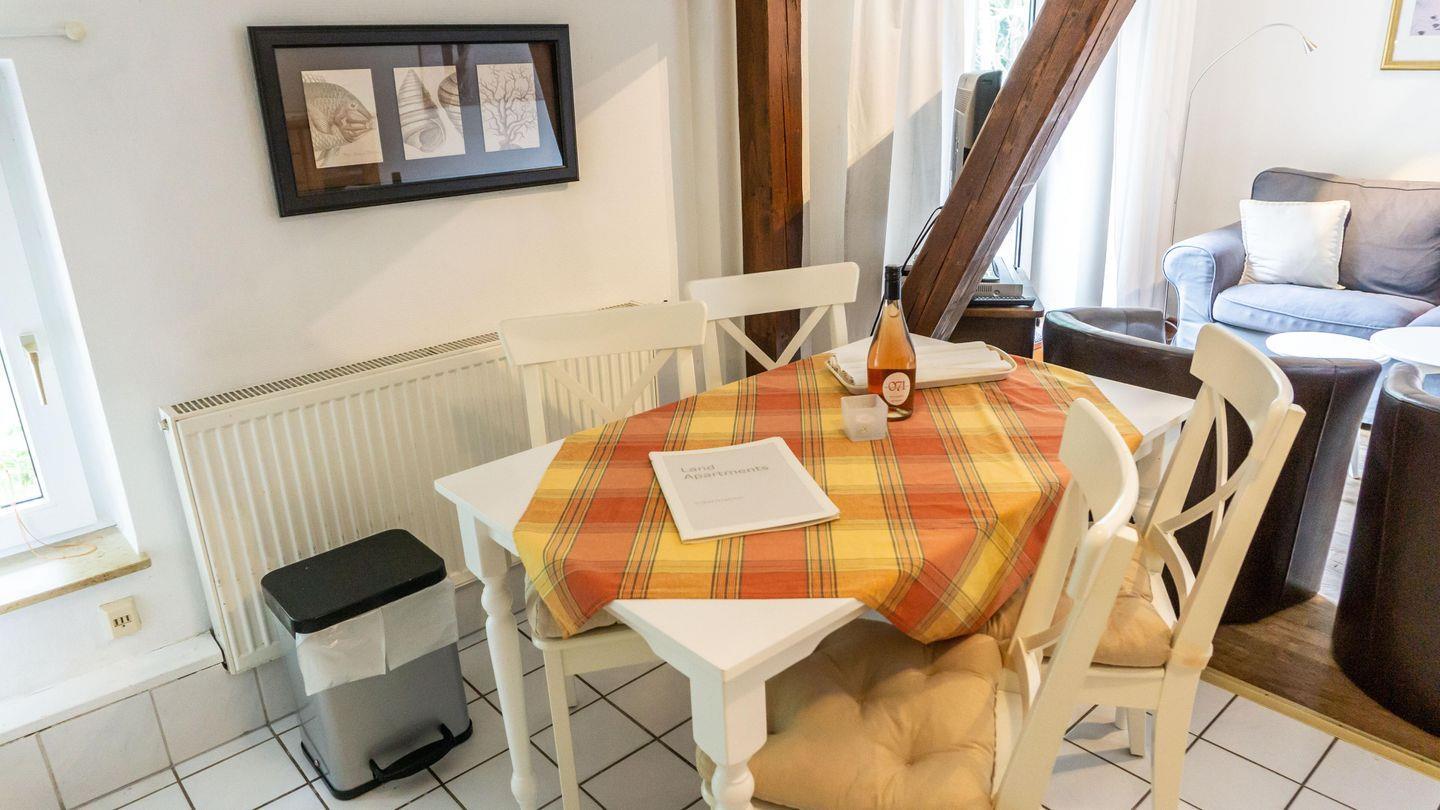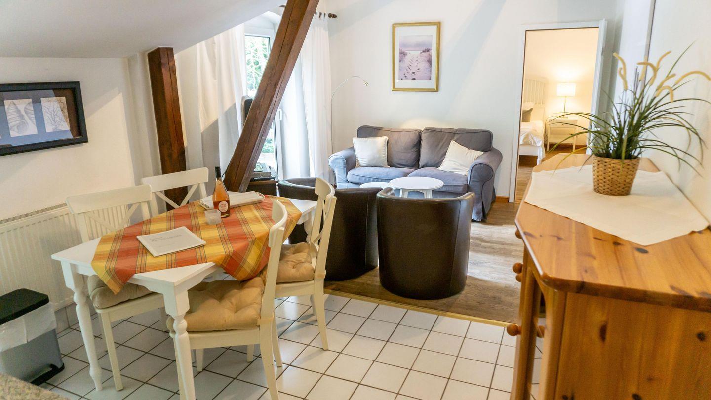 Der komfortable Wohnbereich ist mit einem Sofa und Zwei Sessel eingerichtet und lädt dazu ein, die gemeinsame Zeit zu genießen. Ein Fernseher steht zur Verfügung, ebenso wie Radio und CD-Spieler, um sich zu entspannen und die Seele baumeln zu lassen. Kostenfreies WLAN ist ebenfalls vorhanden, sodass Sie auch während Ihres Aufenthalts online bleiben können.