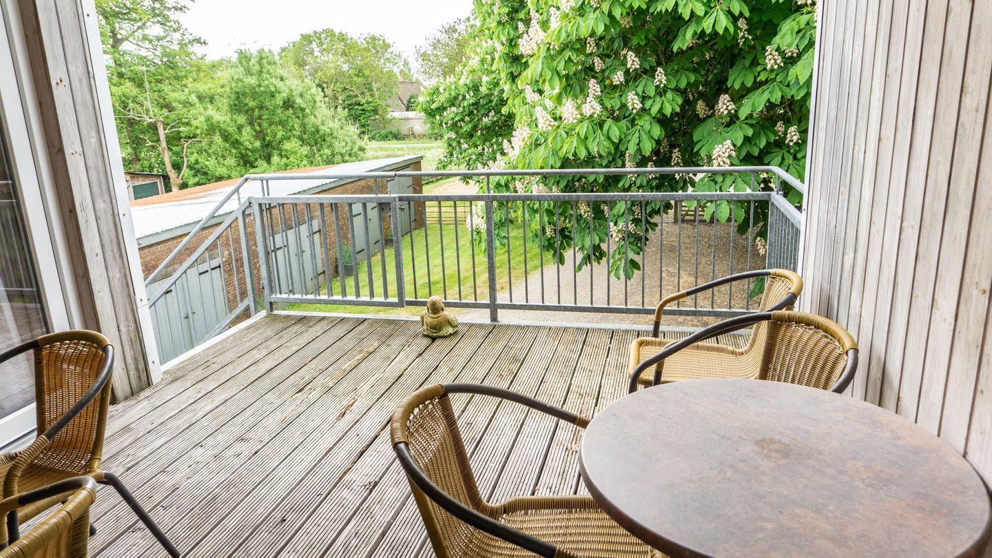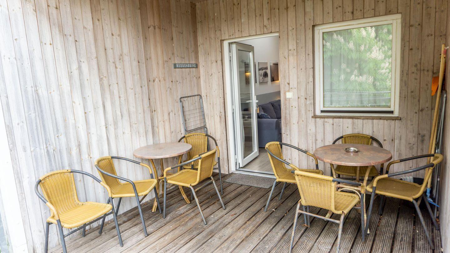 Genießen Sie den Blick auf die schöne, umliegende Landschaft von der überdachten Loggia, die mit einer einfachen Sitzgruppe ausgestattet ist. Der Bereich wird gemeinschaftlich mit einer gegenüberliegenden Unterkunft geteilt.