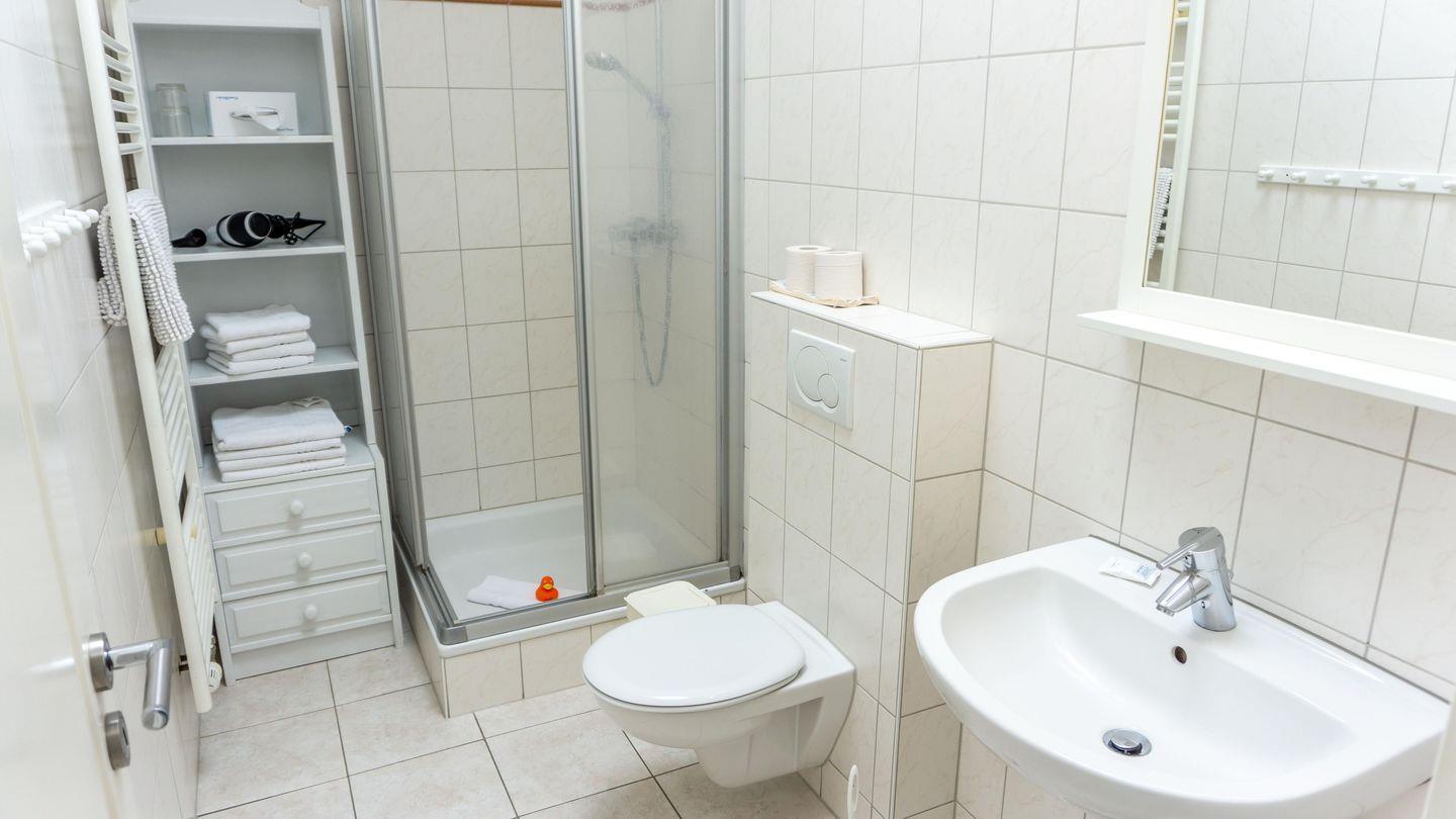 Die Seadrift Meeresbrise verfügt über ein modernes Bad, ausgestattet mit einer Dusche,Waschbecken, WC, Spiegel und einem Haartrockner.