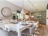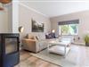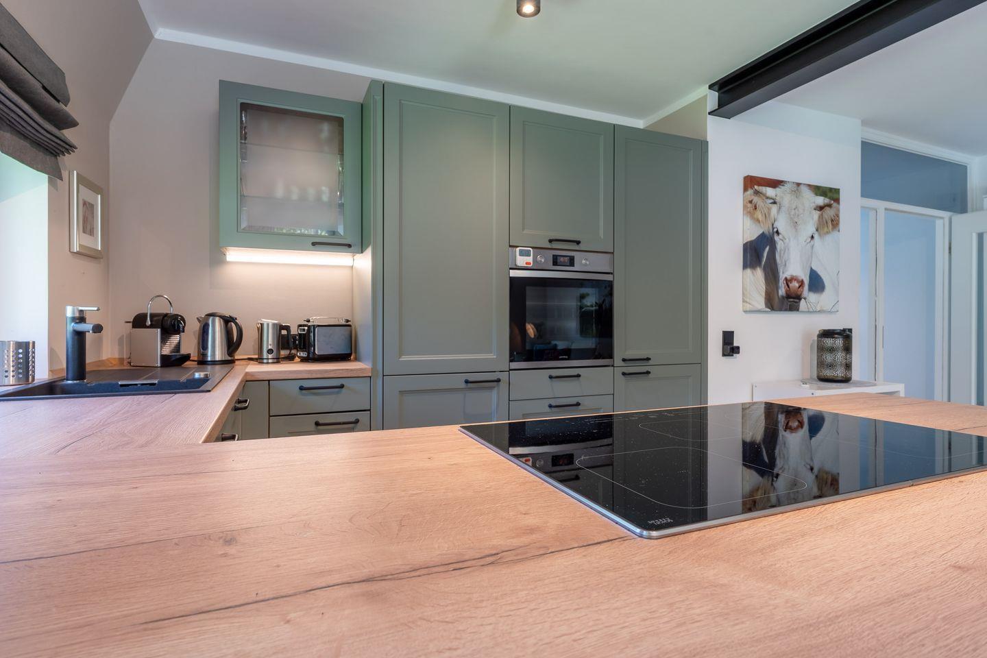 Großes Wohn-/Esszimmer mit Kamin und Terrasse im eigenen Garten, 2 Schlafzimmer (1x Doppelbett, 1x 2 Einzelbetten), modernes Duschbad + Gäste-WC, hochwertige Küche mit Kochinsel, Wasch-Trockner, WLAN, TV.