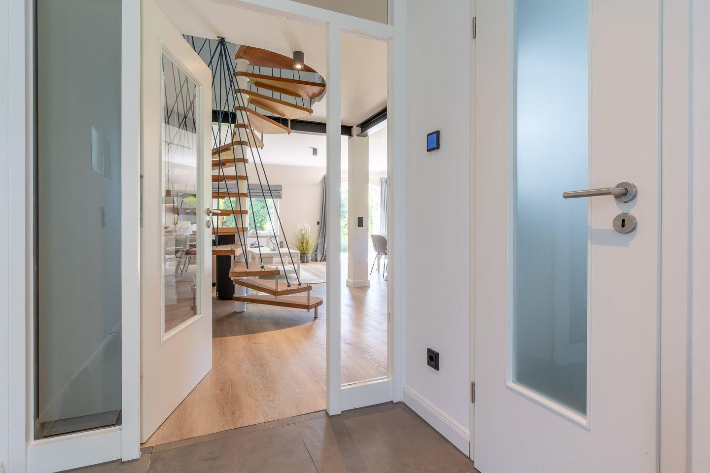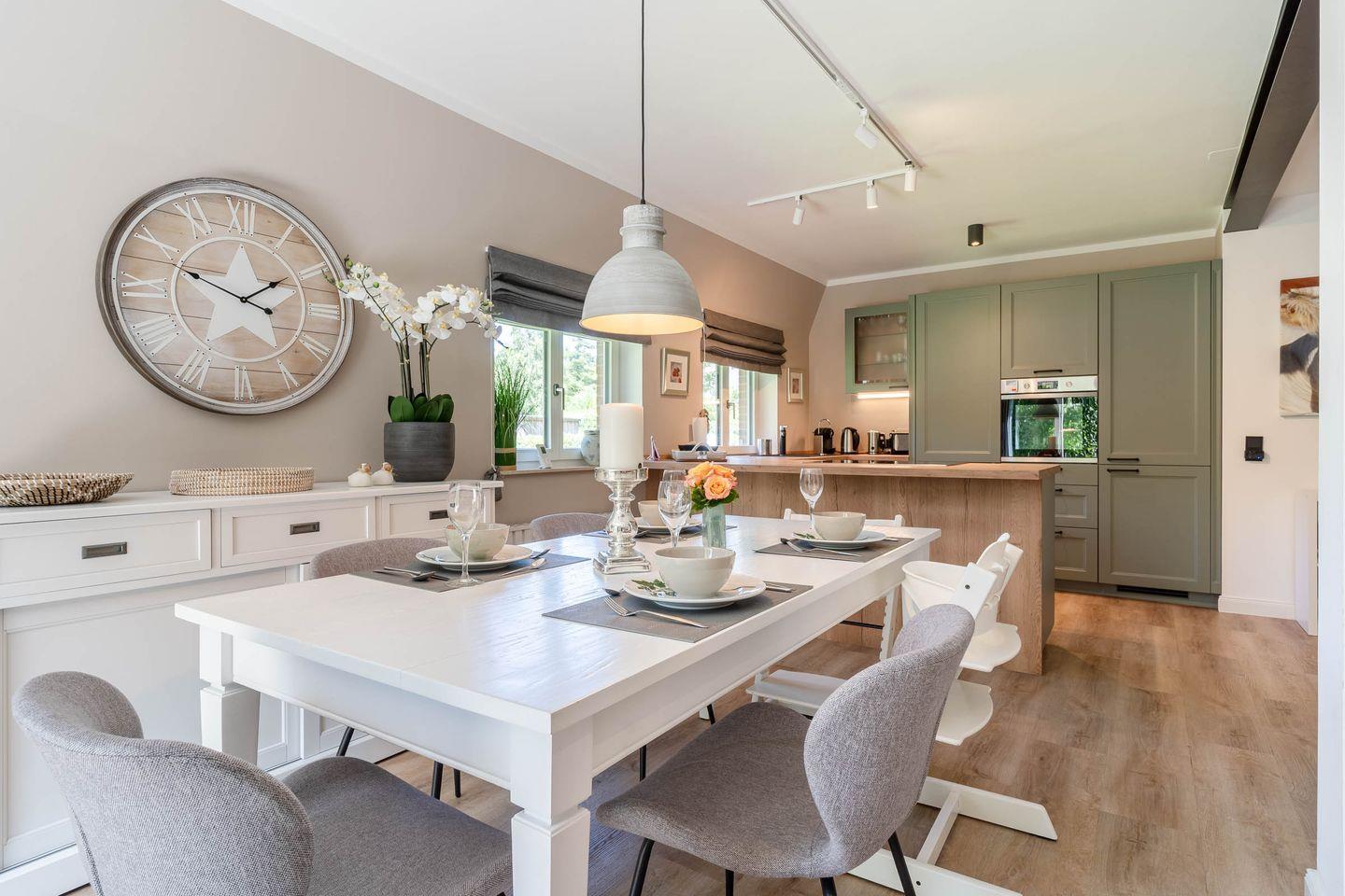 Die moderne, voll ausgestattete Wohnküche mit Kochinsel, hochwertigem Mobiliar und großzügigem Esstisch lässt keine Wünsche offen. Ein separates Gäste-WC rundet das Erdgeschoss ab.