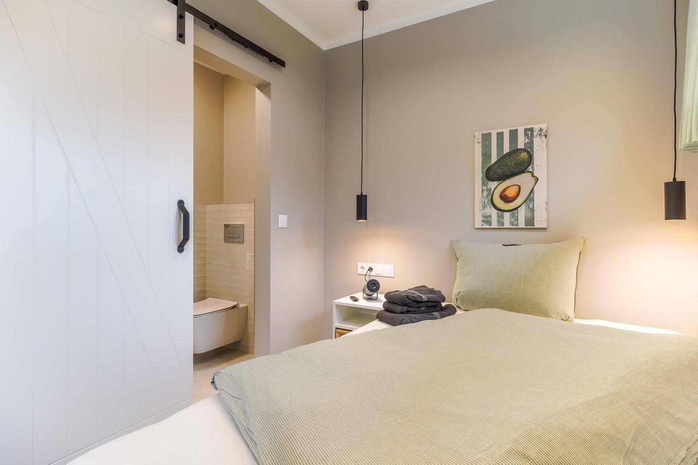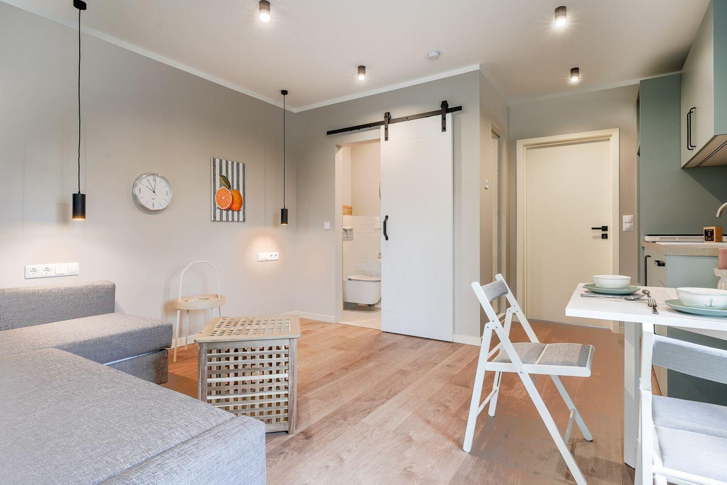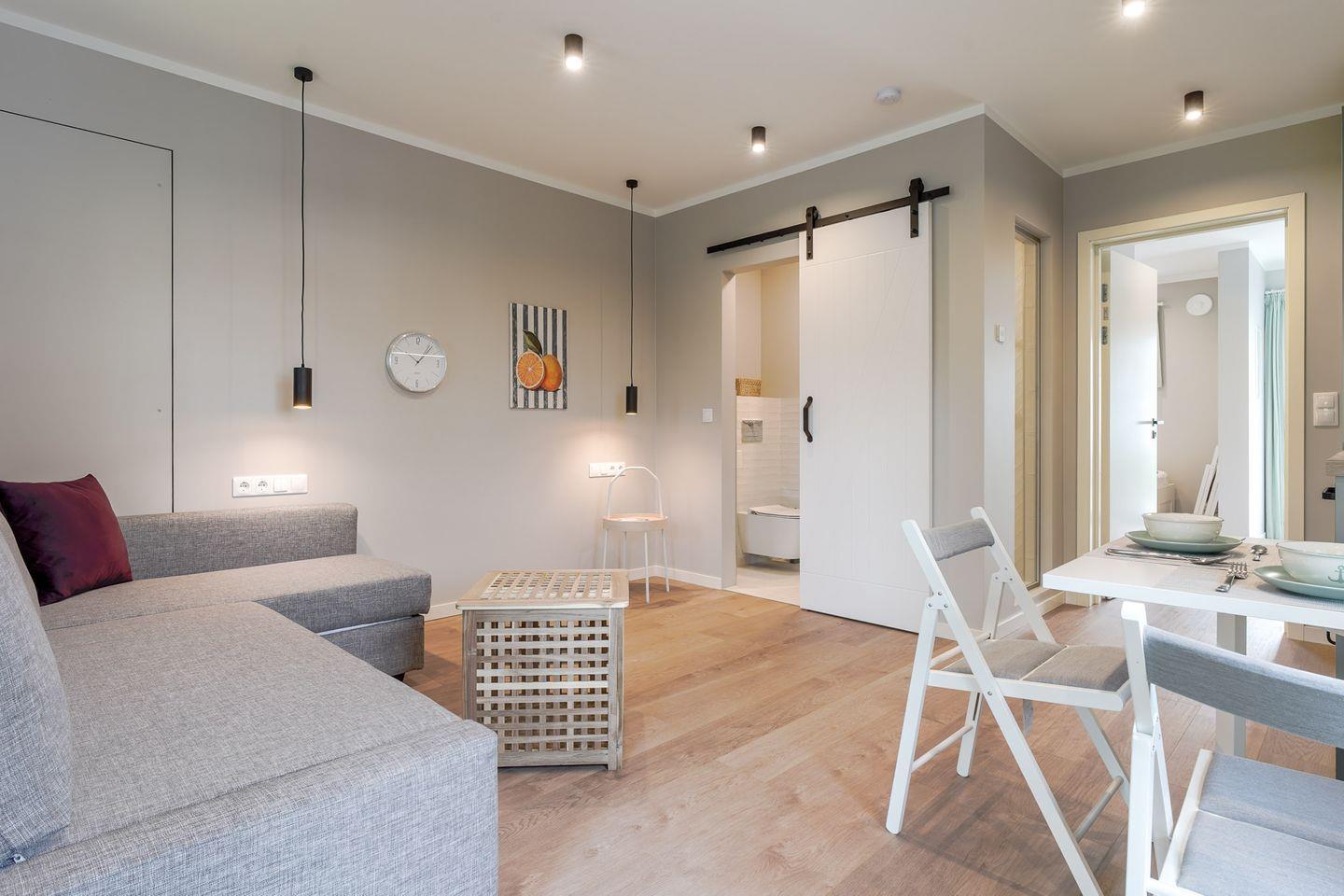 Die größere Einheit verfügt zusätzlich über ein gemütliches Sofa, das zum Entspannen einlädt und den Wohnbereich zu einem komfortablen Treffpunkt macht. Zwei moderne Bäder sowie zwei voll ausgestattete Küchenzeilen sorgen für maximale Flexibilität und Komfort.