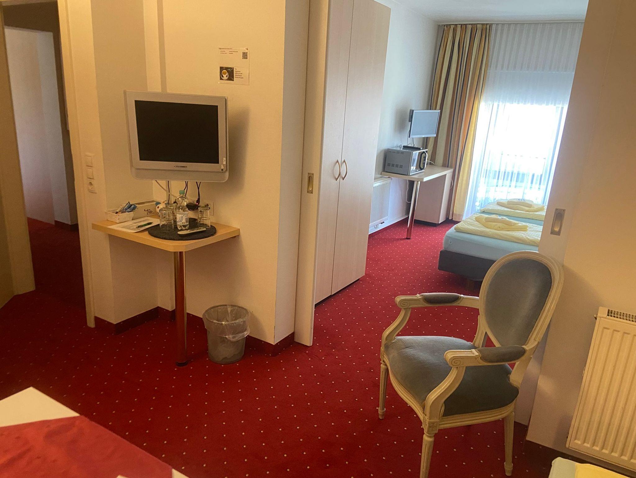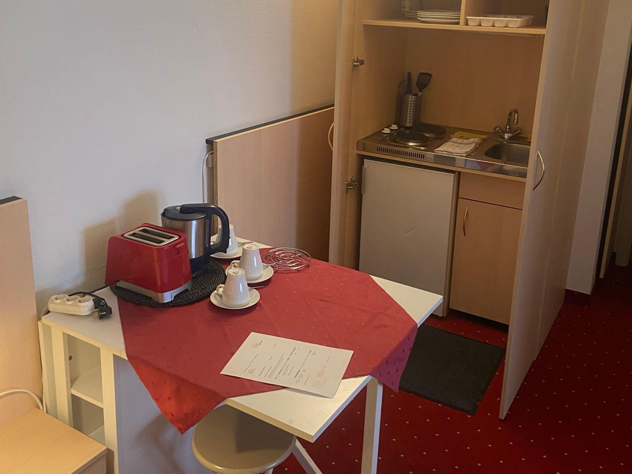 Genießen Sie Annehmlichkeiten wie zwei Fernseher, Wasserkocher, Kühlschrank, Toaster, Mikrowelle, Schreibtisch und kostenloses WLAN.