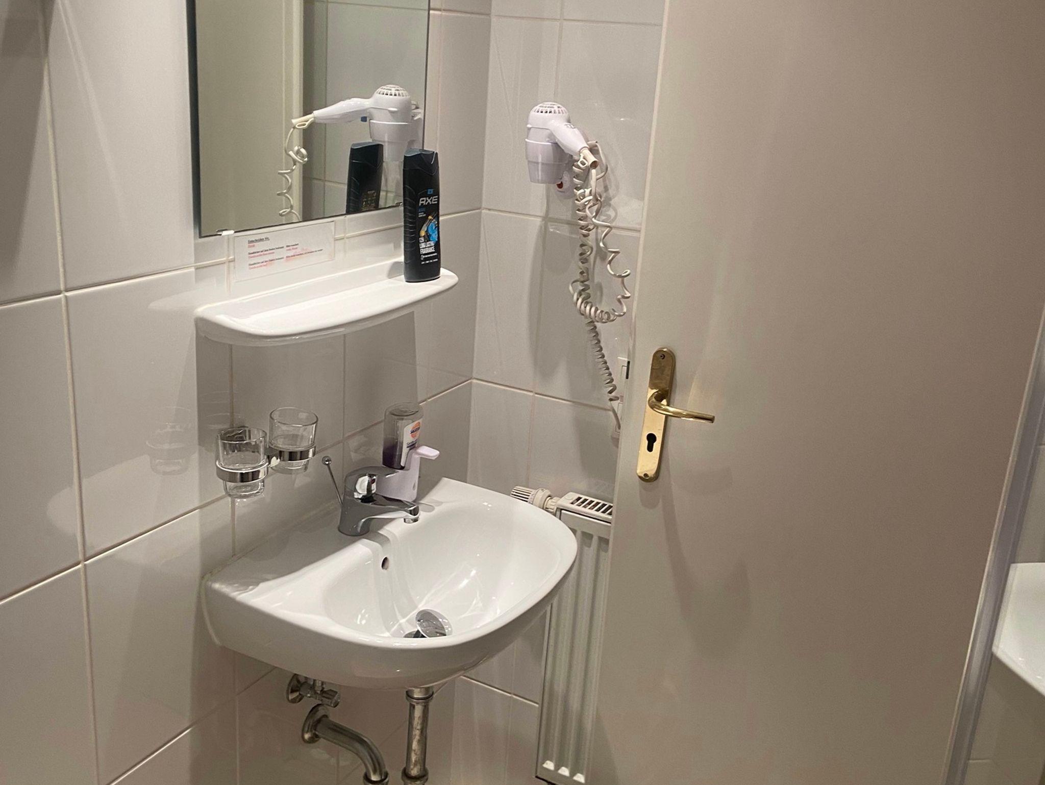 Das Badezimmer mit Dusche und WC, div. Pflegeartikel.