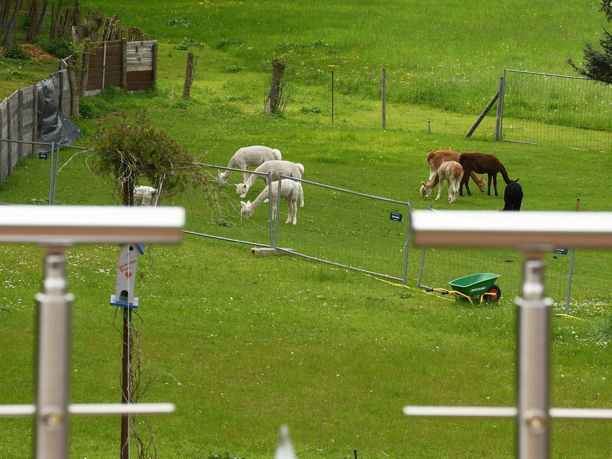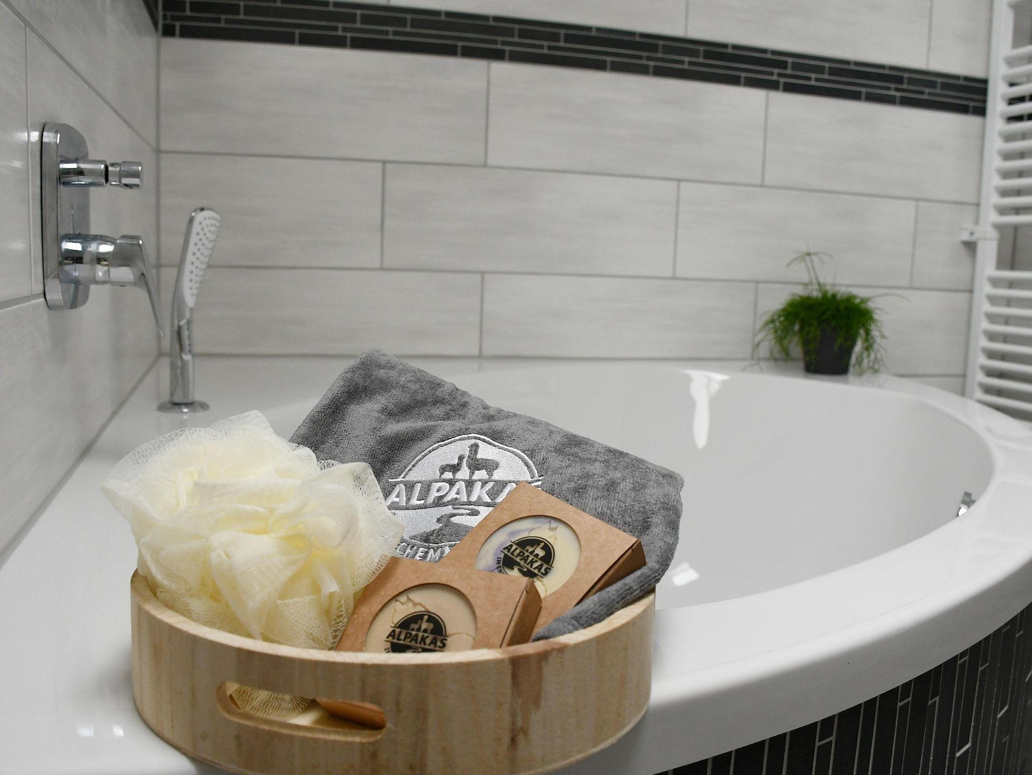 Jedes Schlafzimmer ist jeweils mit einem komfortablen Doppelbett 180x200cm und einem Flachbildfernseher ausgestattet. Es erwarten Sie Alpaka-Steppbetten, die einen erholsamen Schlaf garantieren. In jedem Raum befindet sich eine Fußbodenheizung. Der Wohnraum mit offener Küche bietet aufgrund der großen Fensterflächen einen tollen Ausblick auf die Weide. Die große bequeme Couch ist ausziehbar und somit auch als Schlafcouch nutzbar. Ein großer Flachbildfernseher ( Satelliten-Empfang ) befindet sich ebenfalls im Raum. Die moderne Einbauküche ist voll ausgestattet mit einer Kühl-Gefrierkombination, Induktions-Kochfeld, Backofen, Mikrowelle, Spülmaschine (Siemens), Kaffeemaschine, Toaster und Wasserkocher. Geschirr, Besteck, Töpfe, Pfannen, Gläser etc. sind ausreichend vorhanden. Das Tageslichtbad mit einer Eckbadewanne, Dusche mit großer Regenduschbrause, Waschbecken, WC und einem Spiegelschrank mit Föhn rundet das Gesamtbild ab. Die 50m² große Holzterrasse mit unverbautem Weitblick auf die Alpakas und ins Chemnitztal lädt zum Verweilen ein. Die Terrasse ist für den perfekten Sonnenuntergang südwestlich ausgerichtet. Sie können hier auf den Sonnenliegen und rustikalen Holzsitzmöbeln entspannen. Bitte beachten Sie, dass die Wohnungen für Rollstuhlfahrer nicht geeignet sind (Treppenaufgang). Handtücher, Bettwäsche und Geschirrtücher sind inklusive. Das WLAN sowie der Parkplatz sind kostenfrei.