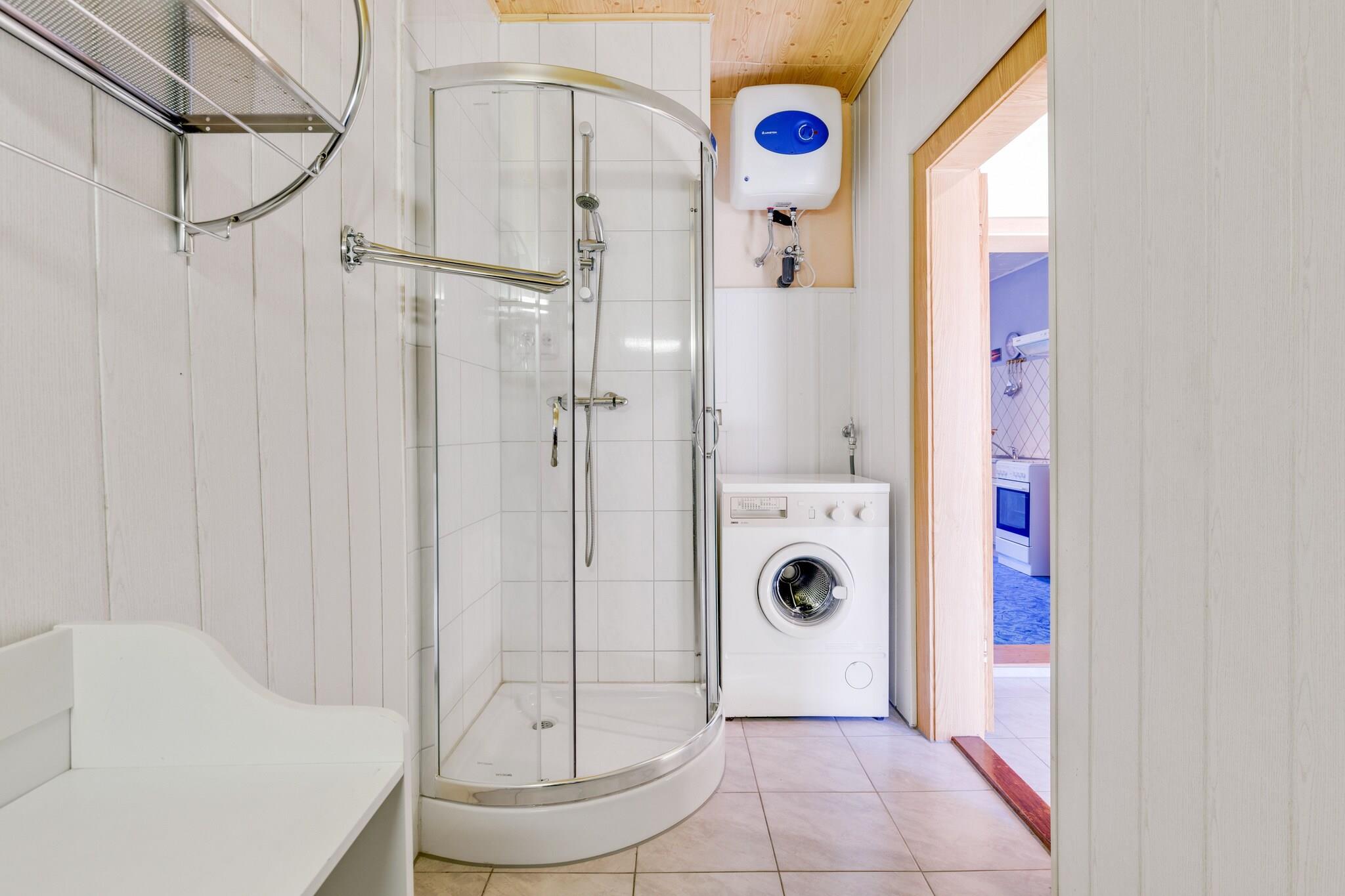Stueetage: (Indgang (adgang udefra), Stue(Fjernsyn(fladskærm, parabol), sofahjørne(4 personer)), Køkken(spisebord(4 personer), radio, elkedel, brødrister, komfur(Komfur med fire kogeplader, glaskeramisk), emhætte, kaffemaskine(kaffetragt), ovn, mikrobølgeovn, køleskab), soveværelse(king size-seng), badeværelse(bruser, håndvask, toilet, vaskemaskine), Repos) varme, terrasse, have(indhegnet), havemøbler, grill, parkering, Solcreme