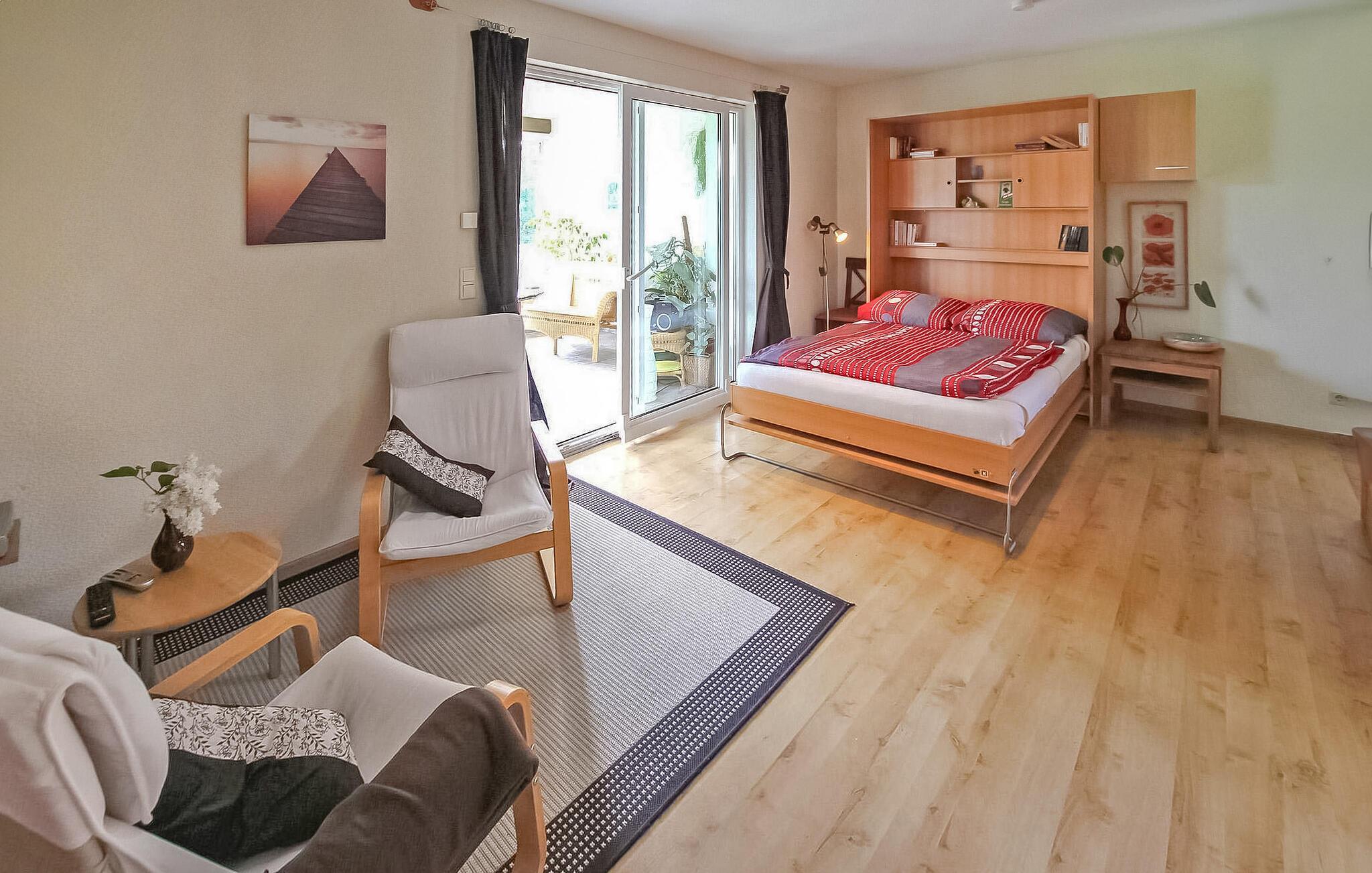 Denne ferielejlighed er en af tre separate ferielejligheder i et sommerhus. Det er bygget i 2006 og ligger på en rolig ejendom ved vandet, direkte ved søen Polsensee, cirka 5 km syd for Templin i Dargersdorf-distriktet. Badestranden ligger ca. 200 m væk. Der er en båd og fiskemole med en robåd (gebyr 3,00 euro/dag), et fælles vaskerum med vaskemaskine, en terrasse, en grillplads, nogle med balkon med udsigt over søen, et område til solbadning og en parkeringsplads. plads. Et selskabs- og festlokale med bar og pejs kan lejes efter behov. Brødservice i weekenden efter aftale. Inkluderet i den samlede pris: sengelinned, vand, energi og slutrengøring. Medbring venligst dine egne håndklæder. Faciliteter med stue (polstrede møbler, satellit-tv, radio), soveværelse (dobbeltseng, liggestol), åbent køkken-alrum med tekøkken, balkon med opholdsområde og søudsigt, bad/toilet, pejs, FB varme, centralvarme. Tremmeseng til levering. Templin er turistcentret i Uckermark. Sikkert ikke kun på grund af de smukke omgivelser fulde af skove og søer. Udendørs swimmingpools, naturkurbade, bådudlejning, passagerbådture i byen. Cirka 4 km uden for byen åbnede den vestlige by Silverlake City i 2004 med forskellige fritidsattraktioner. Trolleyture kan tages mellem Templin og Fürstenberg.