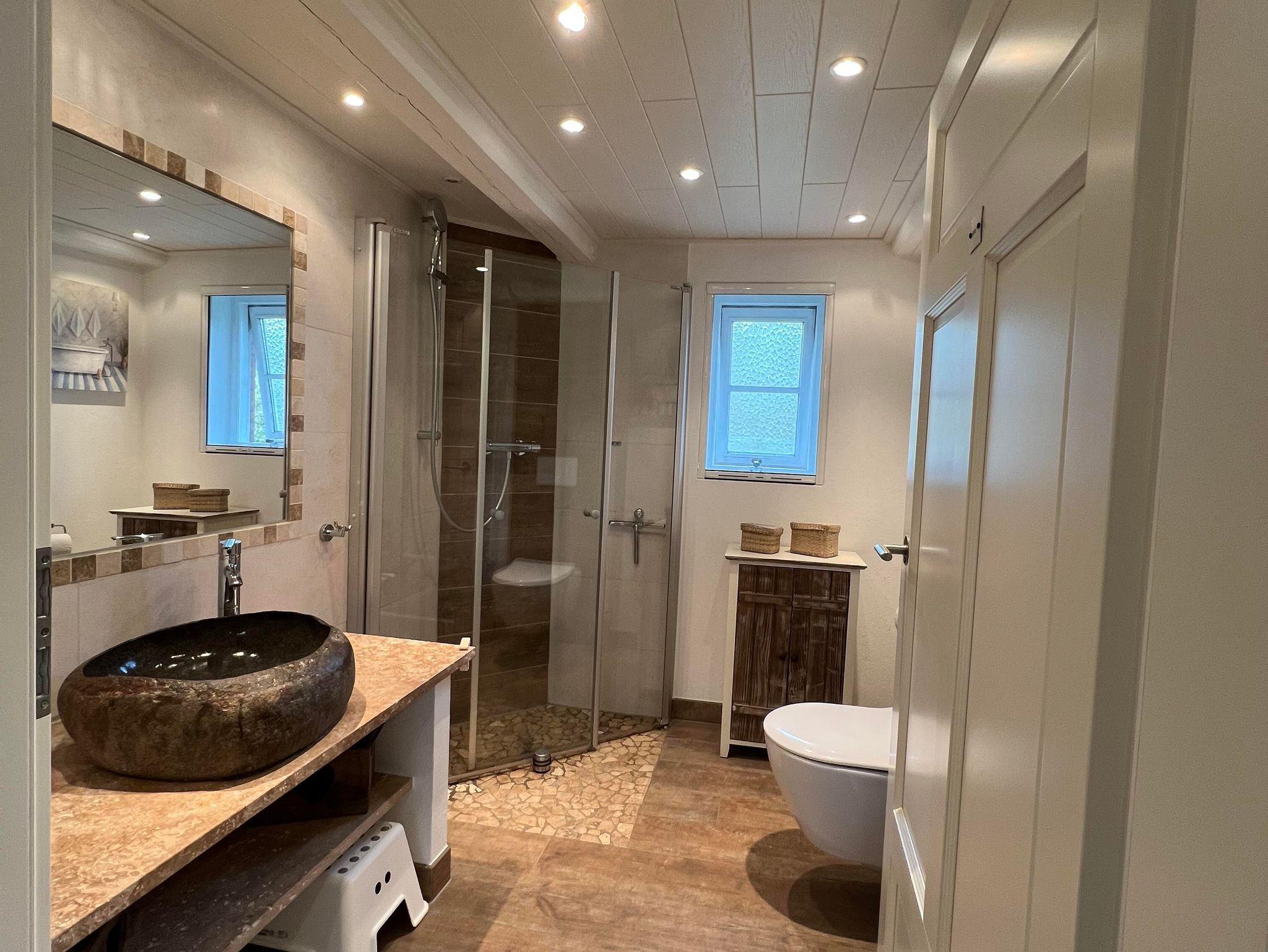 Am Morgen starten Sie erfrischt in den Tag: Das freundliche Tageslichtbad mit ebenerdiger Dusche sorgt für Komfort und Wohlbefinden.