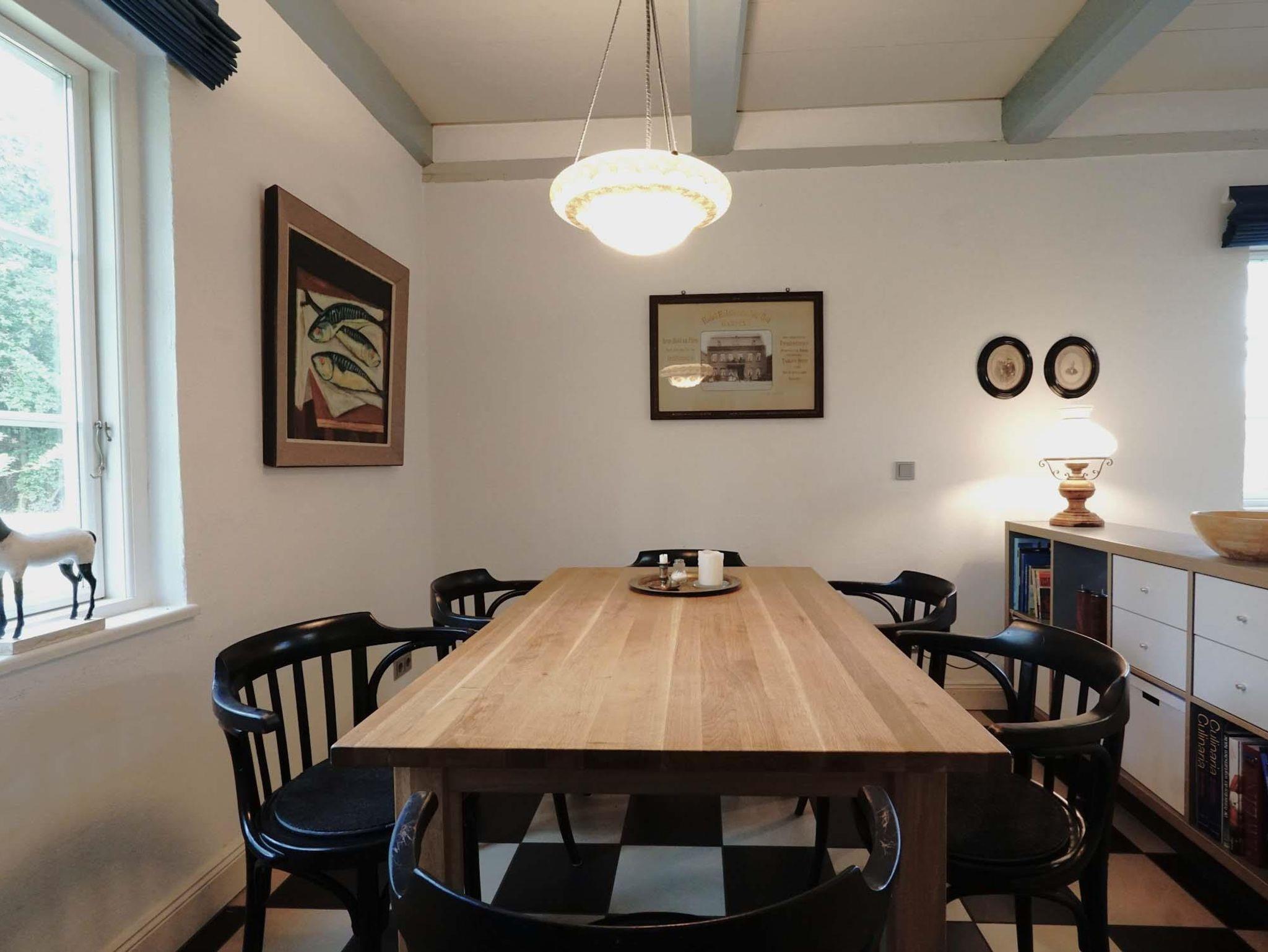 Das lichtdurchflutete Wohnzimmer befindet sich in der ehemaligen Loo-Deele (Scheune) in der Mitte des Hauses. Es bietet viel Platz für einen großen Ess- oder Spiele-Tisch und eine Sofa-Ecke zum Lesen oder Fernsehen. Von hier haben Sie auch Zugang zum Garten und der Terrasse. Eine separate Rückzugs-Leseecke mit Kamin befindet sich in der ehemaligen Eingangsdiele.
