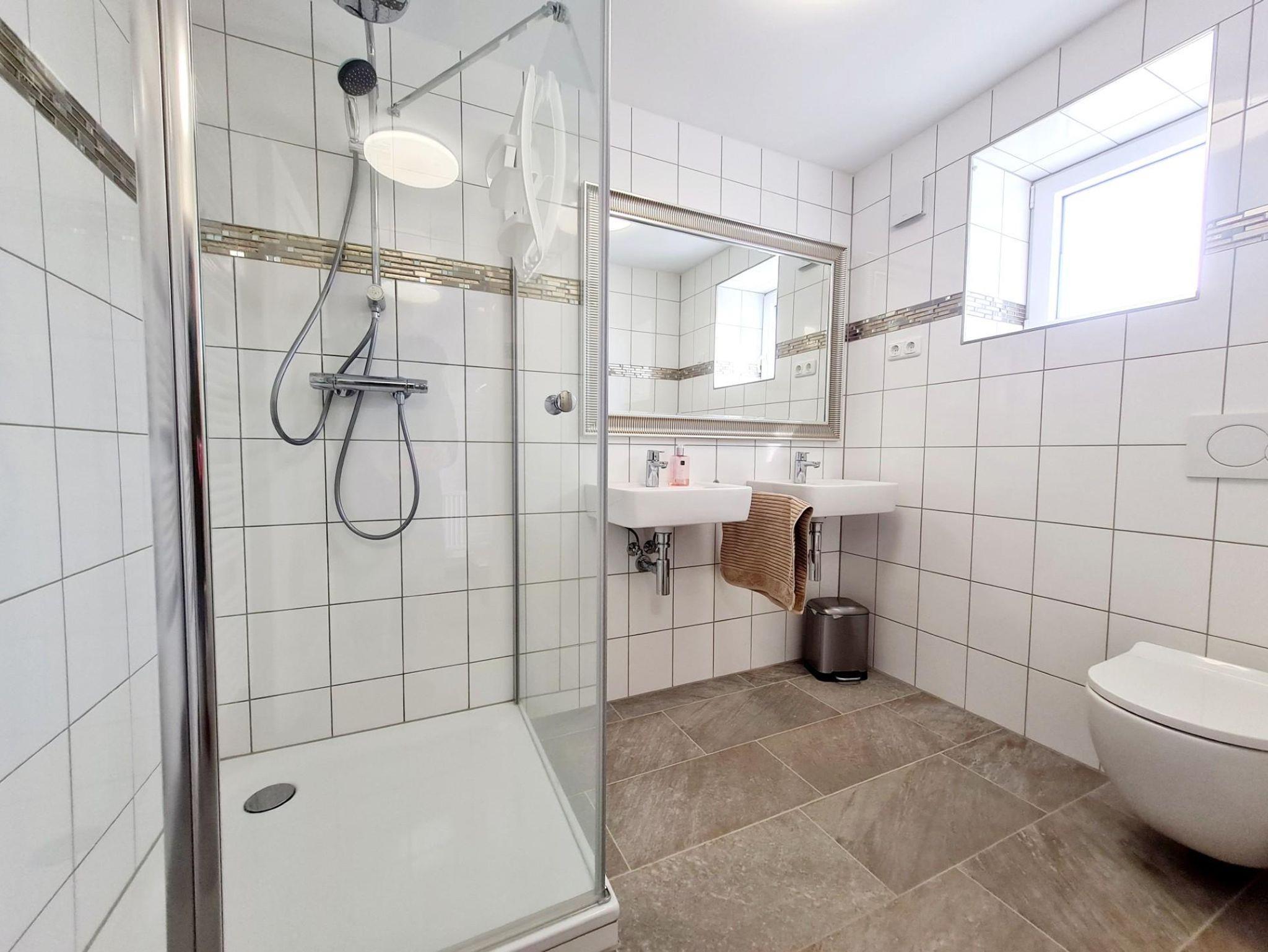 Das Duschbad bietet zwei Waschtische sowie ein WC. Zusätzlich steht ein weiteres WC im Obergeschoss zur Verfügung.
