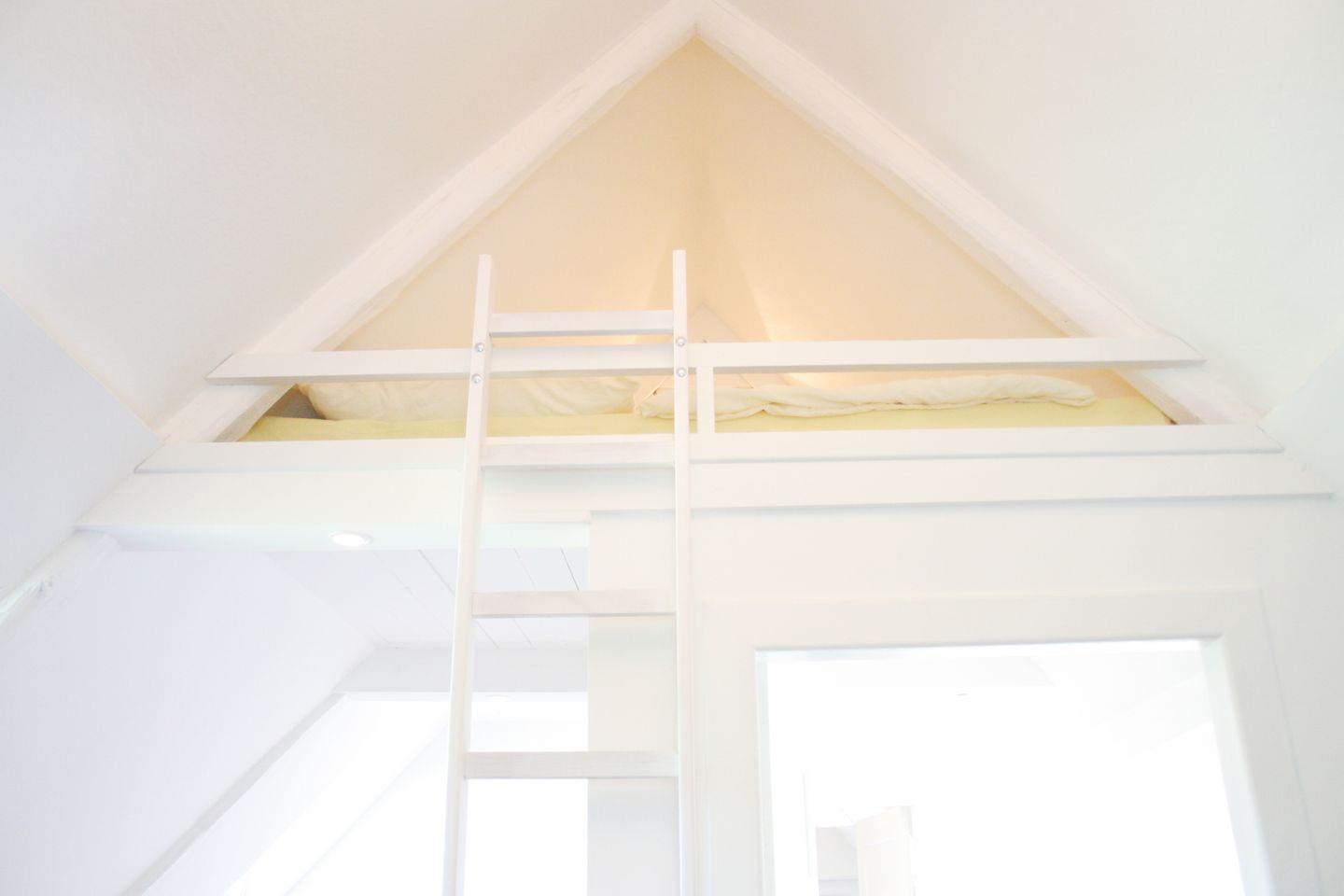 1 Schlafzimmer mit Doppelbett (200x160cm) und Hoch-Schlafkoje (200x160cm) im Hausgiebel, direkt unter dem Reetdach, für Piraten, Räuber und Prinzessinnen.