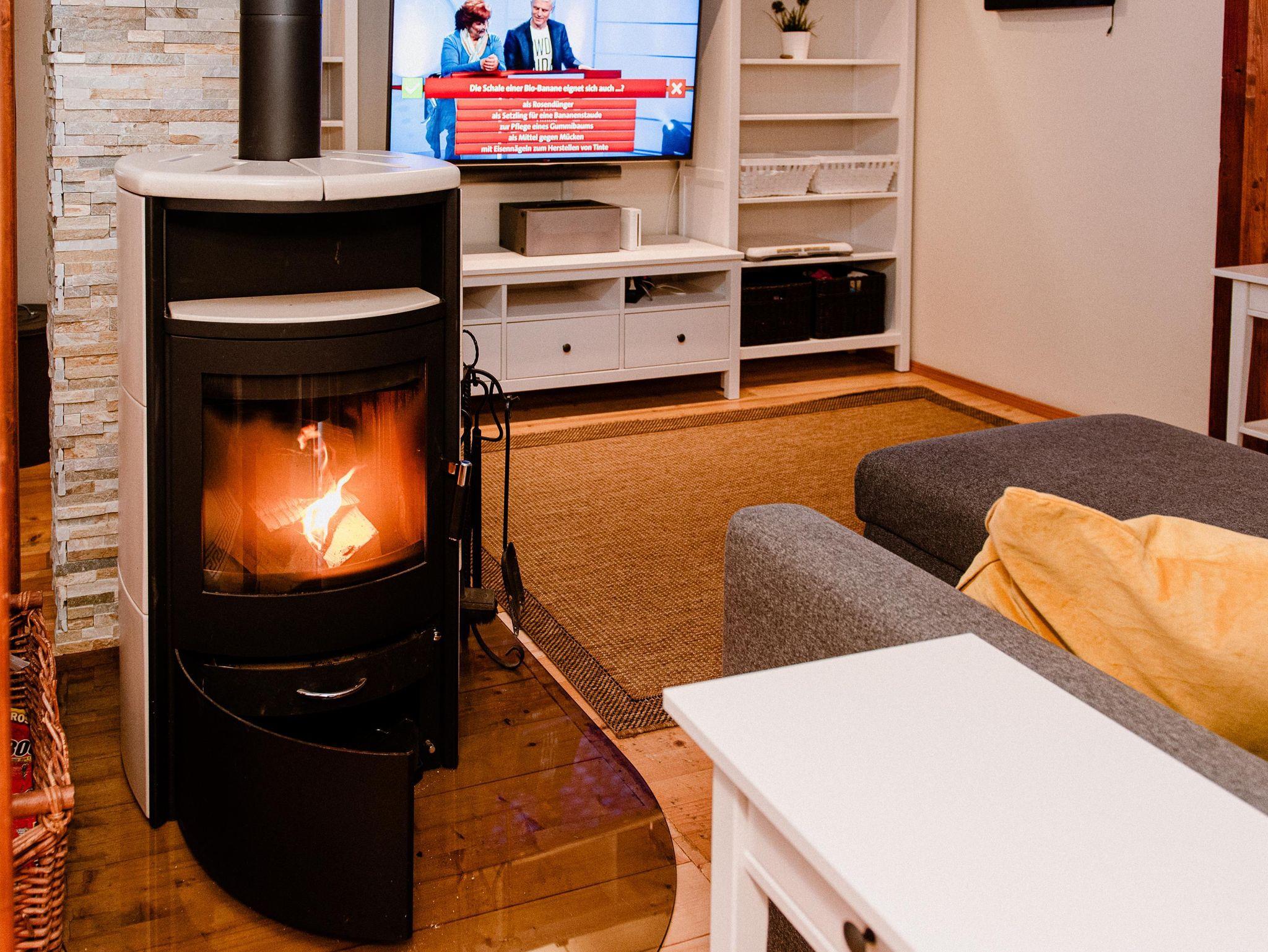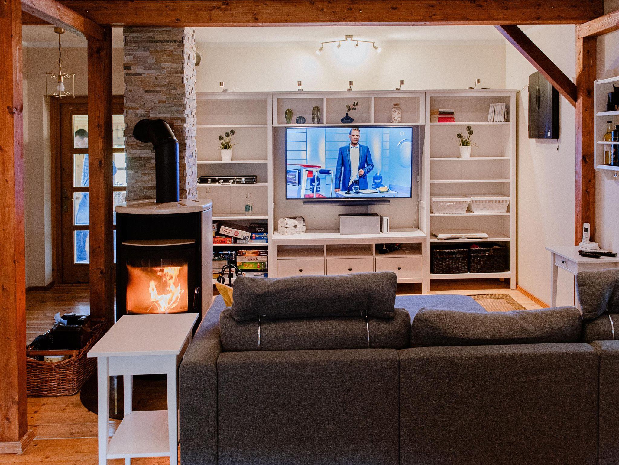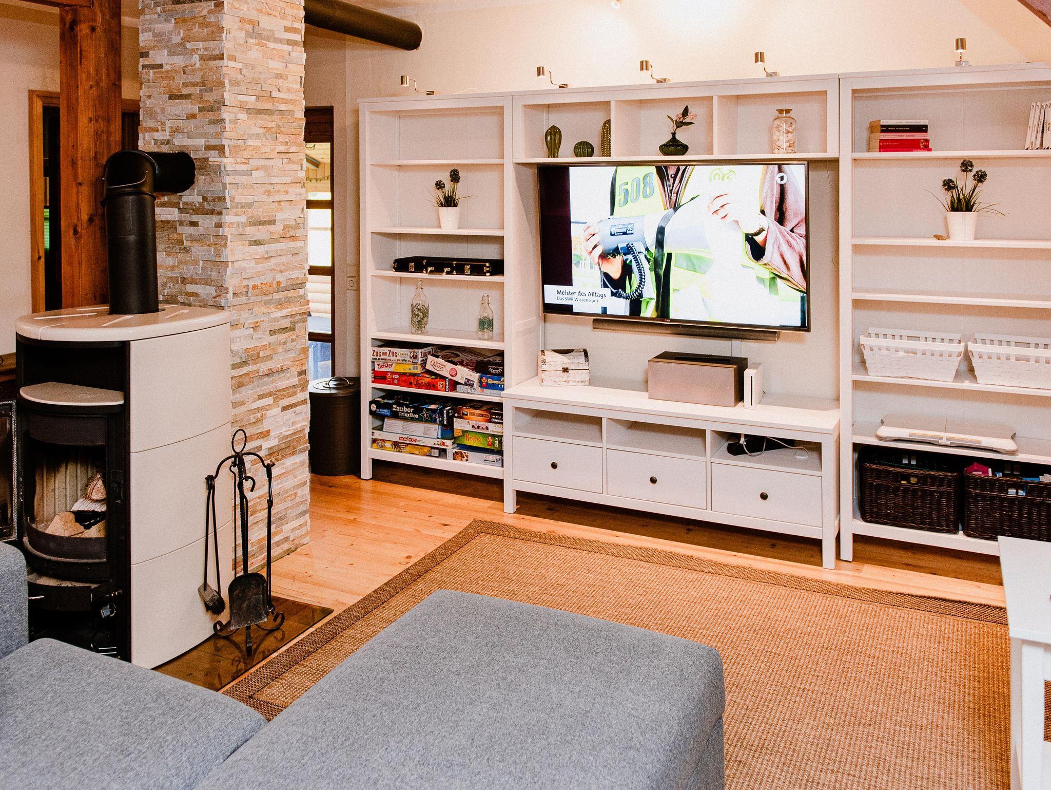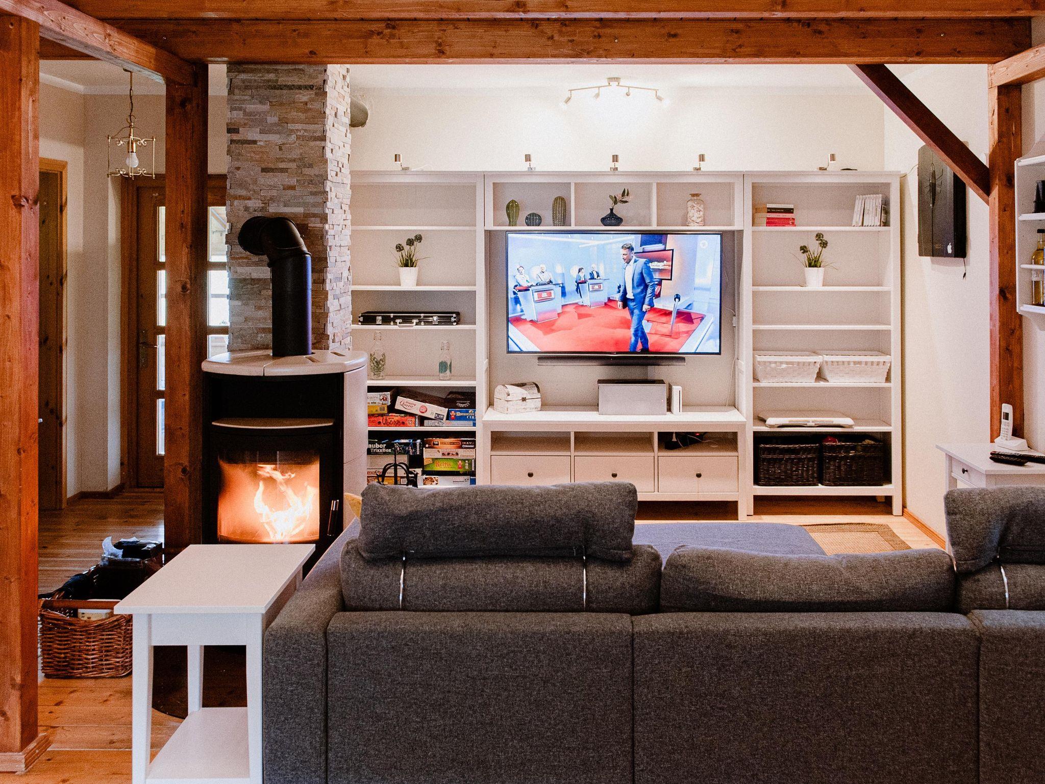 Der große Wohnraum ist ausgestattet mit einem Kamin, das gemütliche Sofa lädt zum lesen, lümmeln und spielen ein. Mit dem großen Flat-TV inkl. Soundbar, der Wii Spielkonsole, einer Dartscheibe, einer großen Anzahl an Brett- spielen und Büchern kommt garantiert keine Langweile auf.