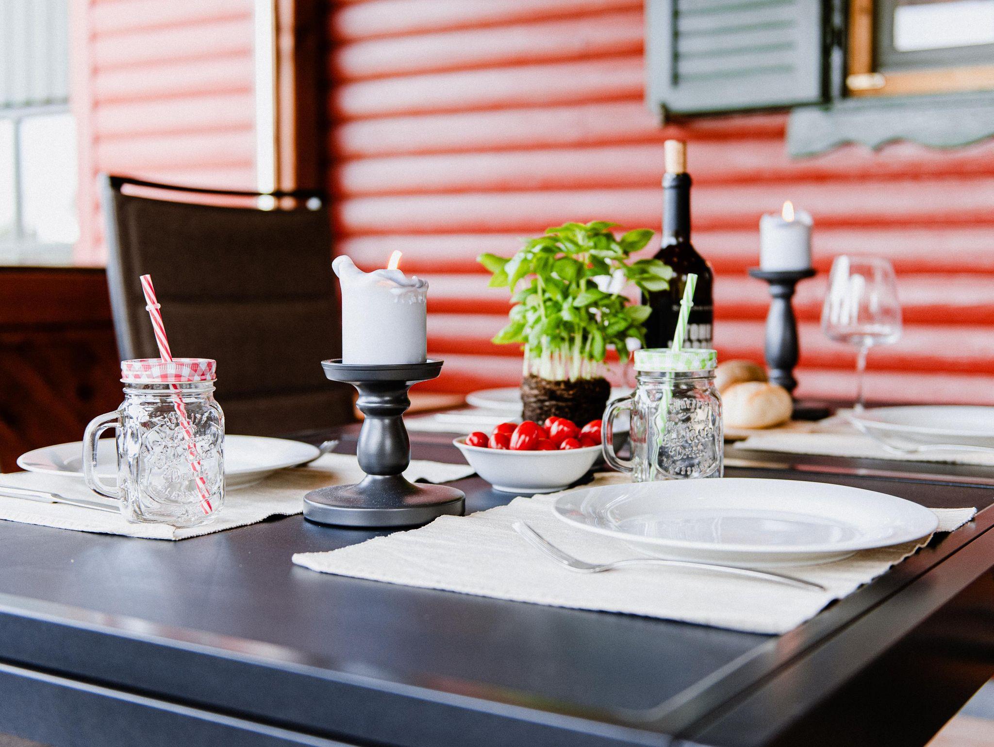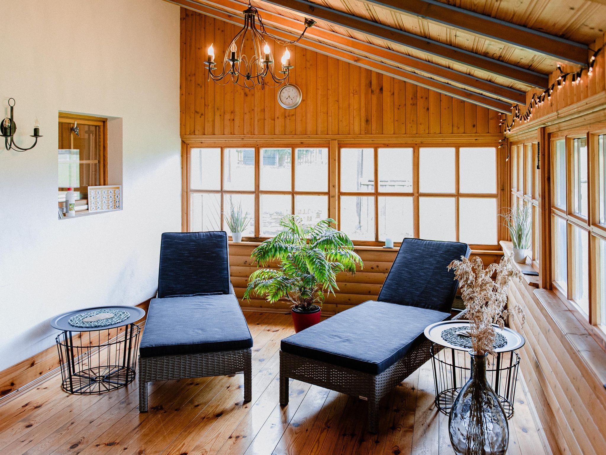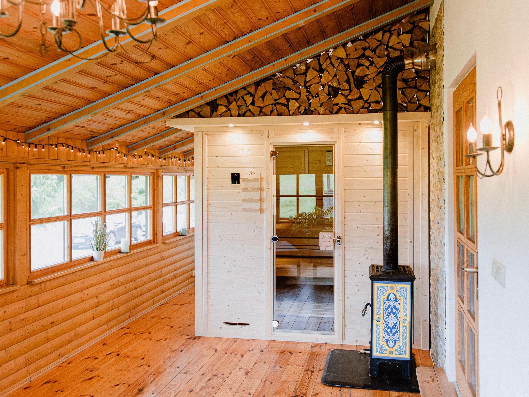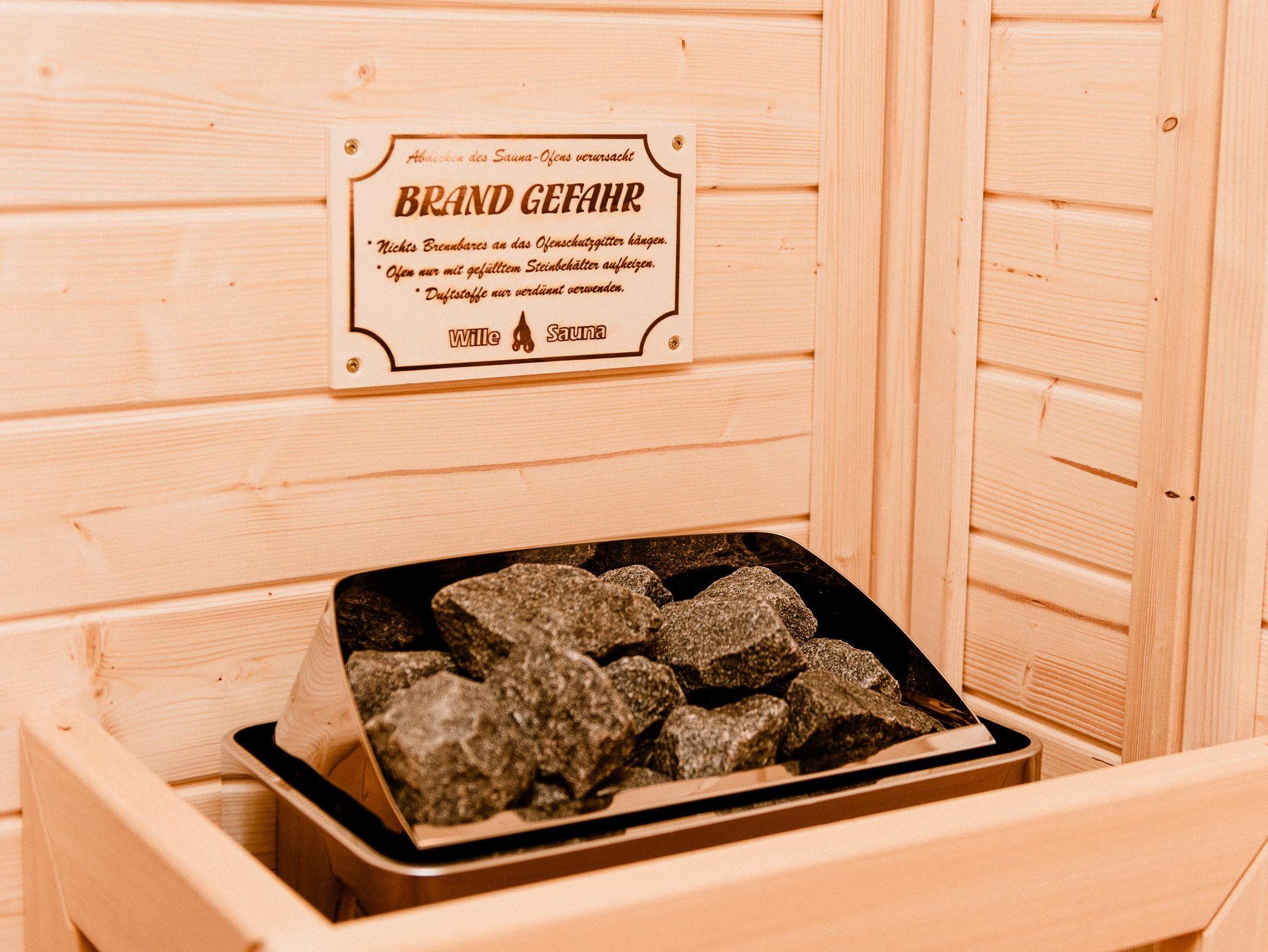 Eine gemütliche finnische Holzsauna mit Blick in die Natur, die überdachten und beheizbaren Terassen und der große Garten bieten viel Raum zum sitzen, essen und genießen. Kaffeeklatsch oder Grillabend. Als Familie zusammen sitzen, mit Freunden feiern aber auch mal in Ruhe arbeiten ist hier kein Problem.