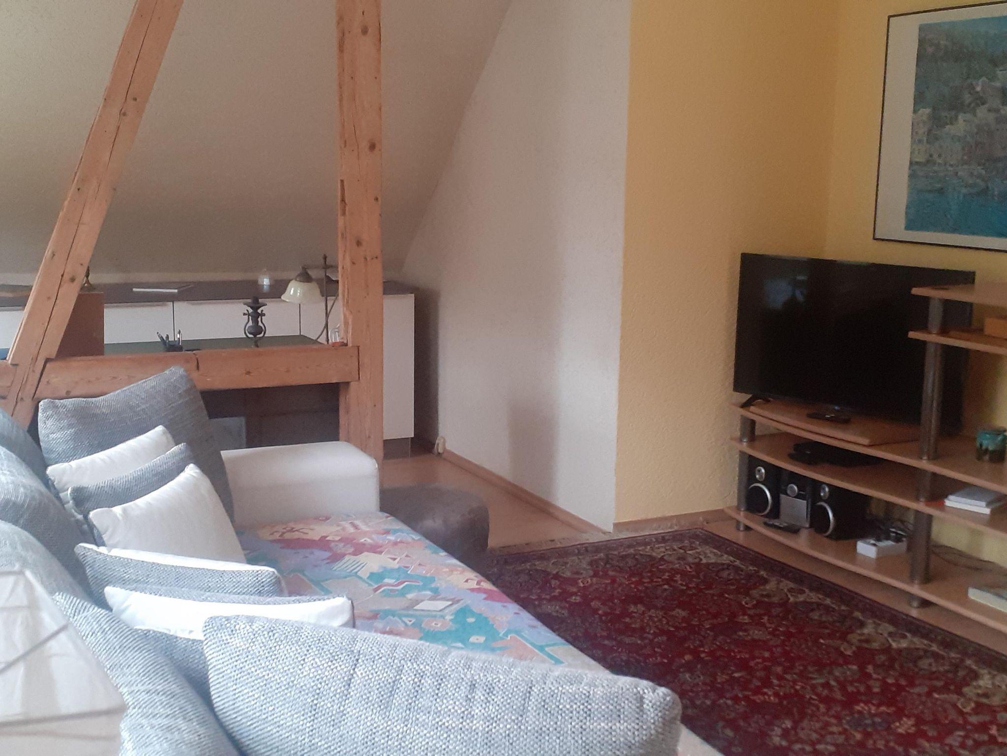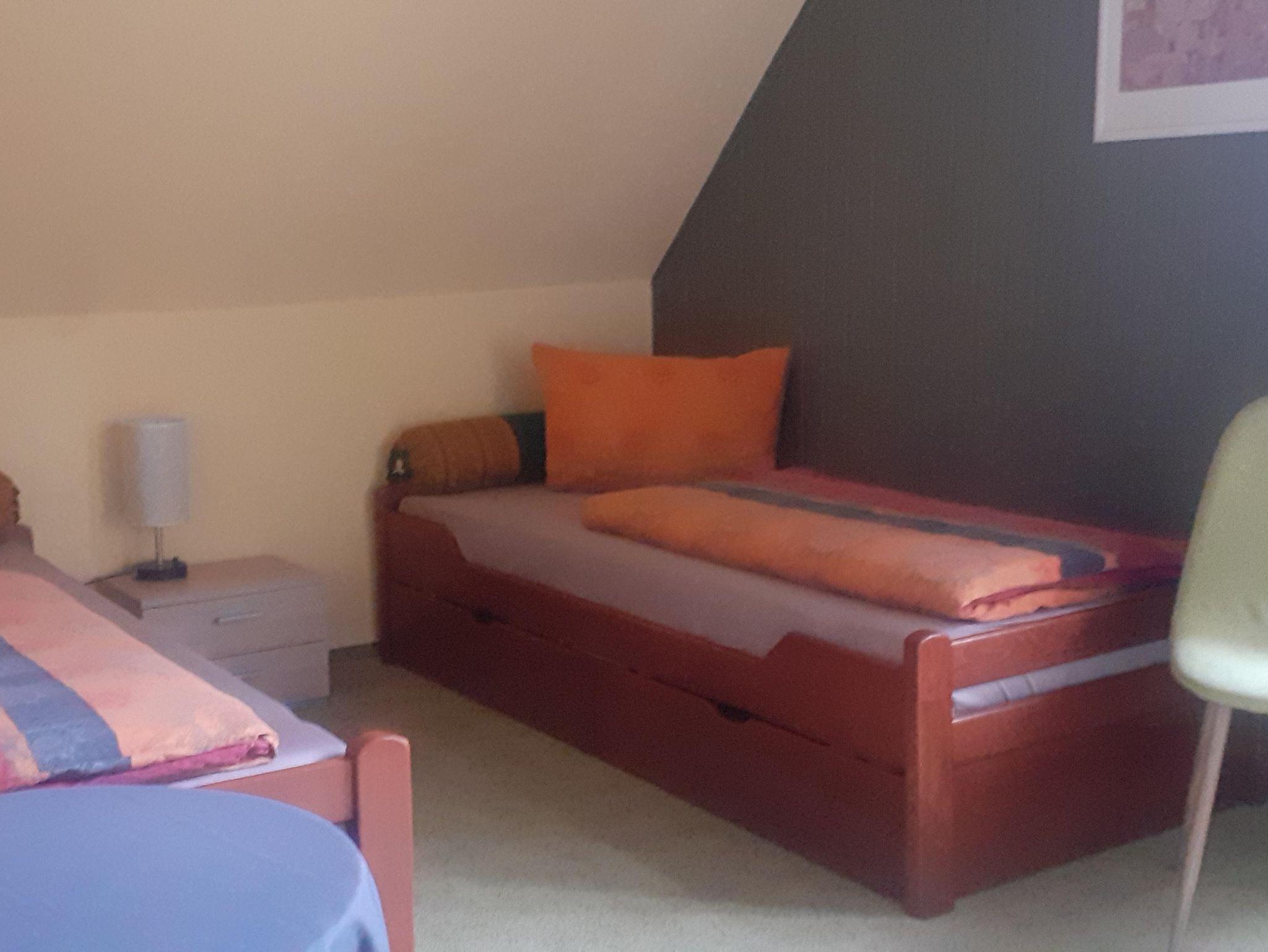 Die 70 qm große Ferienwohnung liegt im Dachgeschoß und verfügt über einen großen Wohnbereich mit Schlafsofa, TV, 2 Schlafzimmer, Küche mit Essplatz, Küchengeräte, Geschirrspülmaschine, E-Herd. Balkon. Bad mit Dusche. Balkon. PKW-Stellplatz auf dem Grundstück. Bettwäsche, Handtücher in der Erstausstattung vorhanden. Endreinigung inclusive.