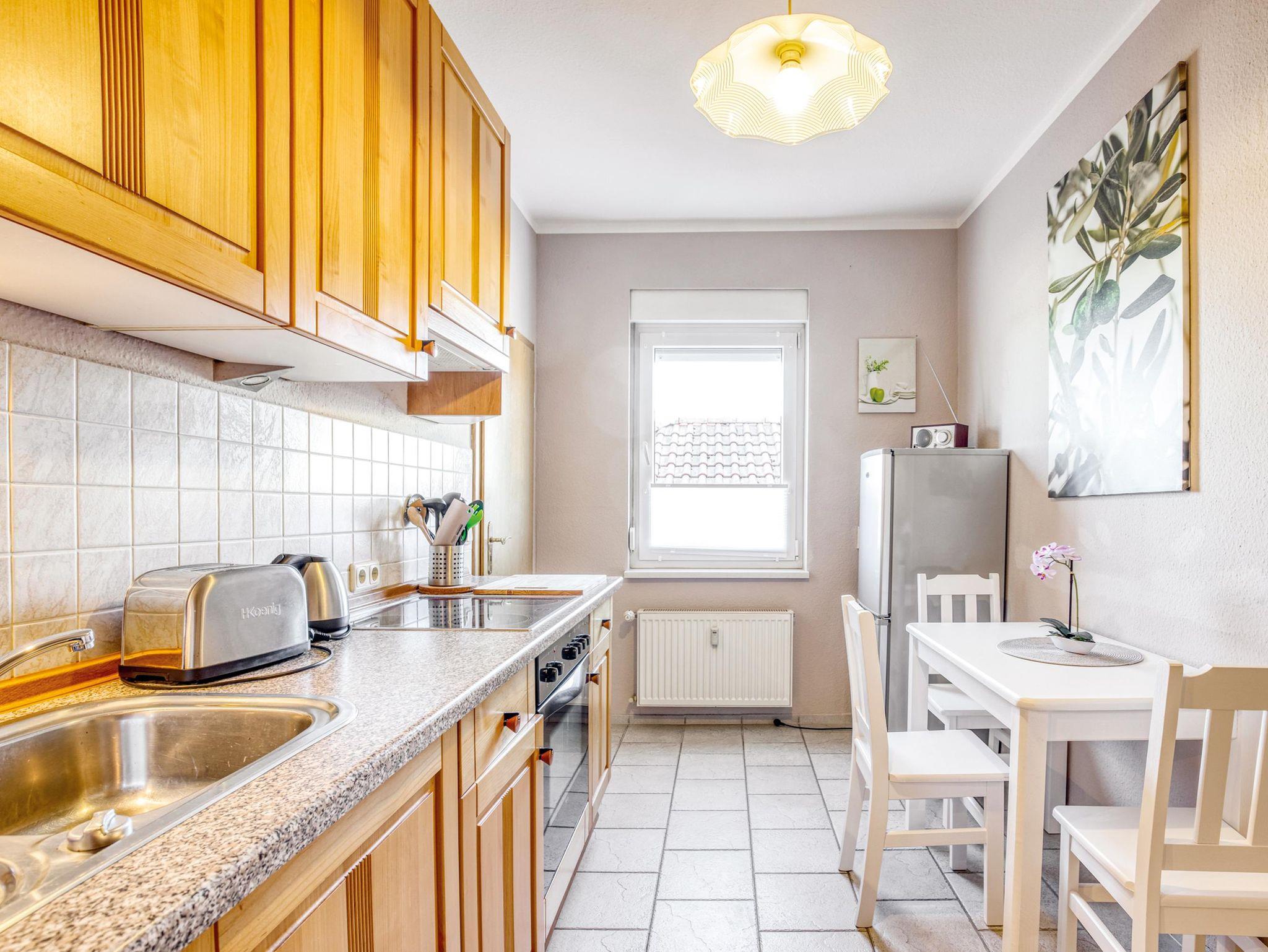Sie werden eine 35 qm² helle modern eingerichtete Wohnung vorfinden. Das kleine Schlafzimmer mit großen Schrank läßt Sie neue Kräfte für den neuen Tag sammeln. Beachten Sie bitte unsere Bilder, dass das Bett nur einen Eingang hat. Das Wohnzimmer mit Schlafcouch für eine Person lädt zur Planung von Ausflügen aber auch zum Kuscheln oder geselligem Beisammensein ein. Der im Wohnzimmer befindliche Essbereich mit Blick auf die Hauptstraße, läßt Sie den Tag gemütlich beginnen oder ausklingen. Die Küche bietet Ihnen alle Möglichkeiten für die Essenzubereitung. Das Bad mit Fenster und Dusche läßt keine Fragen offen.