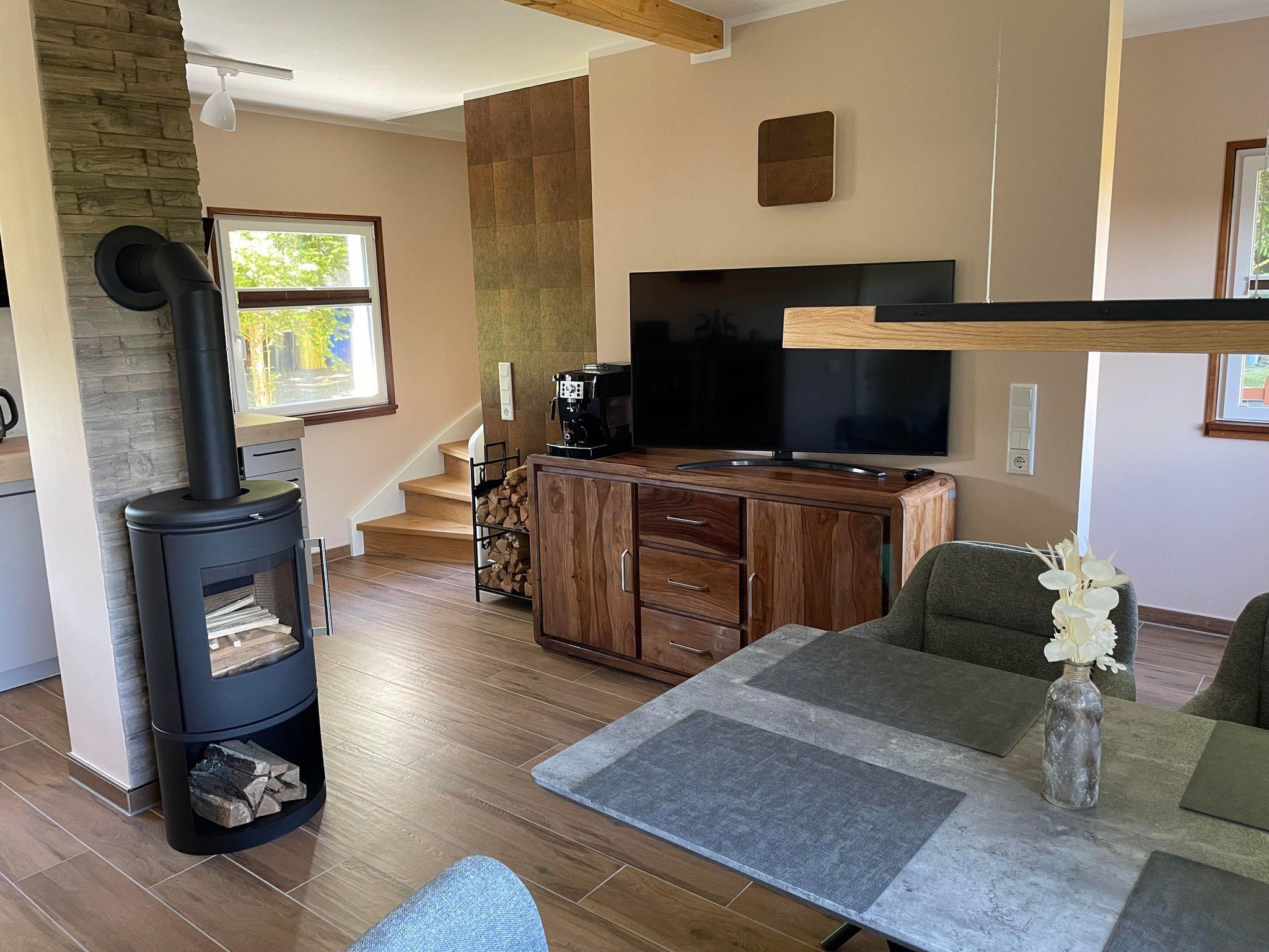 Unser lichtdurchflutetes Wohnzimmer ist mit einem Flachbild-TV und DAB-Radio ausgestattet. Auch ohne Sofa können es sich 4 Personen in den gemütlichen Drehsesseln am Kamin gemütlich machen.