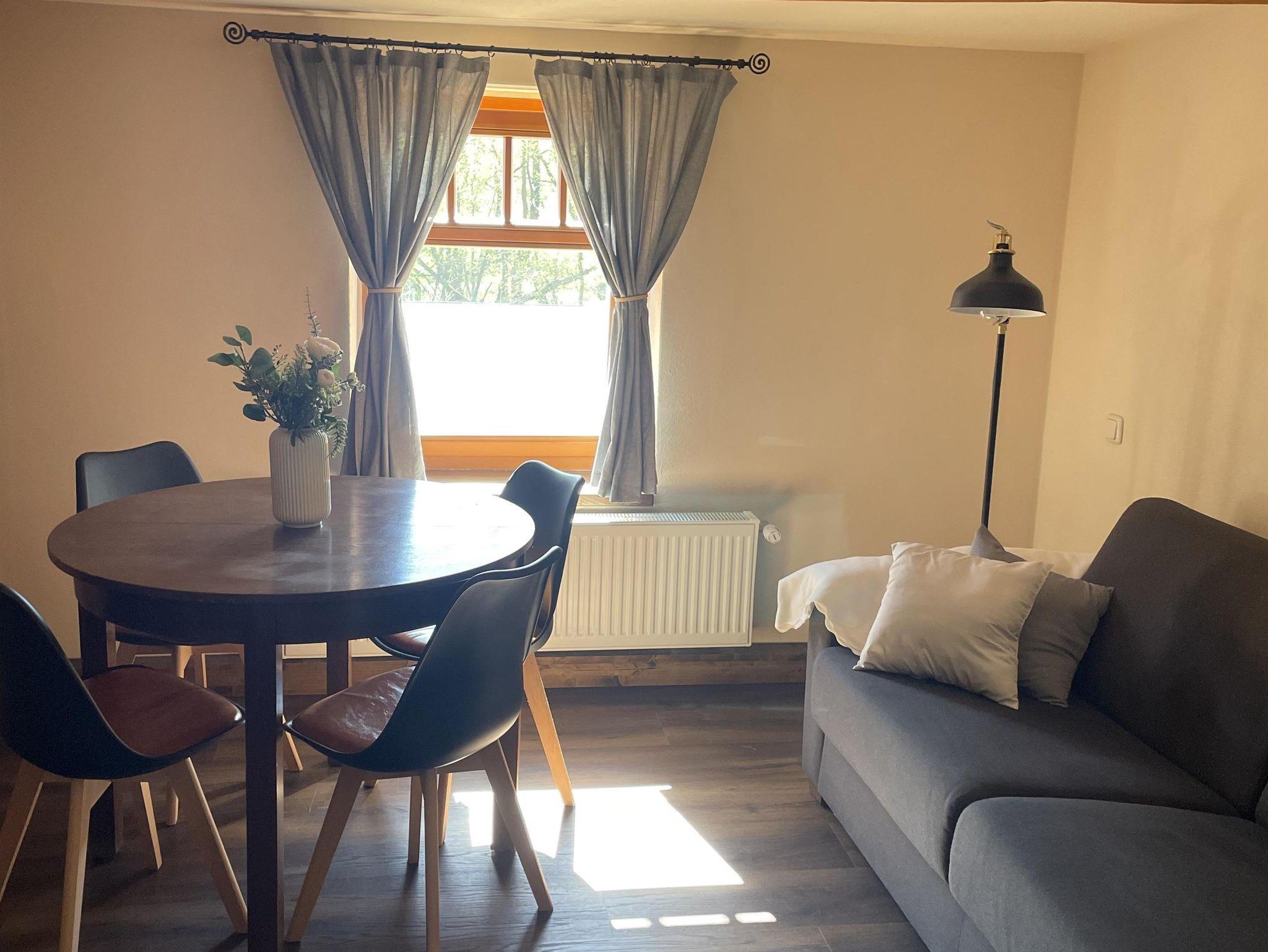 Wohnzimmer mit Esstisch + 4 Stühlen / Couch