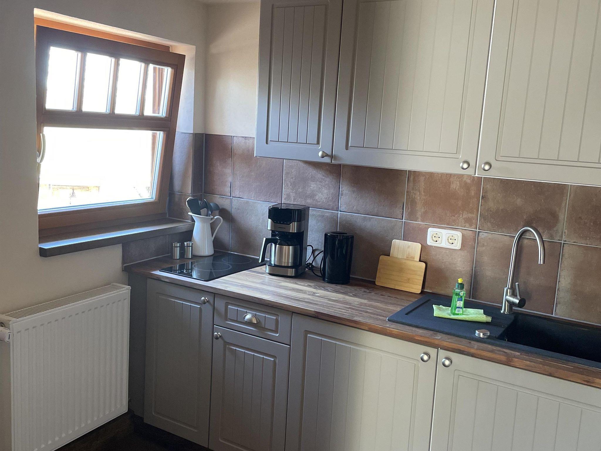 Küche ausgestattet mit Kühlschrank, 2-Platten-Kochfeld, Kaffeemaschine, Wasserkocher