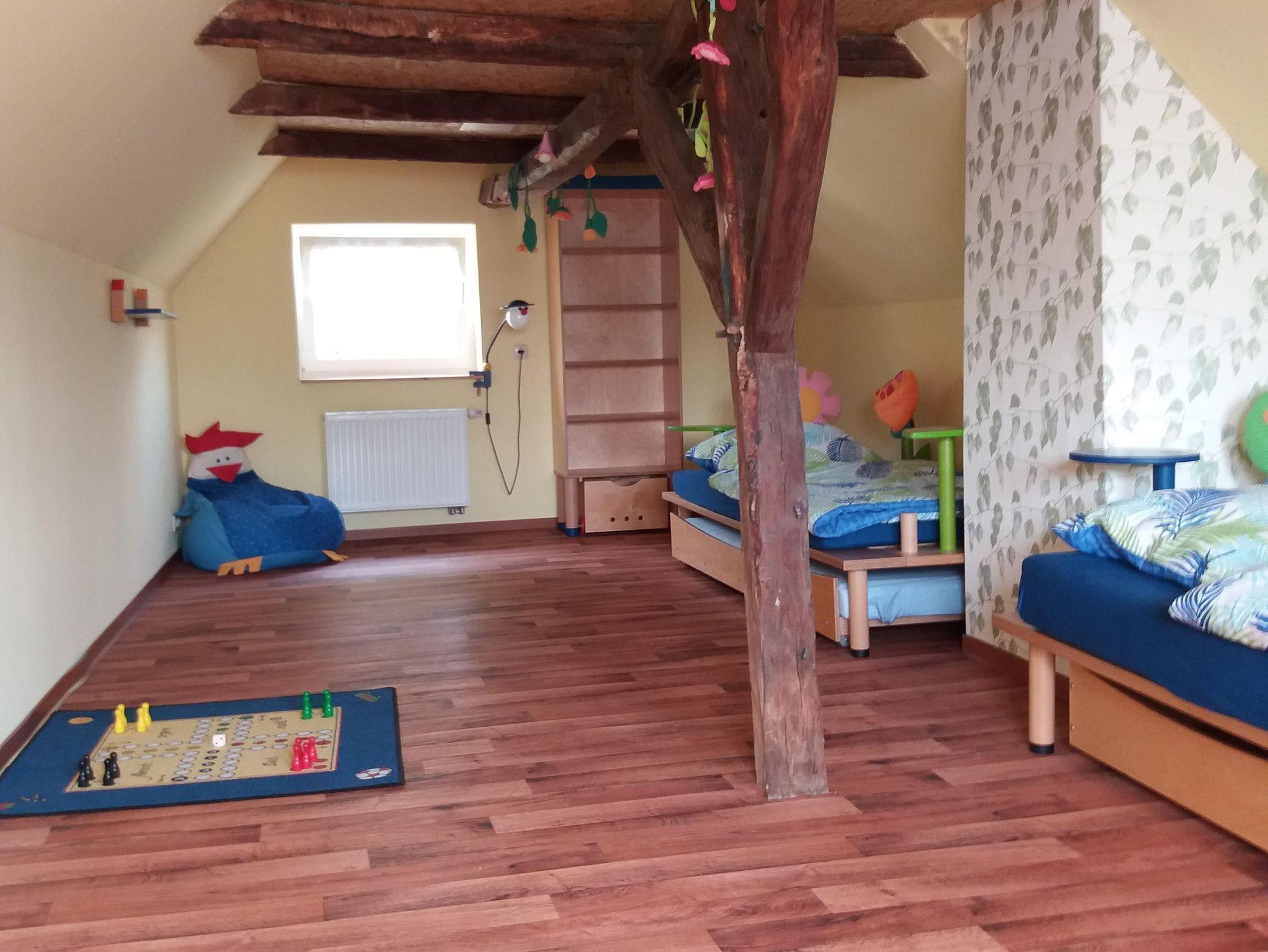 Auf dem Gelände können Federballspiele, Bälle, Himmel-und Hölle sowie ein Sandkasten genutzt werden.