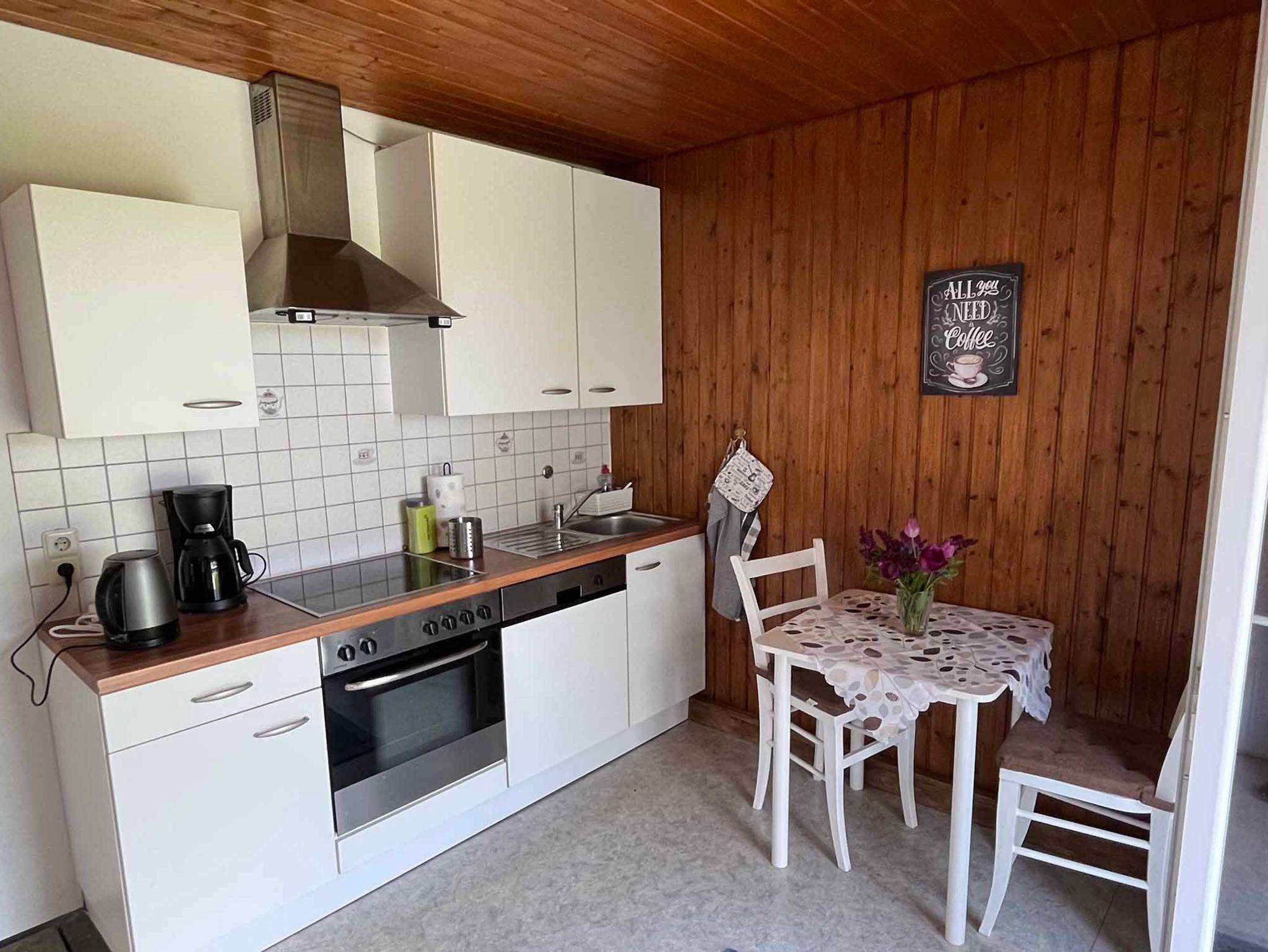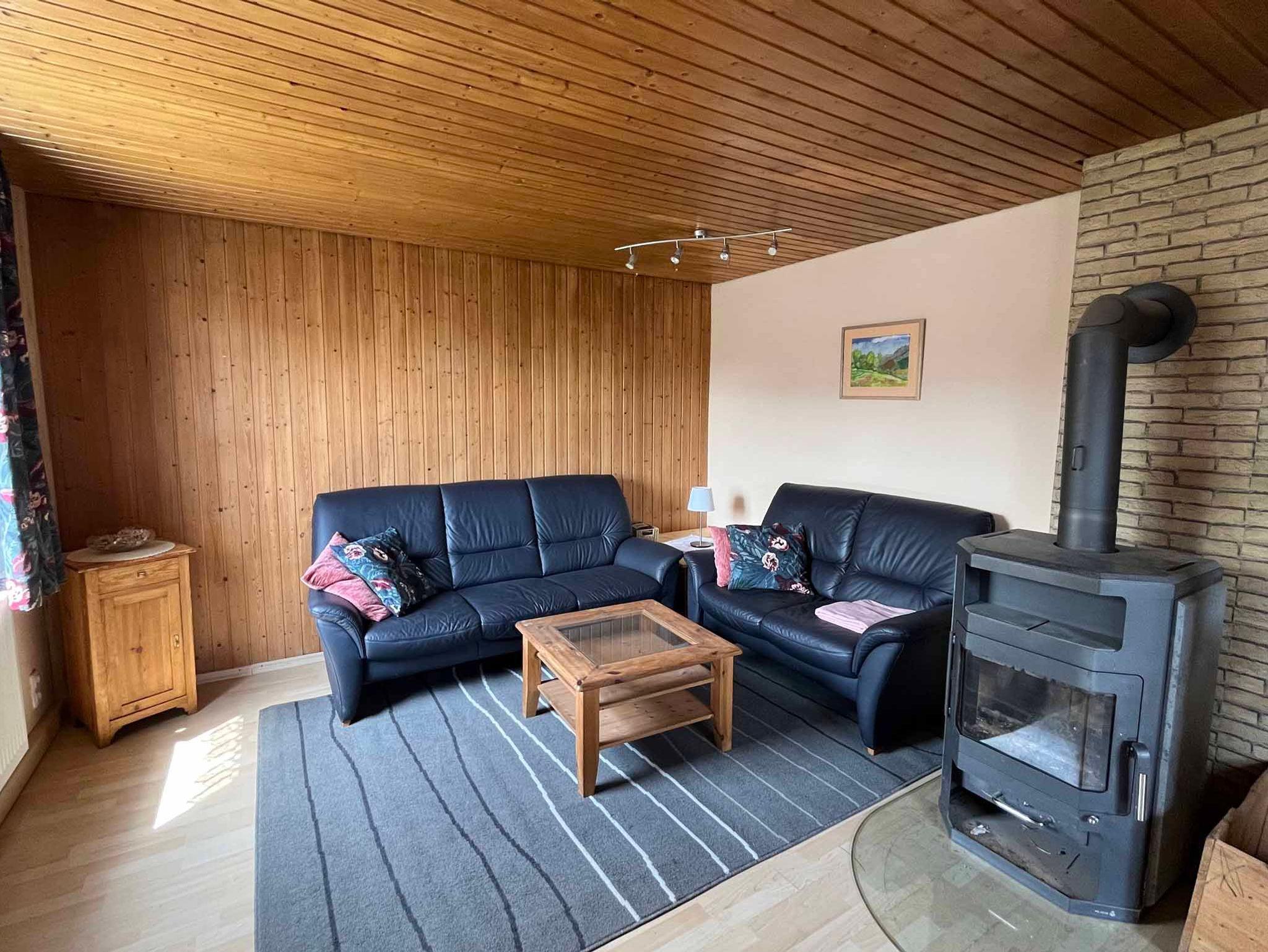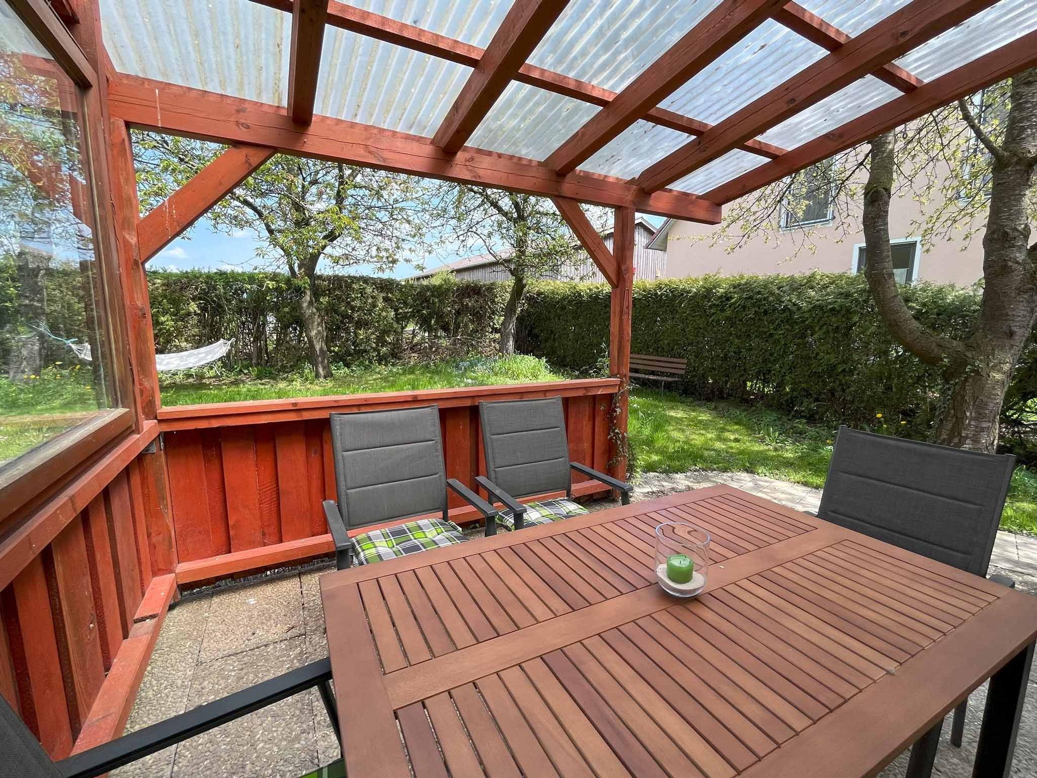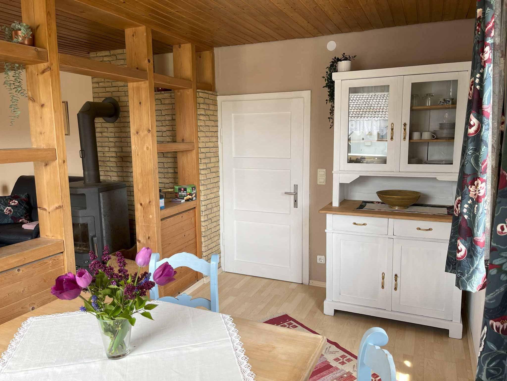 Auf 80qm ist Platz für 4 Personen. Im Obergeschoss befindet sich das Schlafzimmer mit zwei Betten, auf Anfrage kann ein Kinderbett dazu gestellt werden. Im Vorraum sind zwei weitere Schlafplätze. Im Erdgeschoss befindet sich der große, sonnige Wohn- und Essbereich, mit Kaminofen und TV, ein kleines Badezimmer und eine separate Toilette. Die Küche ist gut ausgestattet, eine Spülmaschine ist vorhanden. Von der Küche aus gibt es einen direkten Zugang zum großen Garten. am Haus ist ein überdachter Freisitz, in dem man gemütliche Abende verbringen kann. Ein Grill ist vorhanden.