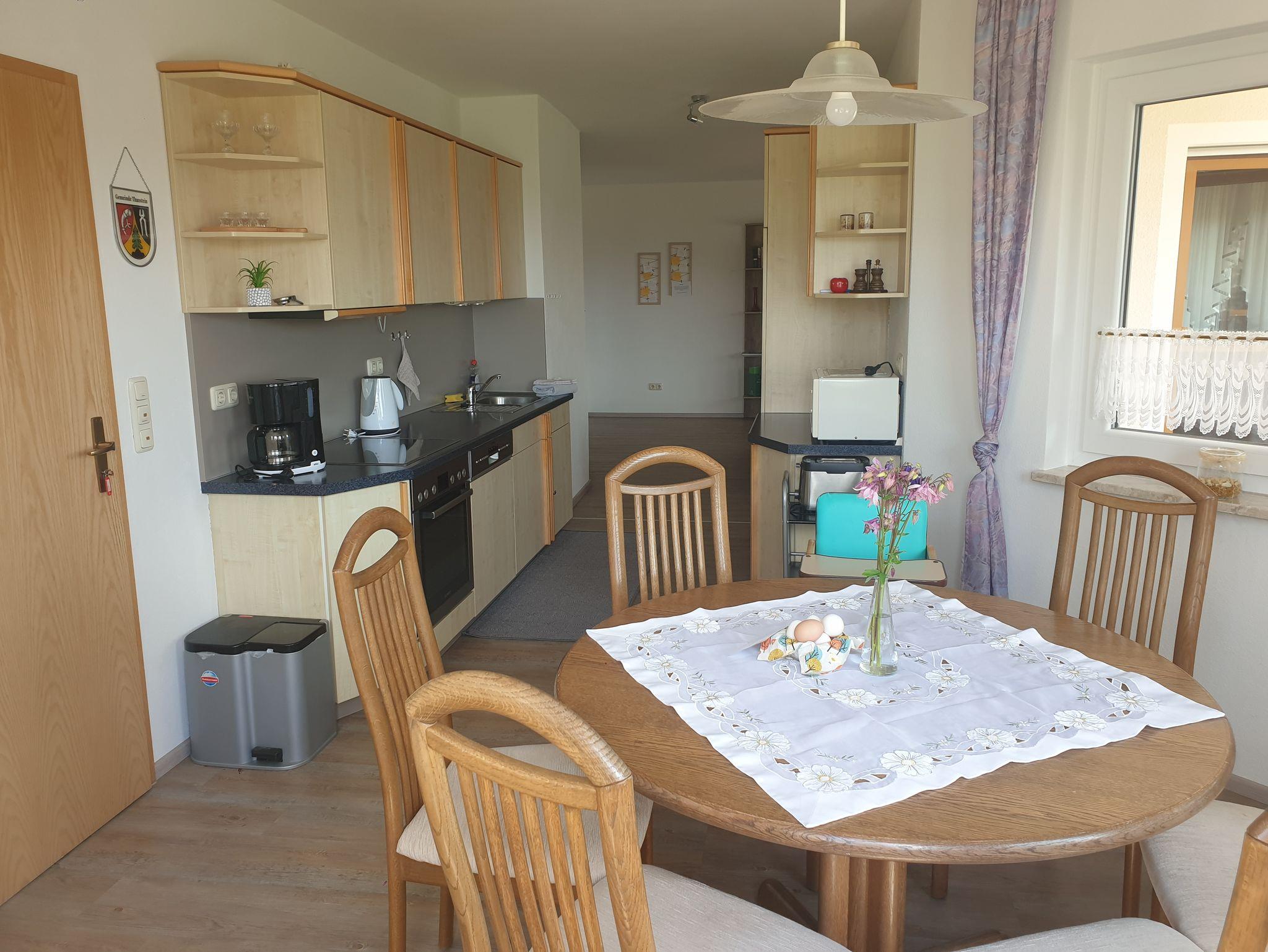 Unsere 108qm große Ferienwohnung im Parterre ist sehr komfortabel ausgestattet. Die Wohnung verfügt über einen separaten Eingang, eine Wohnküche, ein Wohnzimmer mit Couch und Flachbild-TV, 2 Schlafräume, ein Bad mit WC und ebenerdiger Dusche und eine überdachte Terrasse. Die Wohnküche ist ausgestattet mit Backofen, Glaskeramikfeld, Mikrowelle, Geschirrspülmaschine, Kühlschrank mit Gefrierfach, Toaster, Kaffeemaschine und Kaffeepadmaschine, elektrische Brotmaschine, Wasserkocher und Eierkocher. Die beiden Schlafräume sind mit einem Doppelbett 1,80m x 2,00m mit einem erhöhten Betteinstieg ausgestattet und eines zusätzlich mit einem Einzelbett. Unsere Bettdecken haben eine Überlänge (155cmx220cm). Von der großen überdachten Terrasse zur Alleinnutzung haben Sie einen herrlichen Blick ins Tal! Auf der Terrasse finden Sie eine Grillmöglichkeit vor. In der Unterkunft erwartet Sie kostenfreies WLAN. Im Garten befindet sich ein Spielplatz für die Kinder. Für die kleinen Gäste ist ein Gitterbett und ein Hochstuhl vorhanden.