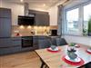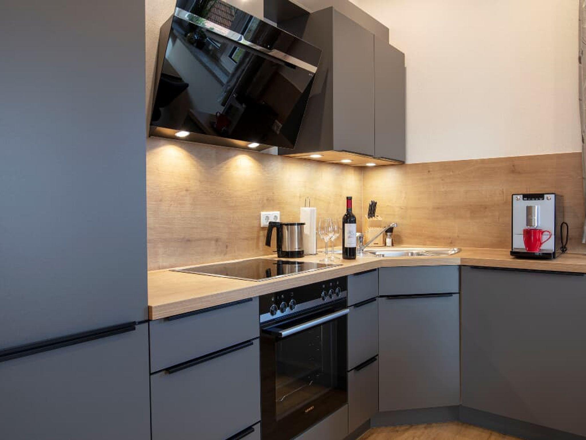 Eine komplett ausgestattete Küche mit Kaffeevollautomat lässt Sie gut in den Tag starten. Ein Balkon ist mit Stühlen und Tisch ausgestattet.