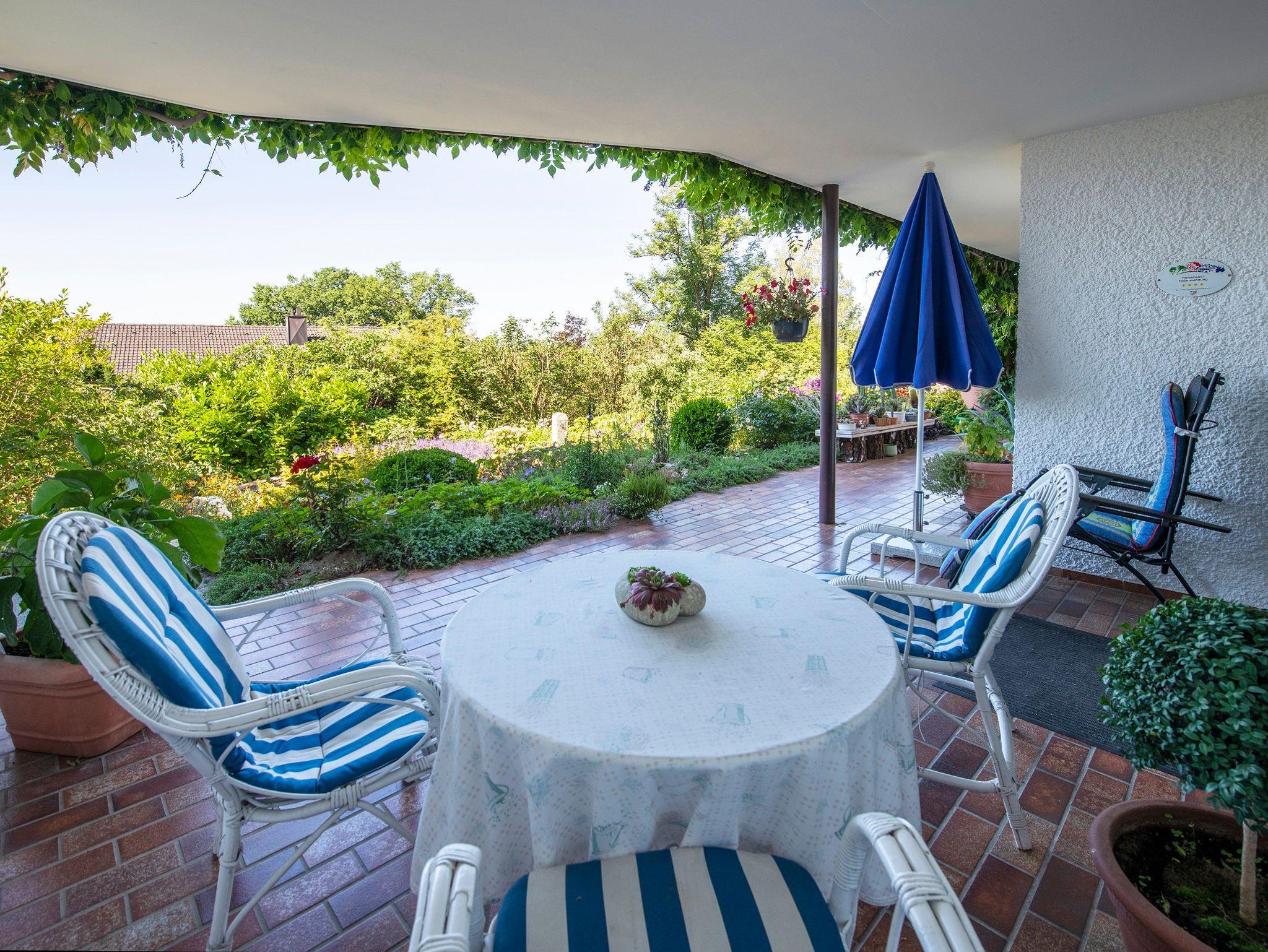 Die Ferienwohnung hat 56 qm mit einem Schlafzimmer (Doppelbett 180x200 cm) mit Zugang zur Terrasse und einem Bad mit Dusche/WC. Die Wohnküche ist voll ausgestattet, der Wohnraum verfügt über SAT-TV und CD-Player. Die Terrasse ist mit Liege, Terrassenmöbeln, Sonnenschirm und Grill ausgestattet. Bettwäsche, Handtücher und WLAN im Zimmer können kostenfrei genutzt werden. Eine kostenlose Bahnabholung ist inbegriffen, wie auch ein Begrüßungsdrink und ein selbstgebackener Kuchen. WLAN frei.