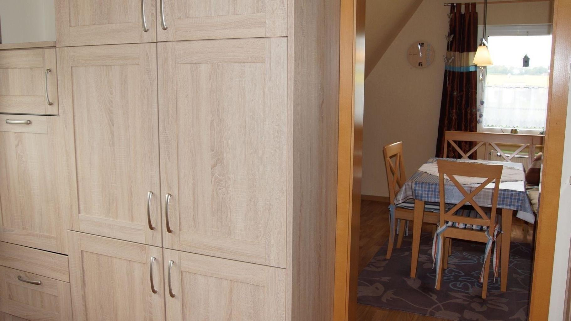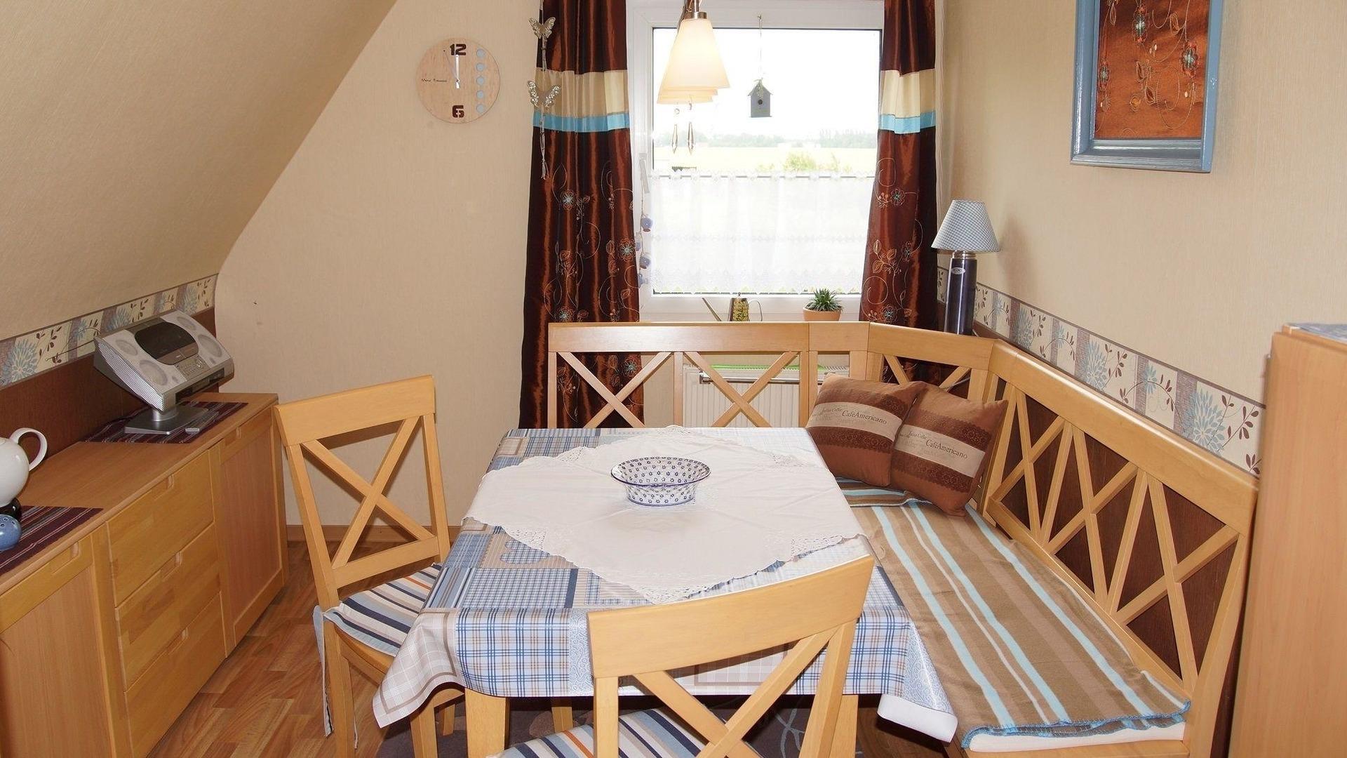 Die Küche hat ein angrenzendes Esszimmer mit Eckbank und ist mit einer modernen Einbauküche, Geschirrspüler und Induktionsherd, Geschirr, Besteck ausgestattet.