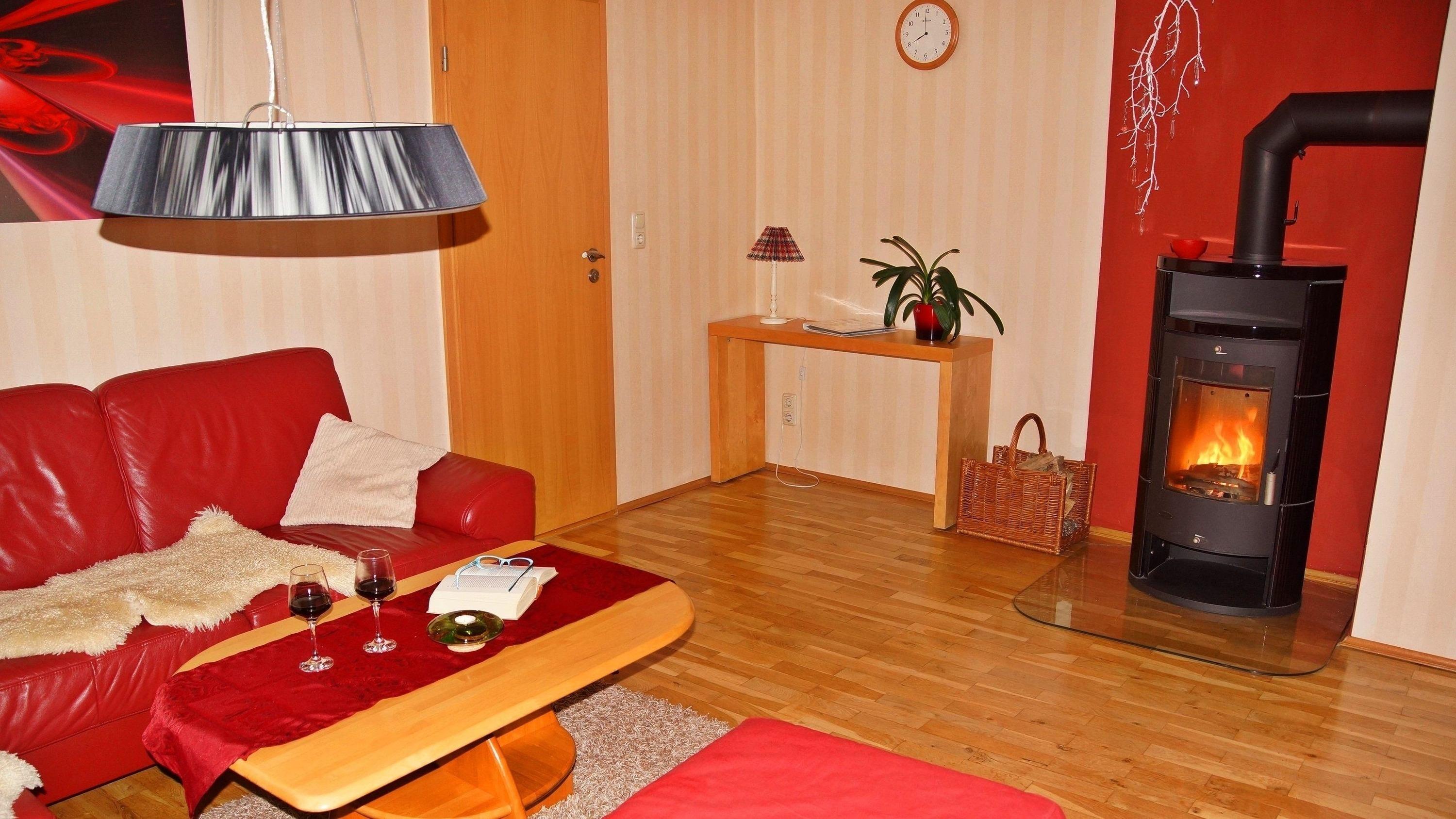 Im Wohnzimmer finden Sie eine große, gemütliche Ledercouch, die sich bei Bedarf auch zu einem Schlafplatz umfunktionieren lässt. An kalten Abenden können Sie sich hier zudem am Kaminofen aufwärmen. Die moderne Einbauküche ist mit Geschirrspüler, Induktionsherd und allem weiteren ausgestattet, was ein Hobbykoch benötigt. In der Sitzecke im angrenzenden Esszimmer können Sie die Mahlzeiten gemeinsam genießen.