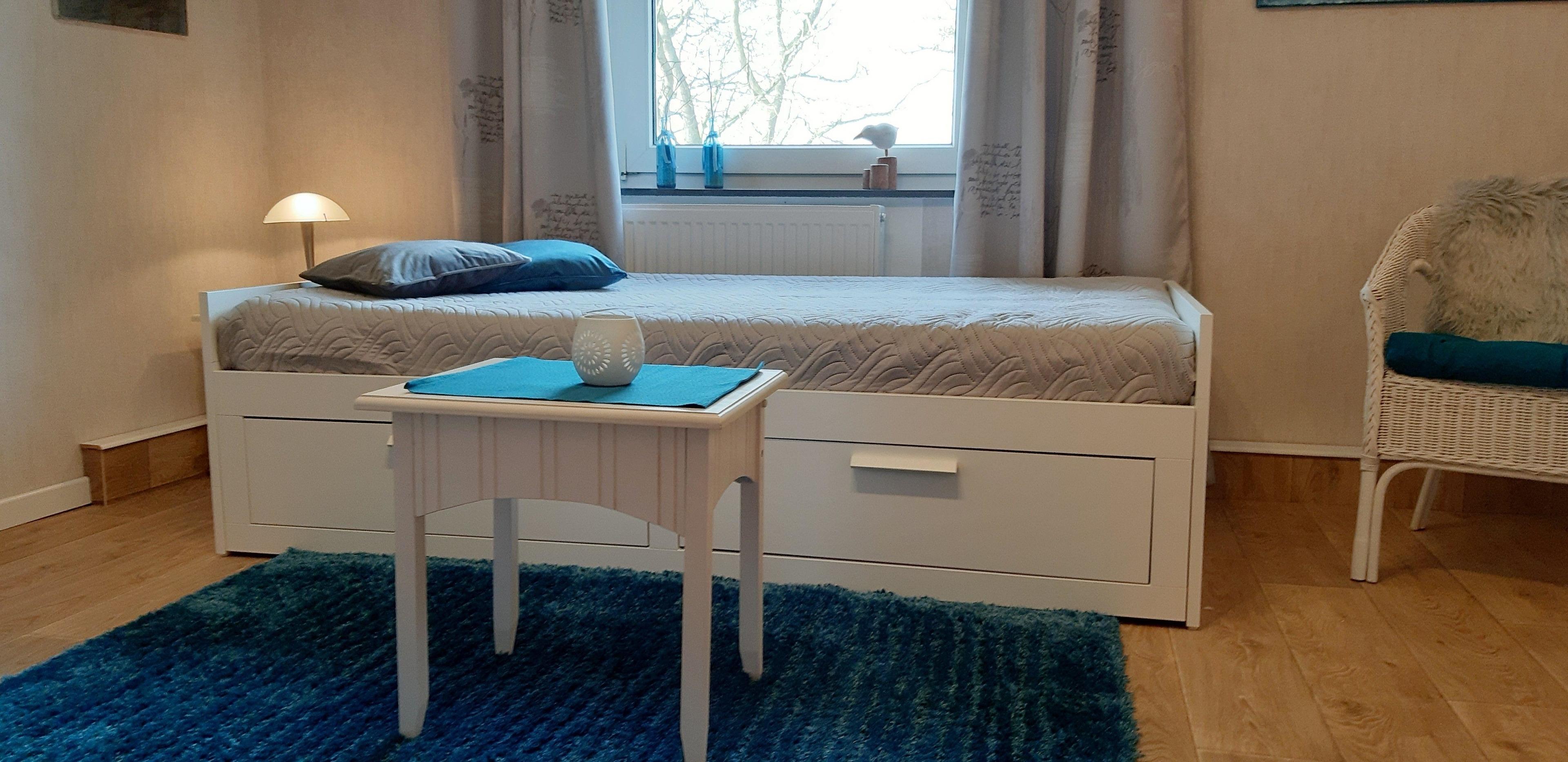 Im Obergeschoss gibt es ein Schlafzimmer in einem Durchgangszimmer. Hier finden Sie ein Tagesbett (80-160 * 200 cm ausziehbar) und einen Kleiderschrank sowie TV.