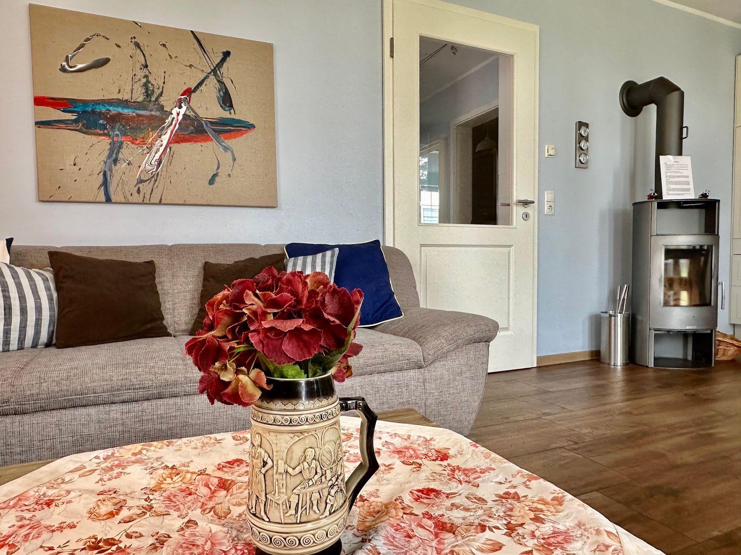 Dieses traumhaft gelegene Apartment genügt höchsten Ansprüchen und wurde mit viel Liebe zum Detail geschmackvoll eingerichtet. Die wunderschöne Nichtraucher-Wohnung liegt im Erdgeschoß und ist gut geeignet für Familien mit Kindern und ältere Gäste. Mit 55 qm Wohnfläche bietet sie genug Platz für 2 Erwachsene, 1 Kind und ein kleines Kind bis 3 Jahren im Kinderreisebett. Die Wohnung hat drei Zimmer und modern ausgestattetes Bad mit einer ebenerdigen Dusche. Der helle Wohn/Essbereich mit großer Fensterfront bietet einen wunderbaren Blick auf den großen Garten. Die Küche ist eingebunden in den Wohn/Essbereich und mit Cerankochfeld, Kühlschrank, Geschirrspüler, Mikrowelle, Wasserkocher, Kaffeemaschine, Toaster und vielen Küchenhelfern ausgestattet. Im Essbereich steht ein massiver Esstisch mit 4 Stühlen. Der Wohnbereich ist im Landhausstyle eingerichtet, hier befindet sich eine gemütliche Sitzecke mit einer Couch, einem bequemen Ohrensessel, ein Sideboard und Couchtisch. Die HiFi Ausstattung besteht aus einer CD und Blue-Ray Soundbar und natürlich einem Full-HD Fernseher. Für kühlere Tage gibt es einen Kaminofen.