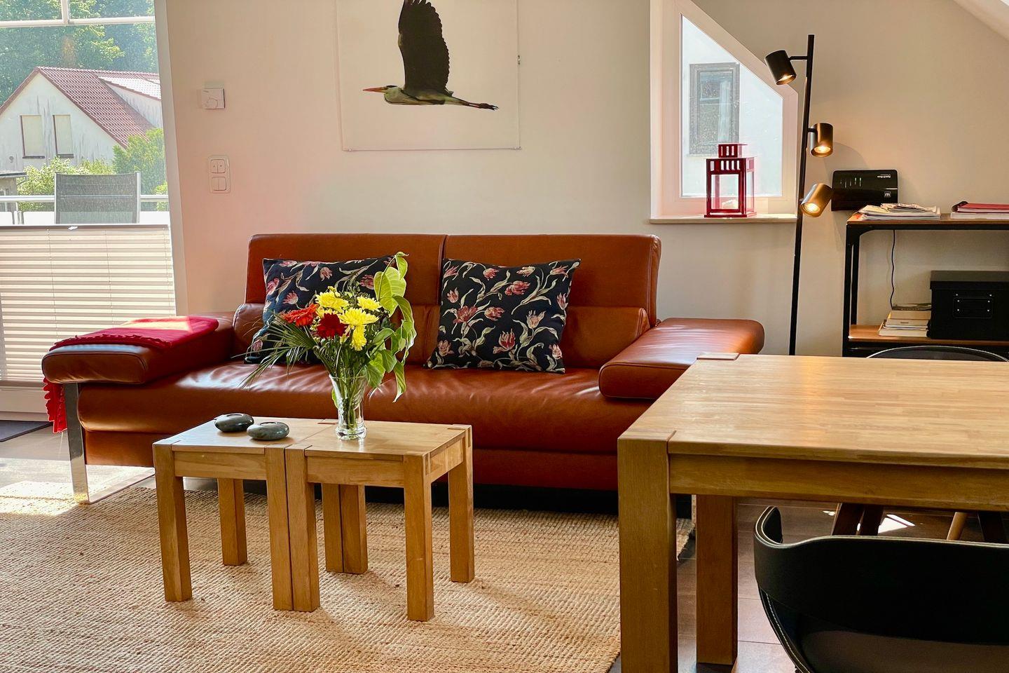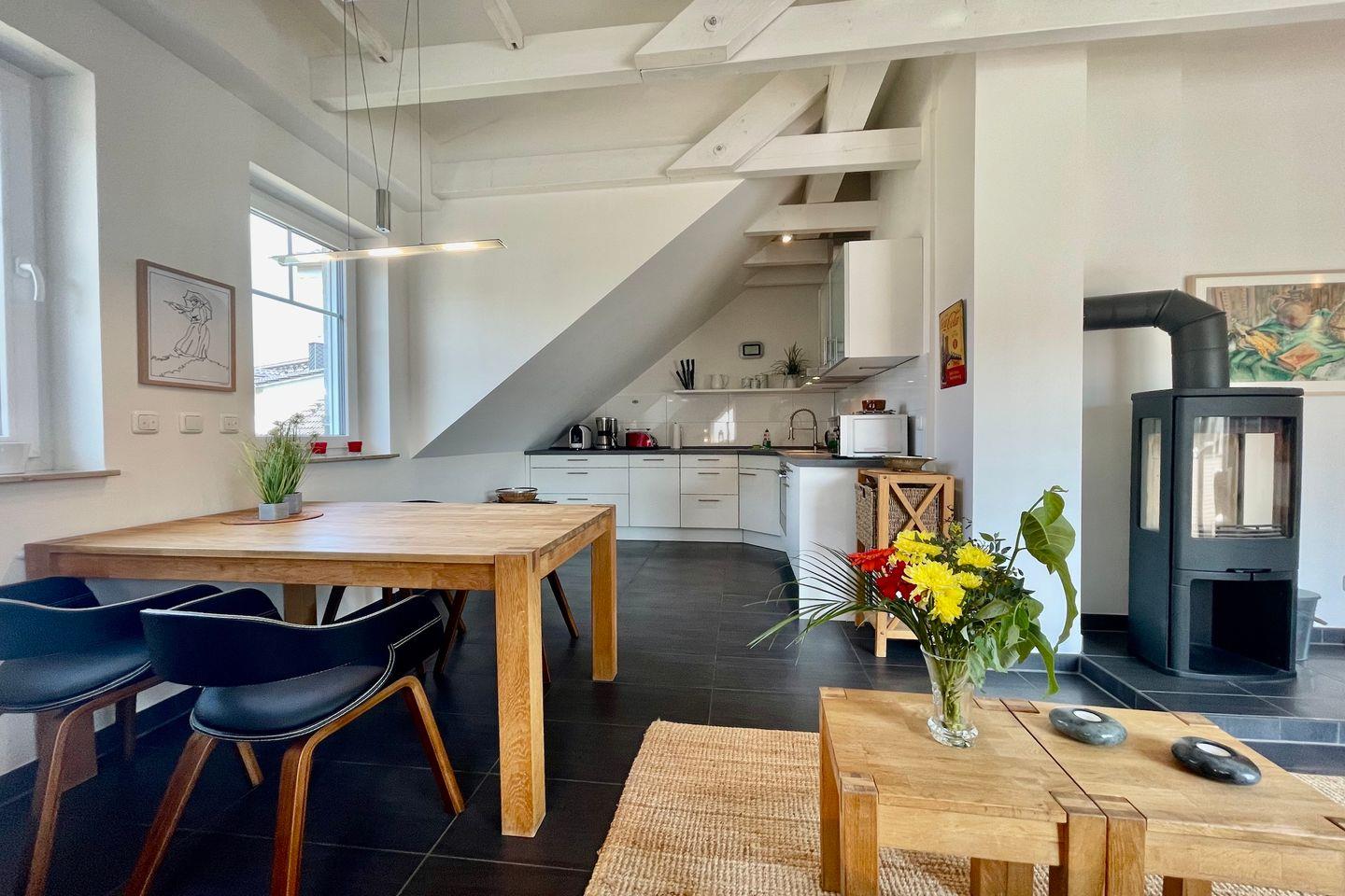 Die 60qm große 3 Zimmer Wohnung liegt im 1.OG. Die lichtdurchflutete Wohnung ist hochwertig ausgestattet. Zur Ausstattung gehören Flat-TV, DAB-Radio, Blu-Ray und CD-Player und kostenloses WLAN. Im großen Wohnzimmer befindet sich neben den modernen Wohn- und Essmöbeln ein Kaminofen. Die volleingerichtete Einbauküche ist mit Ceran-Kochfeld, Mikrowelle, Backofen, Kühlschrank mit Gefrierfach und Spülmaschine, Toaster, Wasserkocher, Kaffemaschine und diversen Küchenutensilien ausgestattet. Im größeren Schlafzimmer befindet sich ein Doppelbett ( 180/ 200 cm ) zusammen mit einem Kleiderschrank, zwei Nachtkommoden sowie 2 Herrendienern. Das zweite Schlafzimmer ist ausgestattet mit einem Etagenbett ( 2x90 x 200cm ), Kleiderschrank und einem kleinen Schreibtisch vor dem Fenster mit wunderschönem Blick. Die Fenster in beiden Schlafzimmern sind mit Insektenschutzgittern, Verdunklungsplisse´s und Rolläden ausgestattet. Das moderne Bad mit großer Dusche hat einen Handtuchheizkörper, Fön, Kosmetikspiegel, Waschmaschiene und einen großen Wandspiegel. Zu der Wohnung gehört ein Hauswirtschaftsraum auf der Etage. Vor dem Haus befindet sich ein kostenloser PKW-Stellplatz sowie ein abschliessbarer Fahrradschuppen.