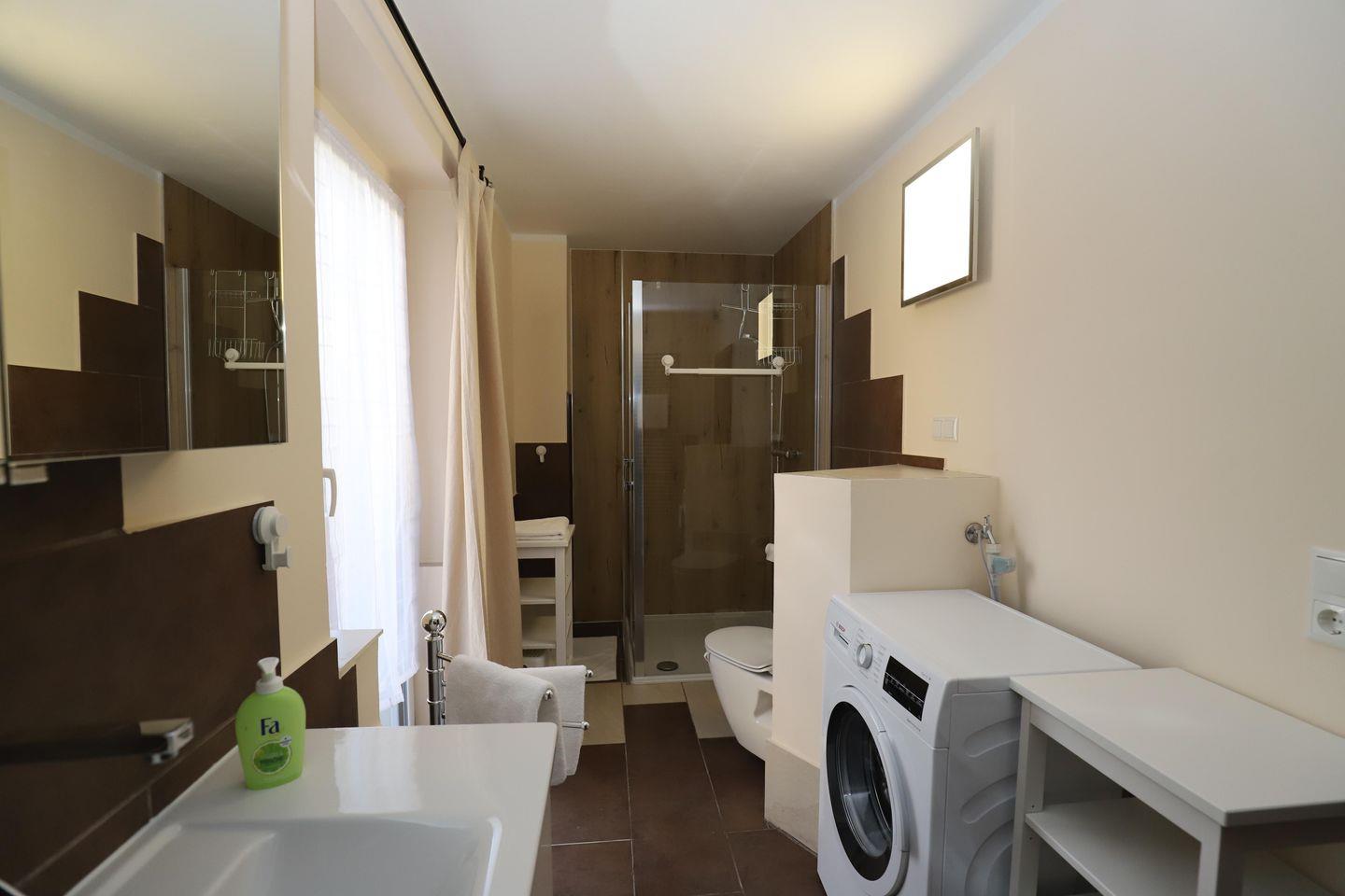 Das große Bad mit einem Balkon hat eine ebenerdige Dusche, WC, ein großes Waschbecken mit Spiegel und eine Waschmaschine.