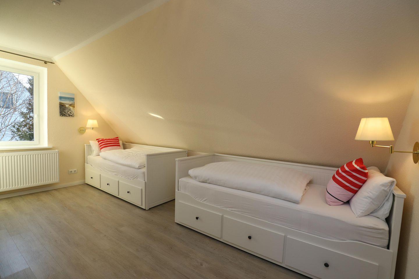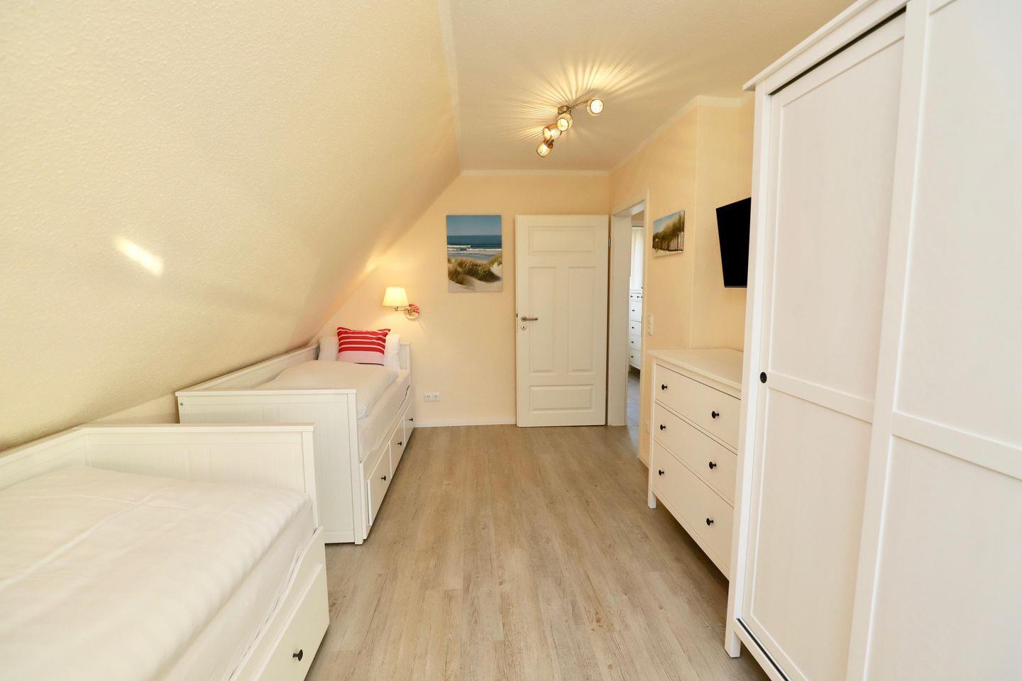 Die Ferienwohnung "Lachmöwe" wurde im Jahr 2020 neu renoviert und modern eingerichtet. Die 110qm große Wohnung für 6 Personen befindet sich im Haus "Meerglück" und erstreckt sich über zwei Etagen. Im Dachgeschoss befinden sich drei Schlafzimmer und ein Bad mit ebenerdiger Dusche. Das erste Schlafzimmer hat ein Doppelbett, eine Kommode, über der sich ein Flachbildschirm befindet, einen Kleiderschrank, zwei Nachttischkommoden. Im zweiten Schlafzimmer sind zwei Einzelbetten mit Nachttischen, ein Kleiderschrank und ein Flachbildschirm. Das dritte Schlafzimmer mit einem fantastischem Blick über die Salzwiesen und den Lotsenberg hat zwei Einzelbetten, eine Kommode und ein Flachbildschirm.