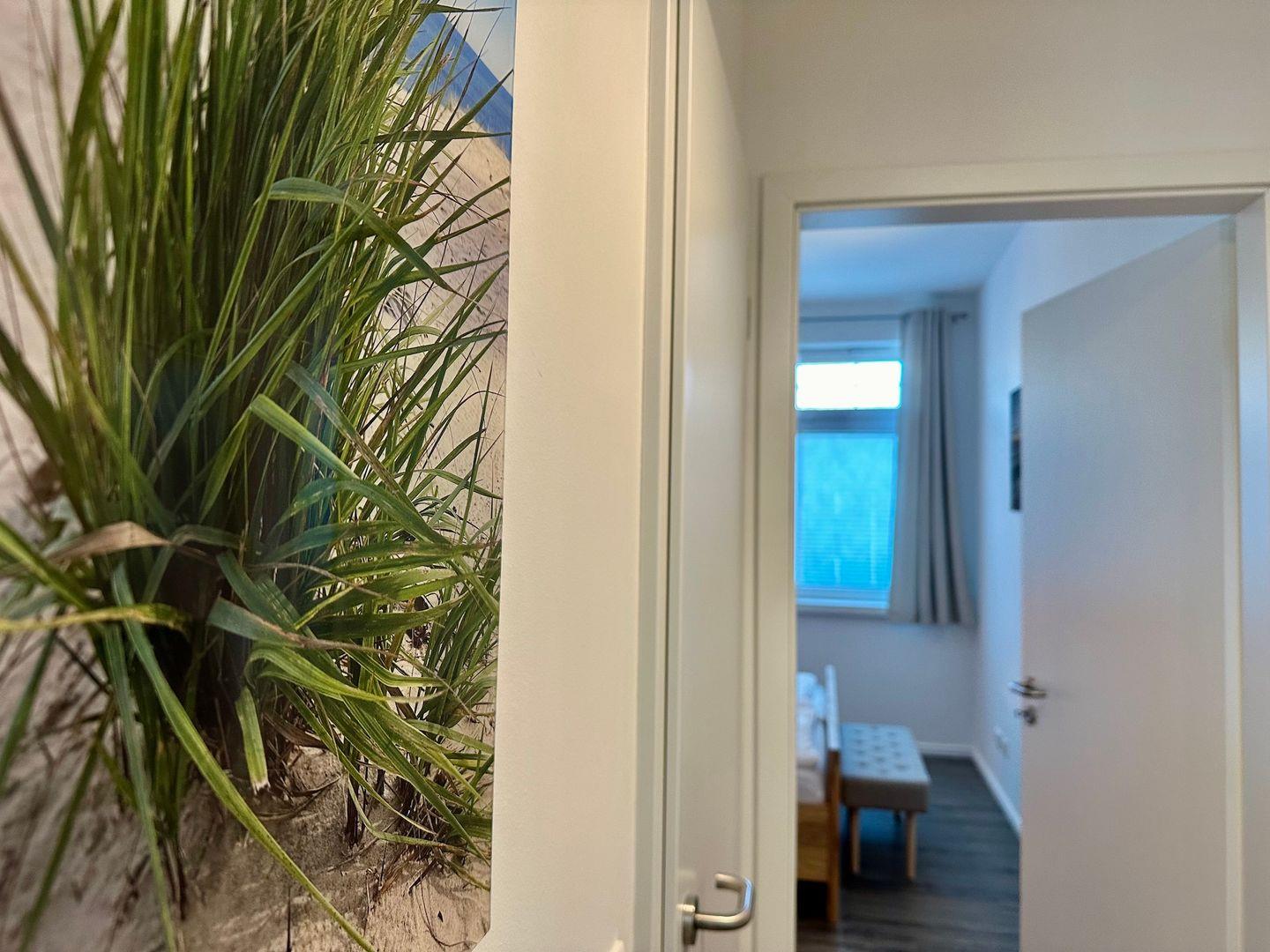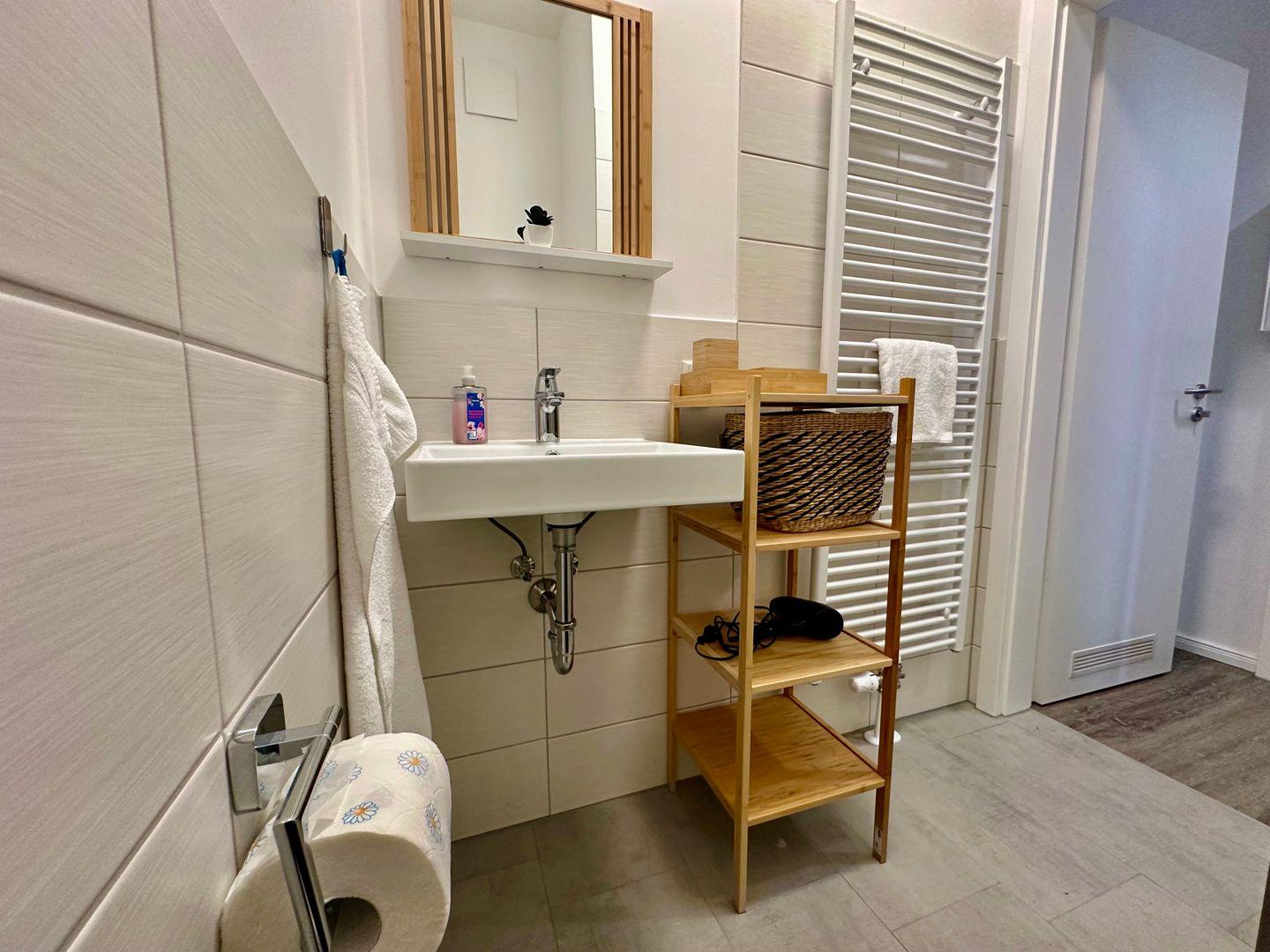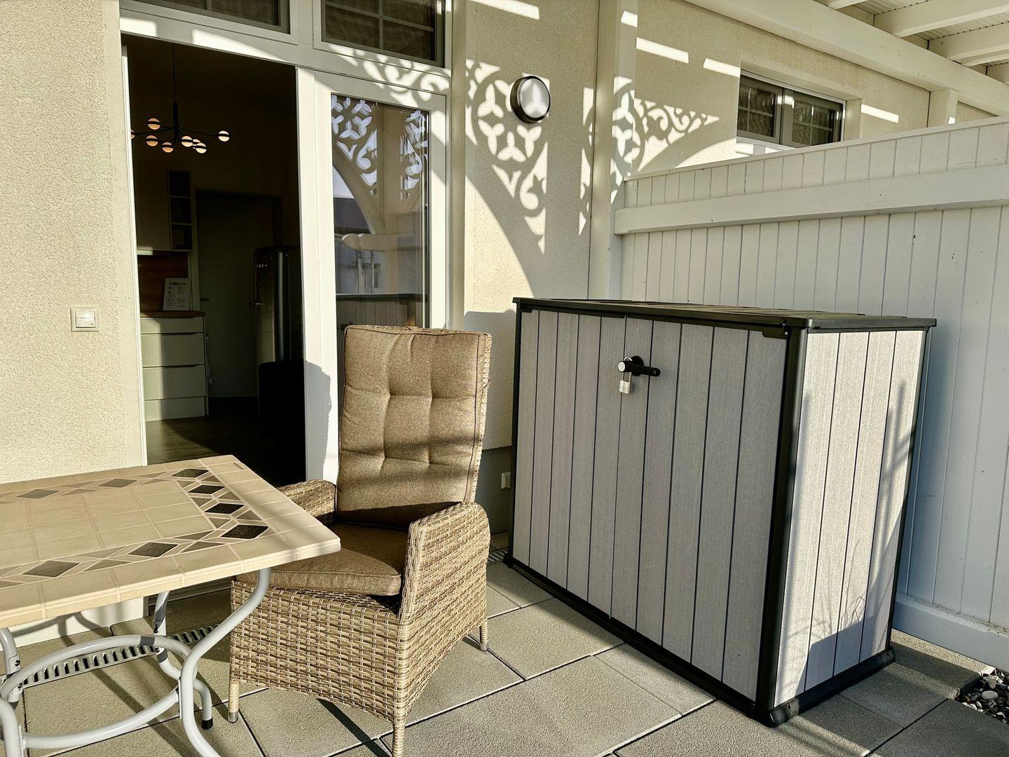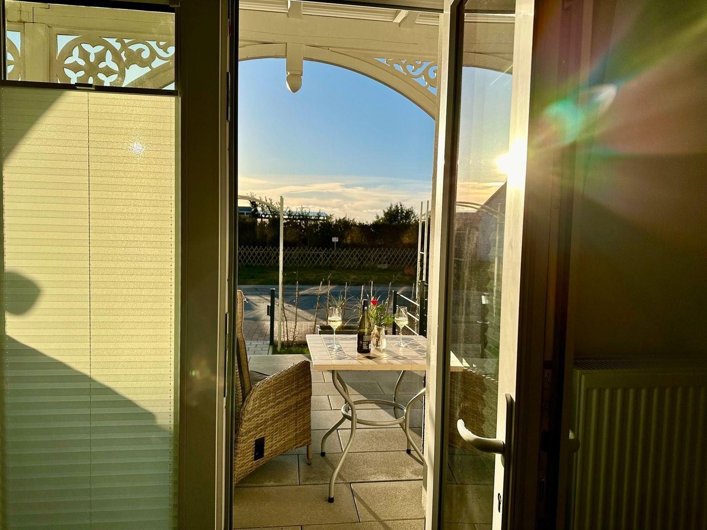 Die Wohnung gliedert sich in ein gemütliches Wohnzimmer mit integrierter Küche, ein Schlafzimmer für erholsame Nächte, ein innenliegendes Bad mit ebenerdiger Dusche für optimalen Komfort und einen kleinen Flur mit Garderobe. Ausgestattet mit großem Kühlschrank inklusive Eisfach, kostenfreiem Glasfaser-Internet für unterhaltsame Streaming-Abende und TV, sowie Plissees, Vorhängen und Fliegengittern, garantiert diese Ferienwohnung einen sorglosen Aufenthalt. Genießen Sie die Abendsonne auf der stilvoll gestalteten Terrasse, die Entspannung verspricht.