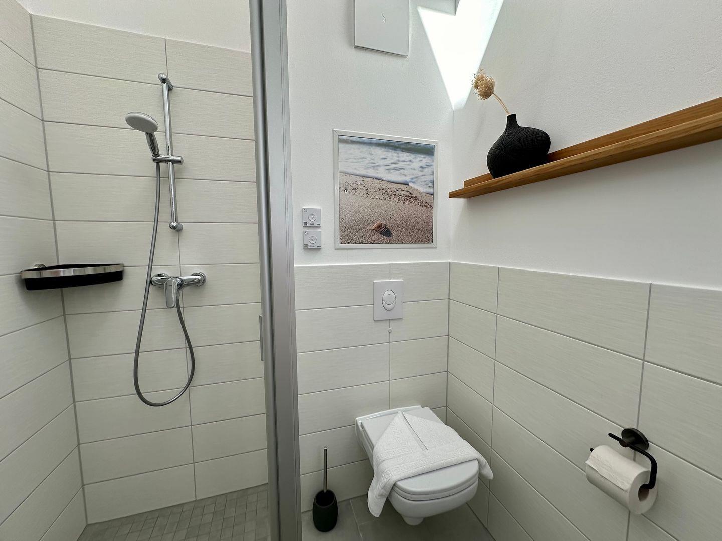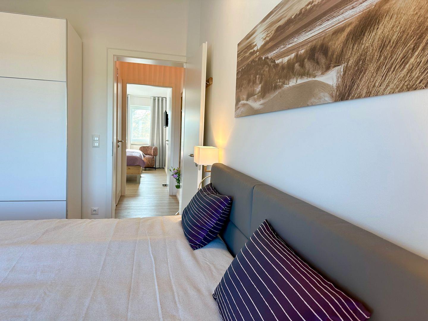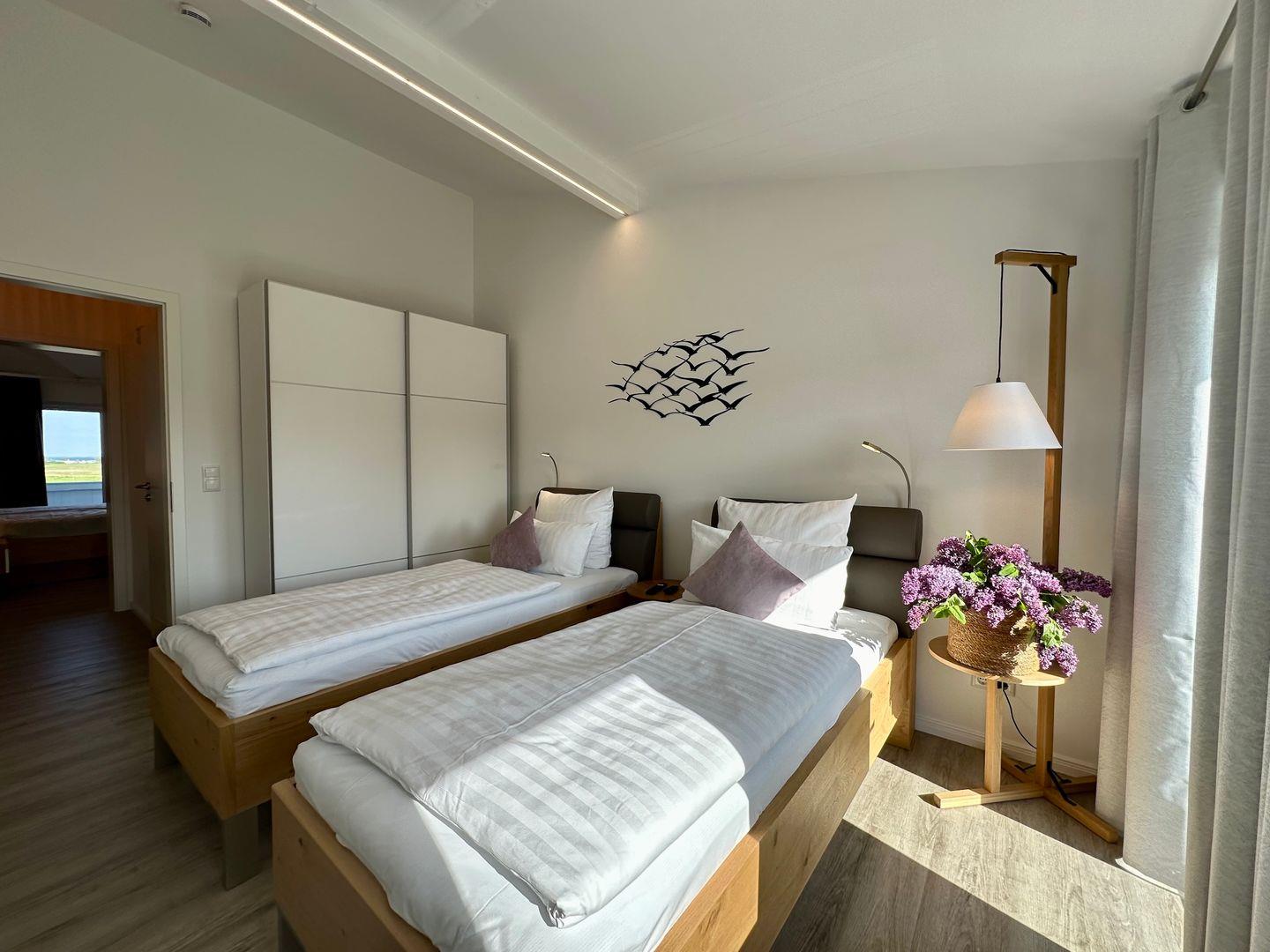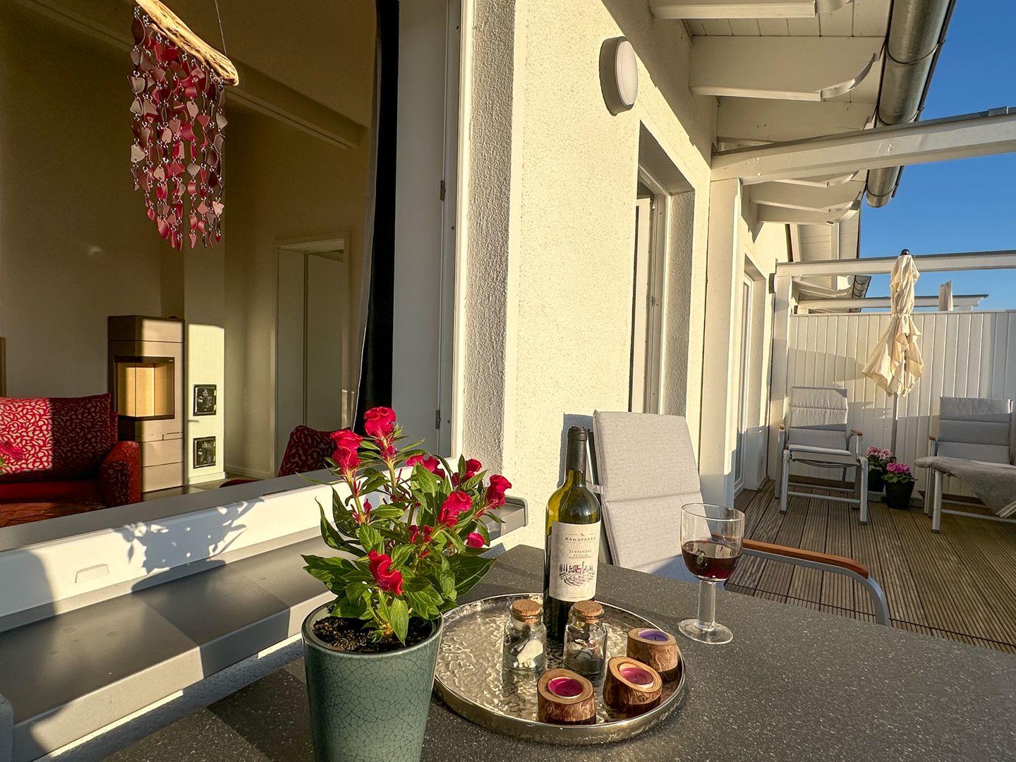 Diese gemütlich und komfortabel eingerichtete Ferienwohnung im Dachgeschoss verfügt über ein Wohnzimmer mit Kamin, ein Schlafzimmer mit Doppelbett ( ein Babyzustellbett ist möglich ), ein weiteres Schlafzimmer mit zwei Einzelbetten, zwei geschmackvolle Duschbäder mit Waschmaschine, eine Küche und einen großen Balkon. Im Wohnbereich bietet die ausklappbare Couch Schlafmöglichkeiten für zwei weitere Personen.