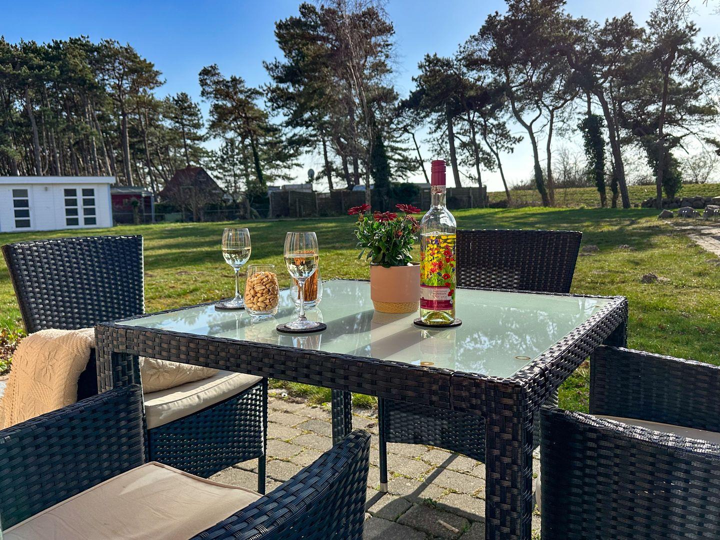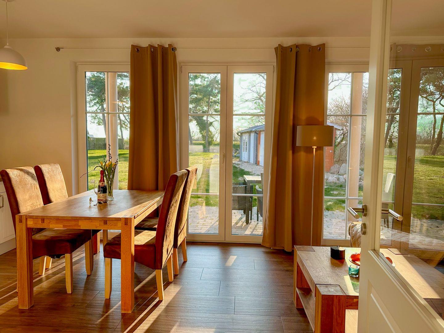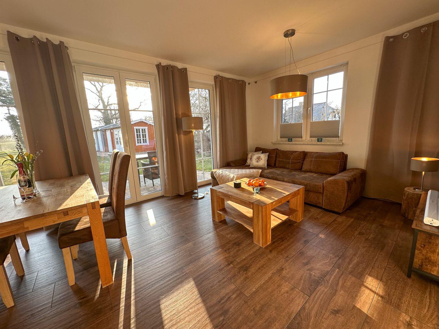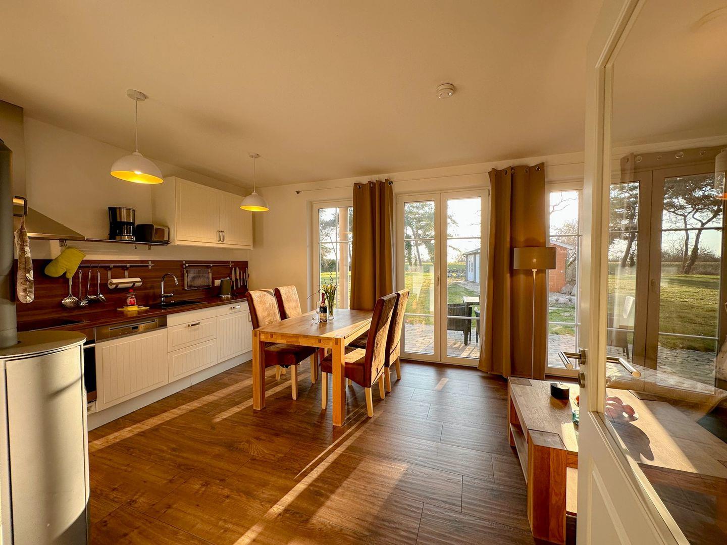Der großzügige Wohn-/Essbereich verfügt über eine moderne und komplett ausgestattete Küchenzeile mit 4 Zonen-Ceranfeld und Backofen , Geschirrspüler, Kühlschrank mit Gefrierfach, Mikrowelle, Wasserkocher, Toaster, Kaffeemaschine sowie diversen Küchenutensilien. Angrenzend befindet sich ein Esstisch mit vier Stühlen. Der gemütliche Wohnbereich mit Gartenblick bietet Platz für die gesamte Familie. Angrenzend erreichen Sie die großzügige Terrasse. Ein Tisch mit vier Stühlen und ein Sonnenschirm laden zum Verweilen ein.