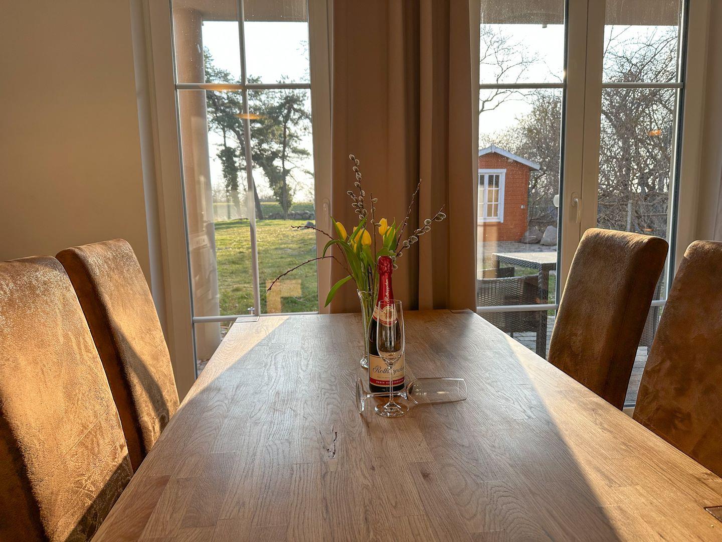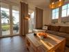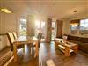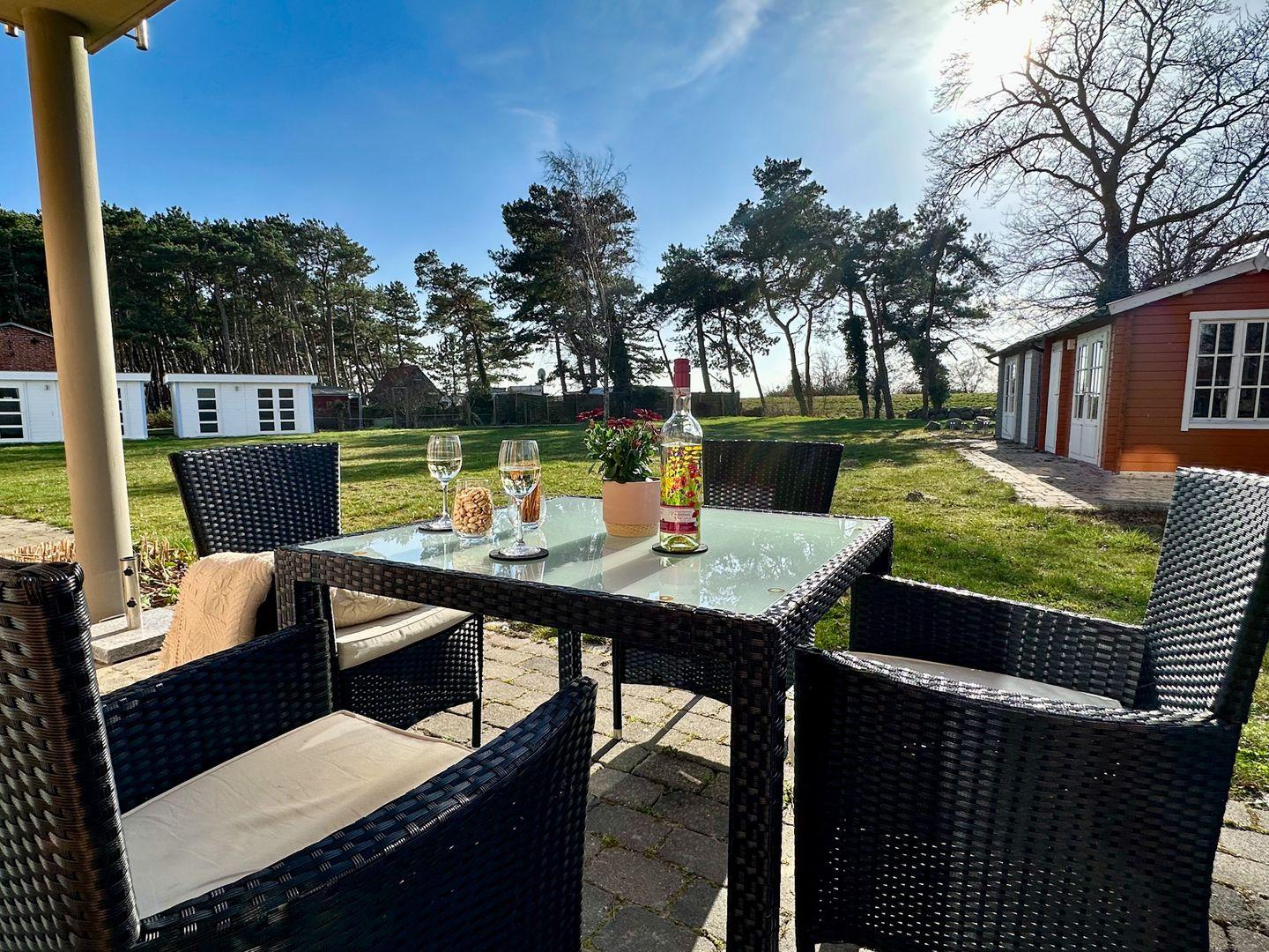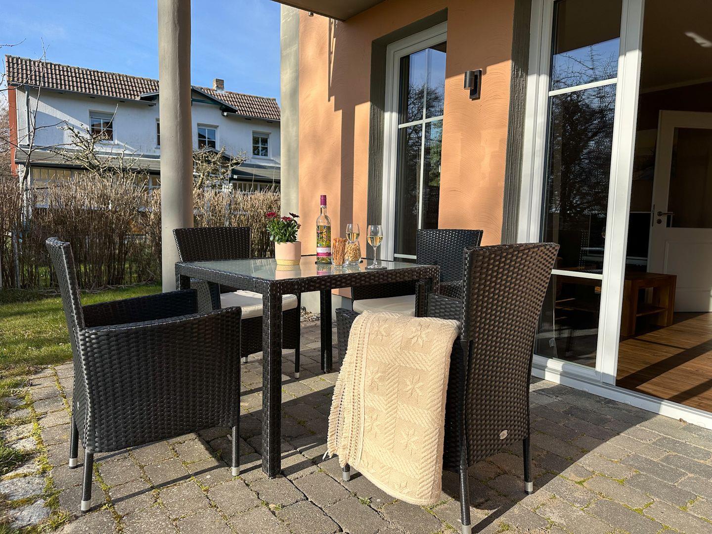 Der großzügige Wohn-/Essbereich verfügt über eine moderne und komplett ausgestattete Küchenzeile mit 4 Zonen-Ceranfeld und Backofen , Geschirrspüler, Kühlschrank mit Gefrierfach, Mikrowelle, Wasserkocher, Toaster, Kaffeemaschine sowie diversen Küchenutensilien. Angrenzend befindet sich ein Esstisch mit vier Stühlen. Der gemütliche Wohnbereich mit Gartenblick bietet Platz für die gesamte Familie. Angrenzend erreichen Sie die großzügige Terrasse. Ein Tisch mit vier Stühlen und ein Sonnenschirm laden zum Verweilen ein.