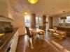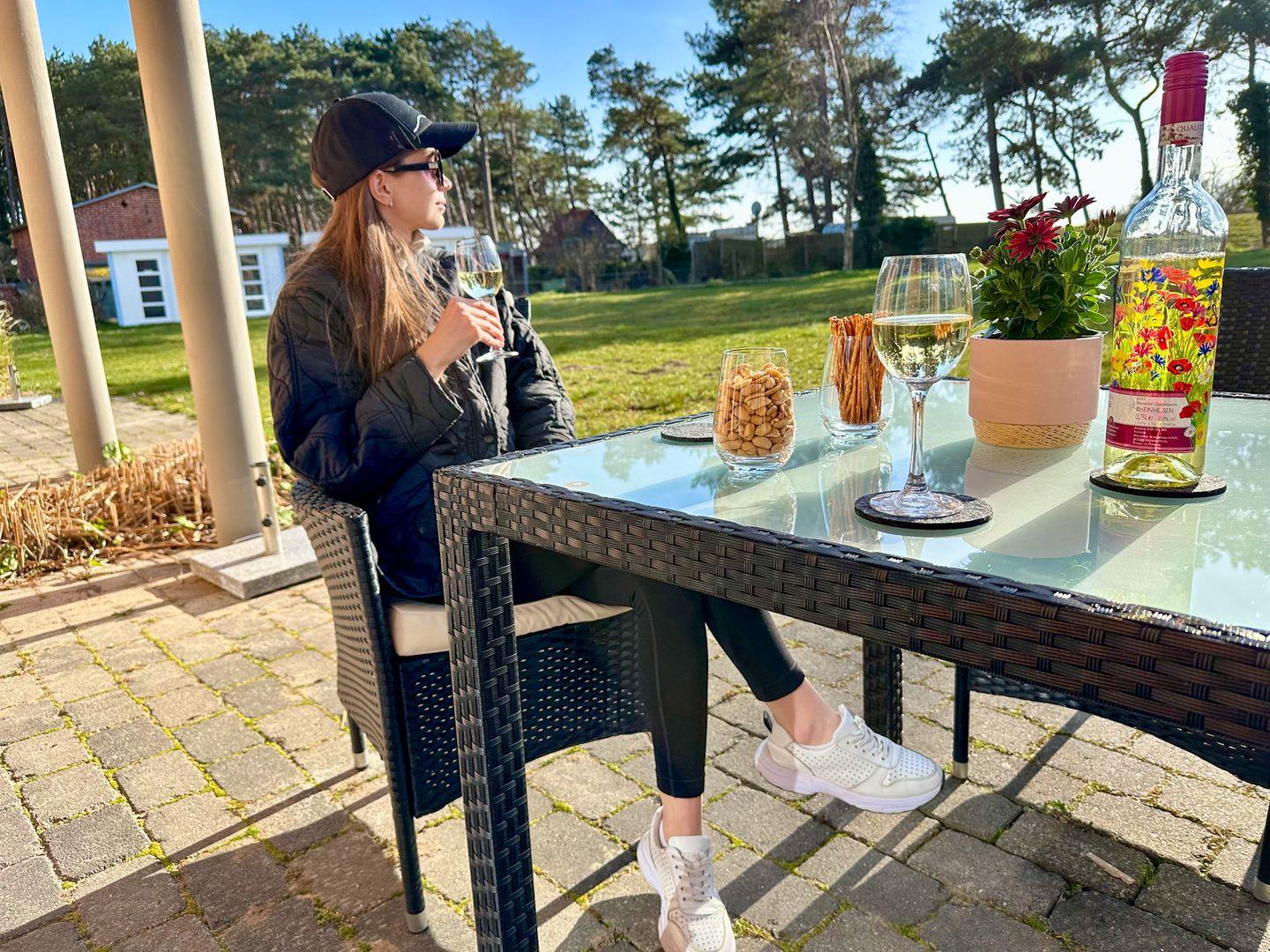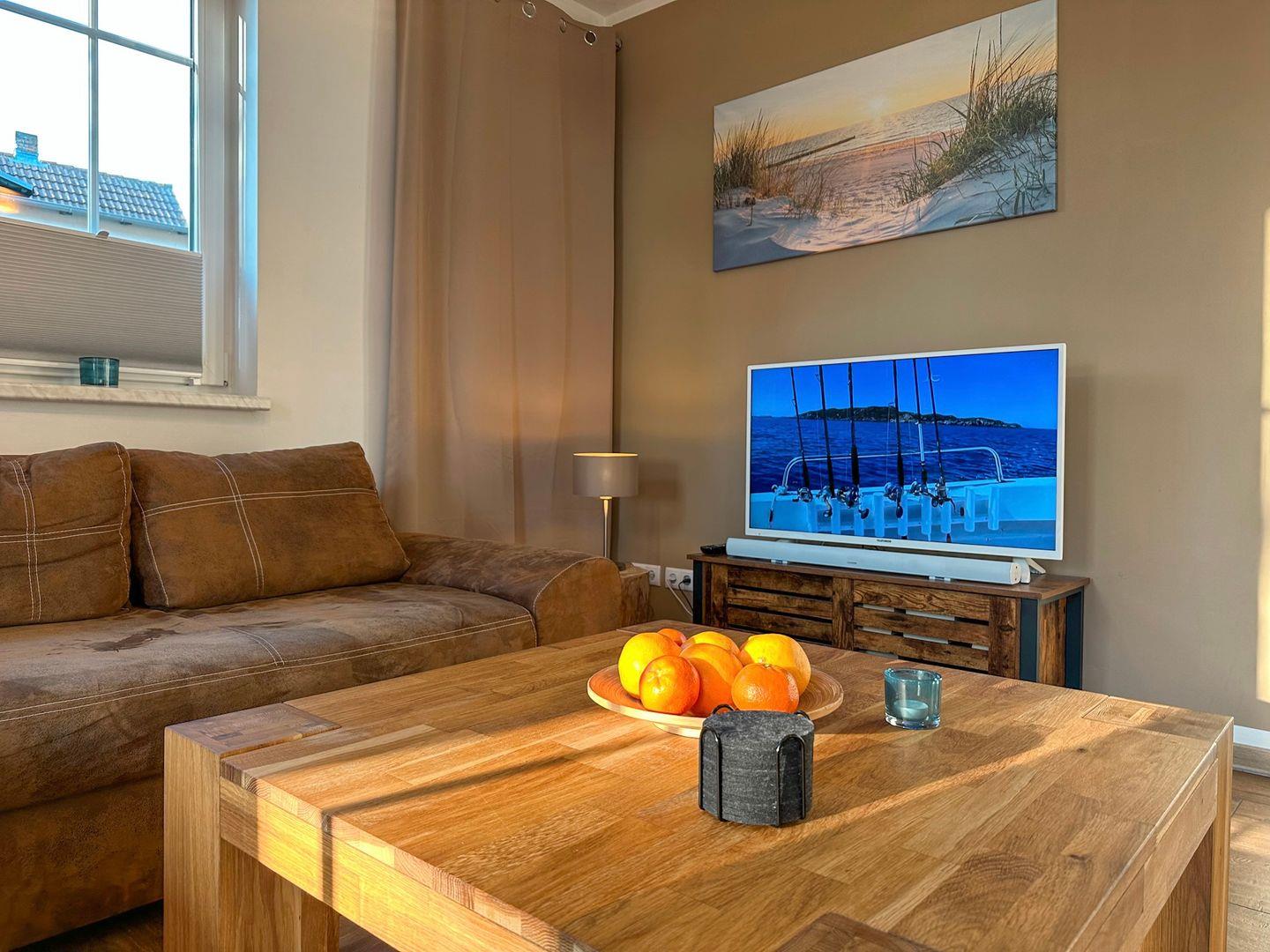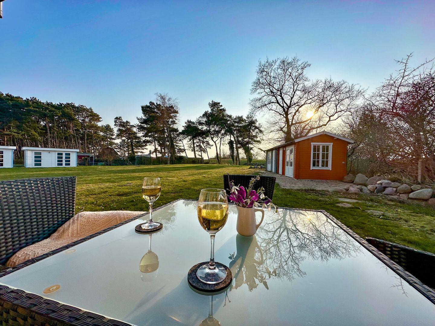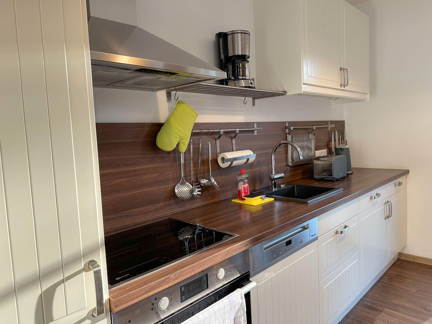 Der großzügige Wohn-/Essbereich verfügt über eine moderne und komplett ausgestattete Küchenzeile mit 4 Zonen-Ceranfeld und Backofen , Geschirrspüler, Kühlschrank mit Gefrierfach, Mikrowelle, Wasserkocher, Toaster, Kaffeemaschine sowie diversen Küchenutensilien. Angrenzend befindet sich ein Esstisch mit vier Stühlen. Der gemütliche Wohnbereich mit Gartenblick bietet Platz für die gesamte Familie. Angrenzend erreichen Sie die großzügige Terrasse. Ein Tisch mit vier Stühlen und ein Sonnenschirm laden zum Verweilen ein.